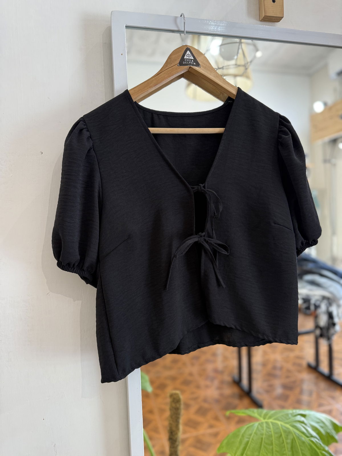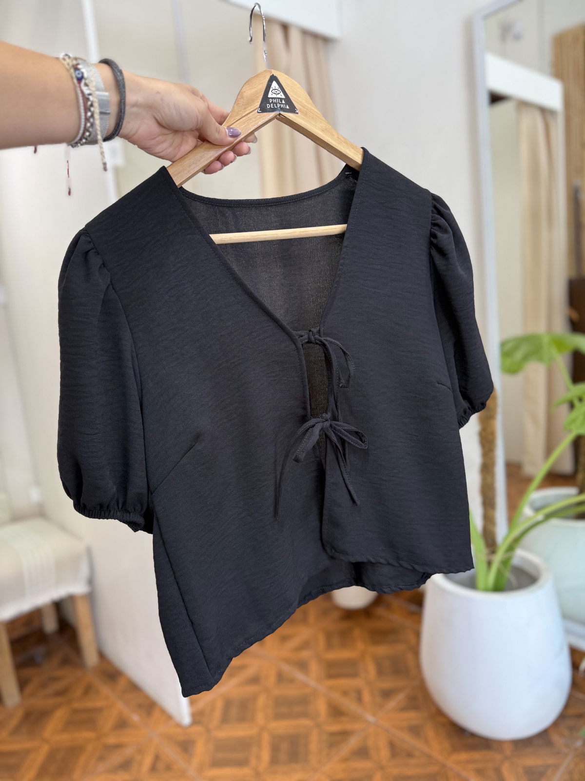 Hermosa blusa con manguitas princesas, y tiras en la delantera para cerrar. Confeccionada en crep.