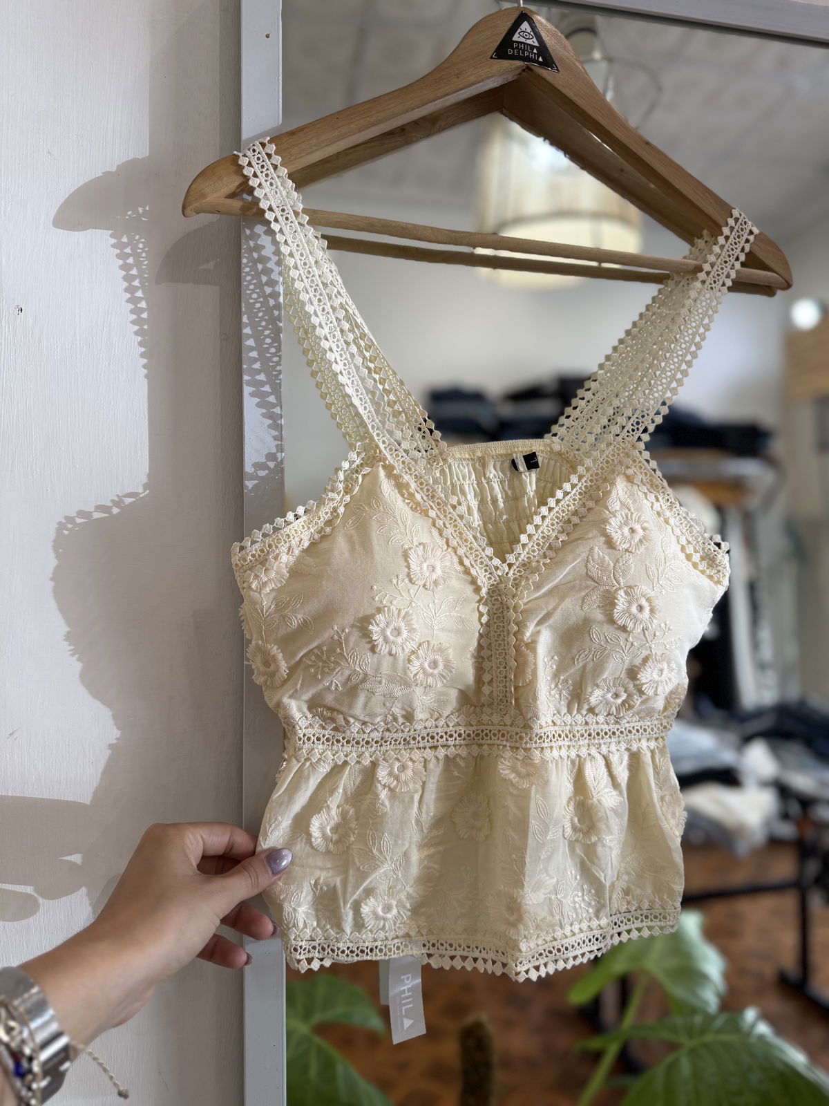 Blusa de broderie color natural con detalle de flores en relieve al frente super mega delicada. Breteles con broderie, espalda tipo "repollito" que lo hace adaptable a mas de un solo talle. Viene con tazas incorporadas.