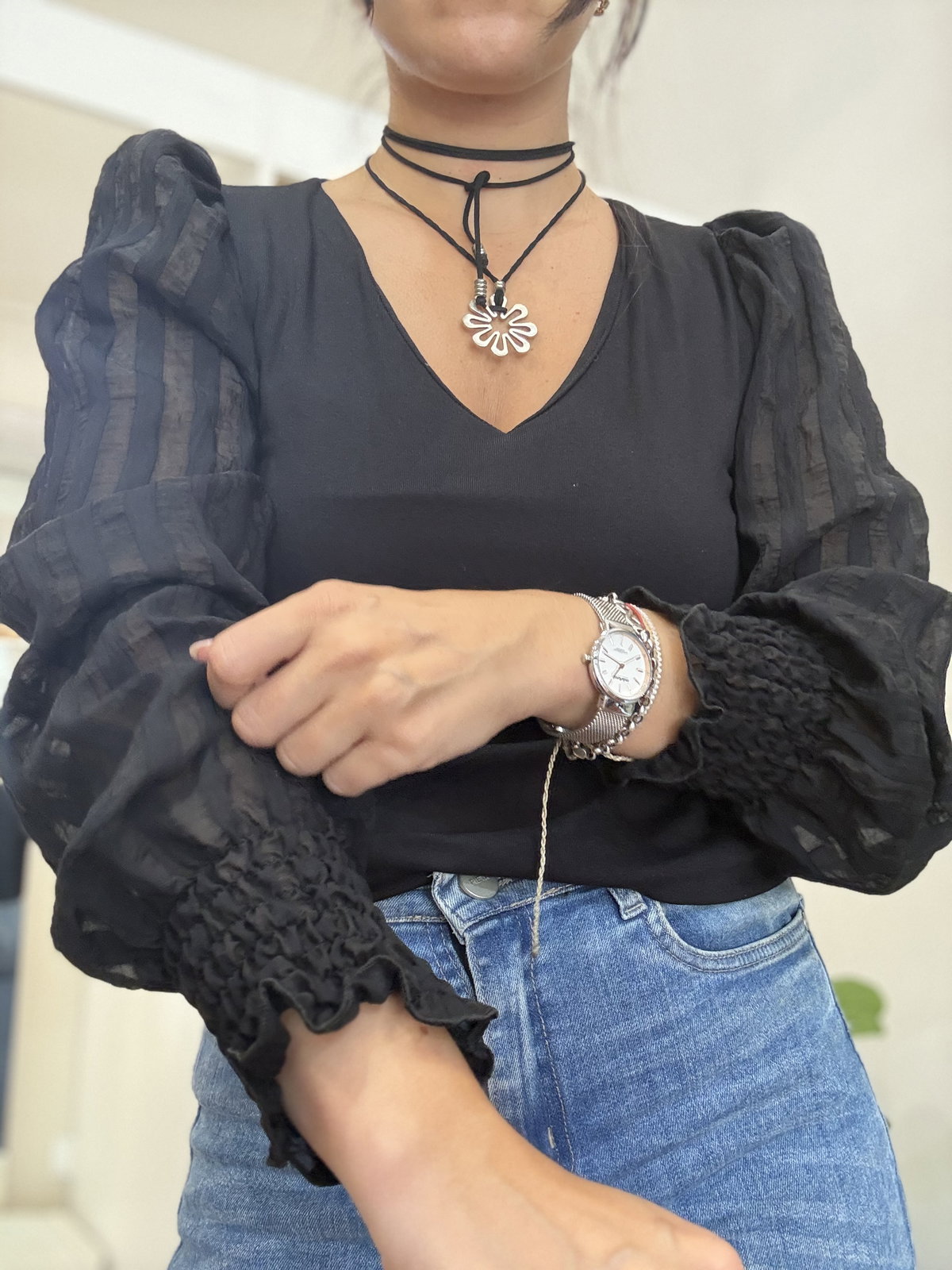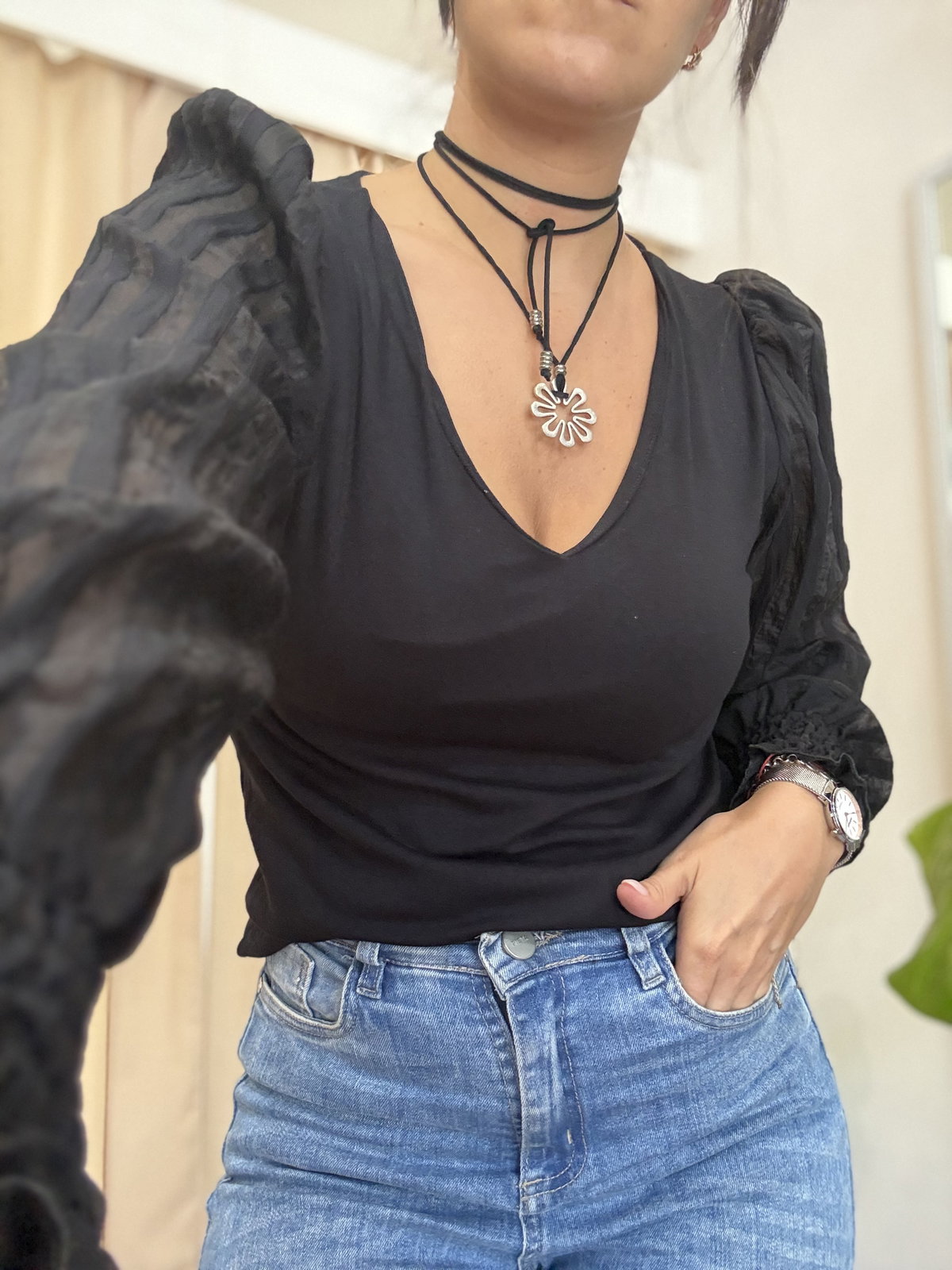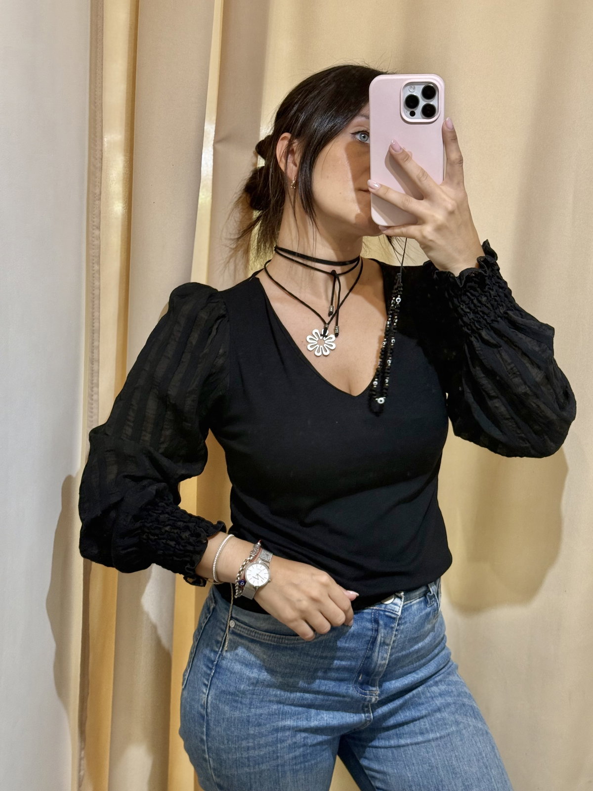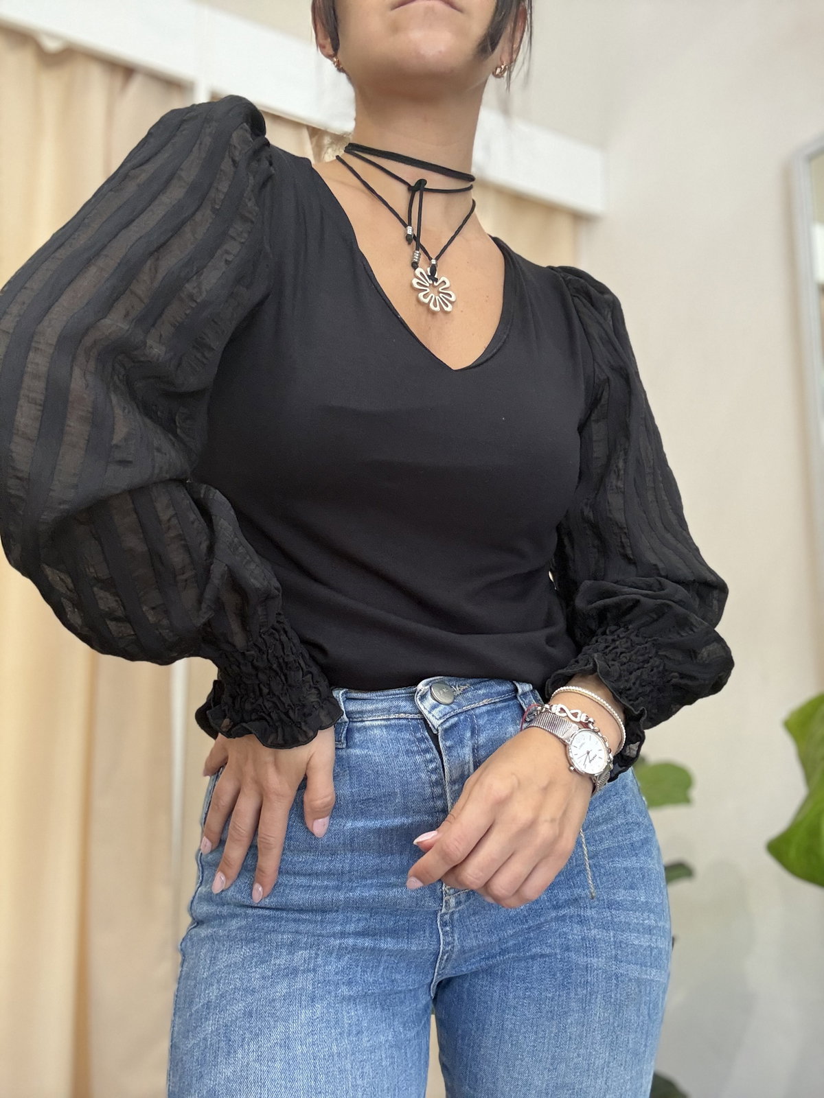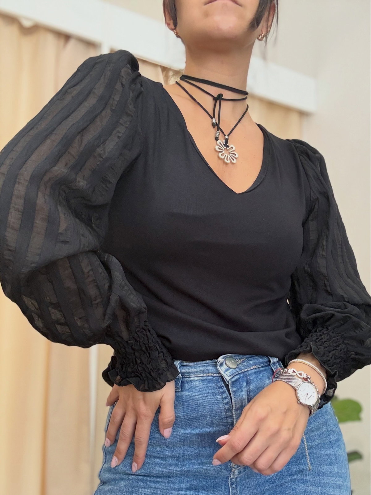 Hermosa blusa con mangas combinadas en microtul, un básico con toque romántico que vas a amar.