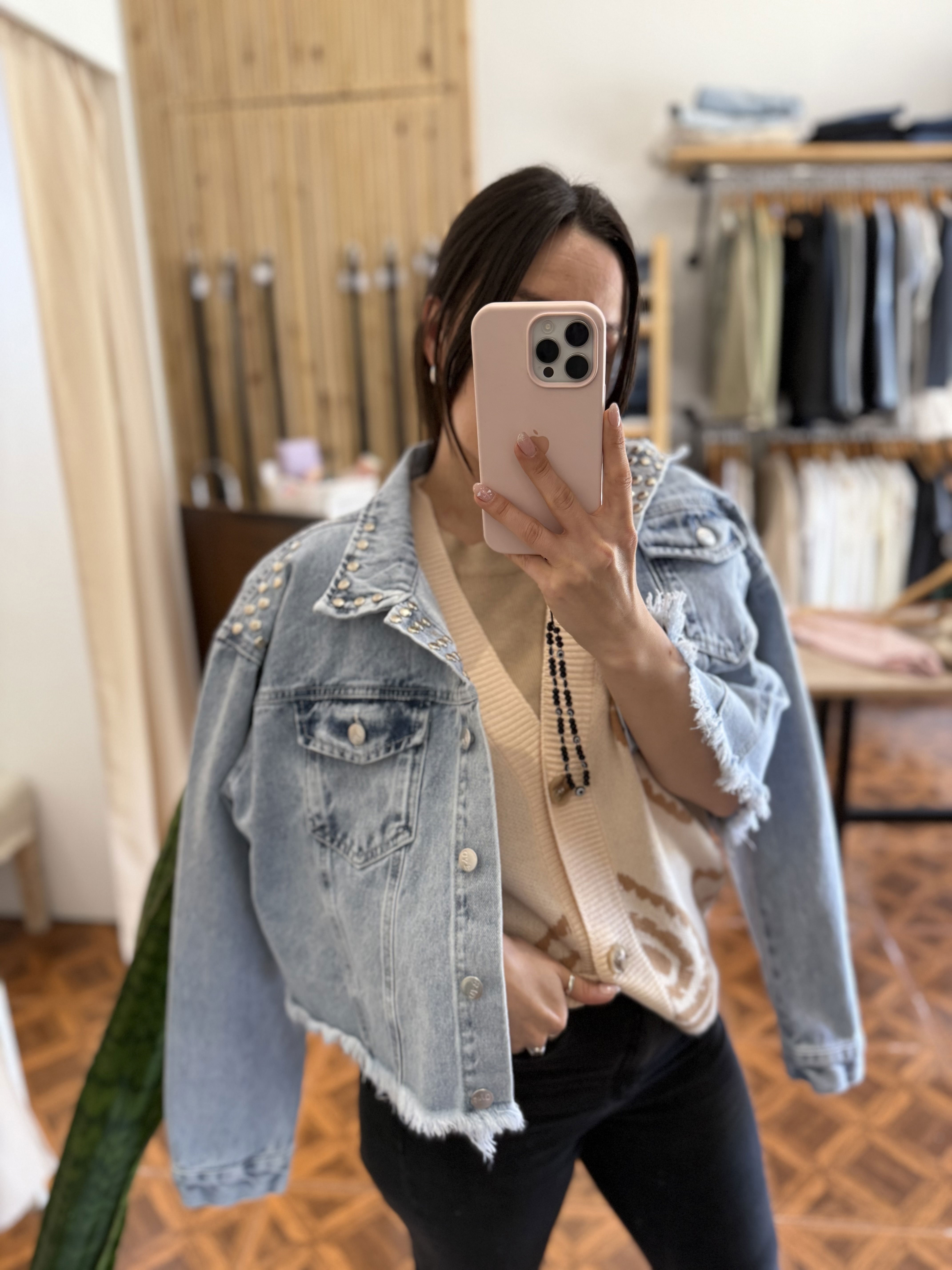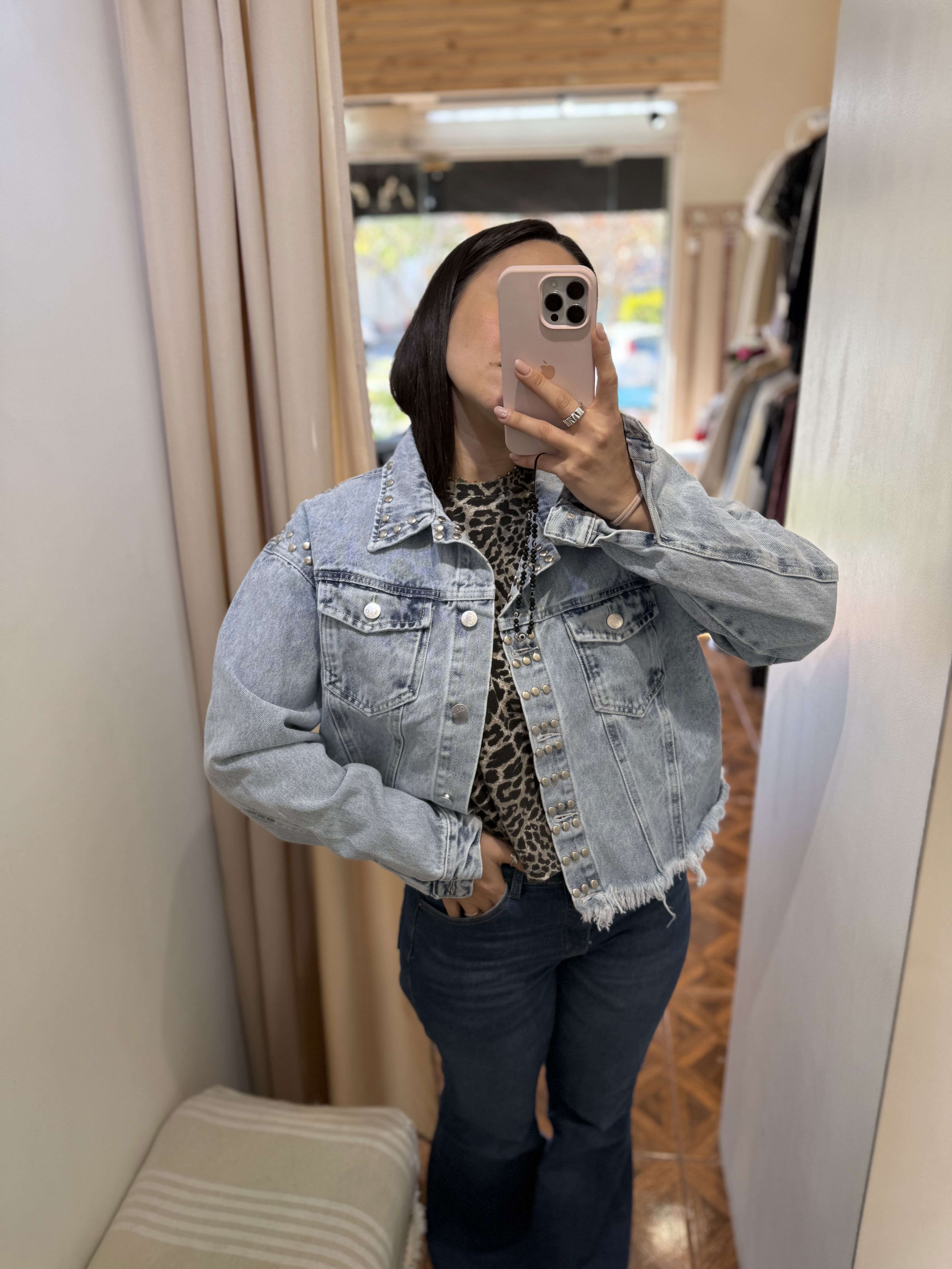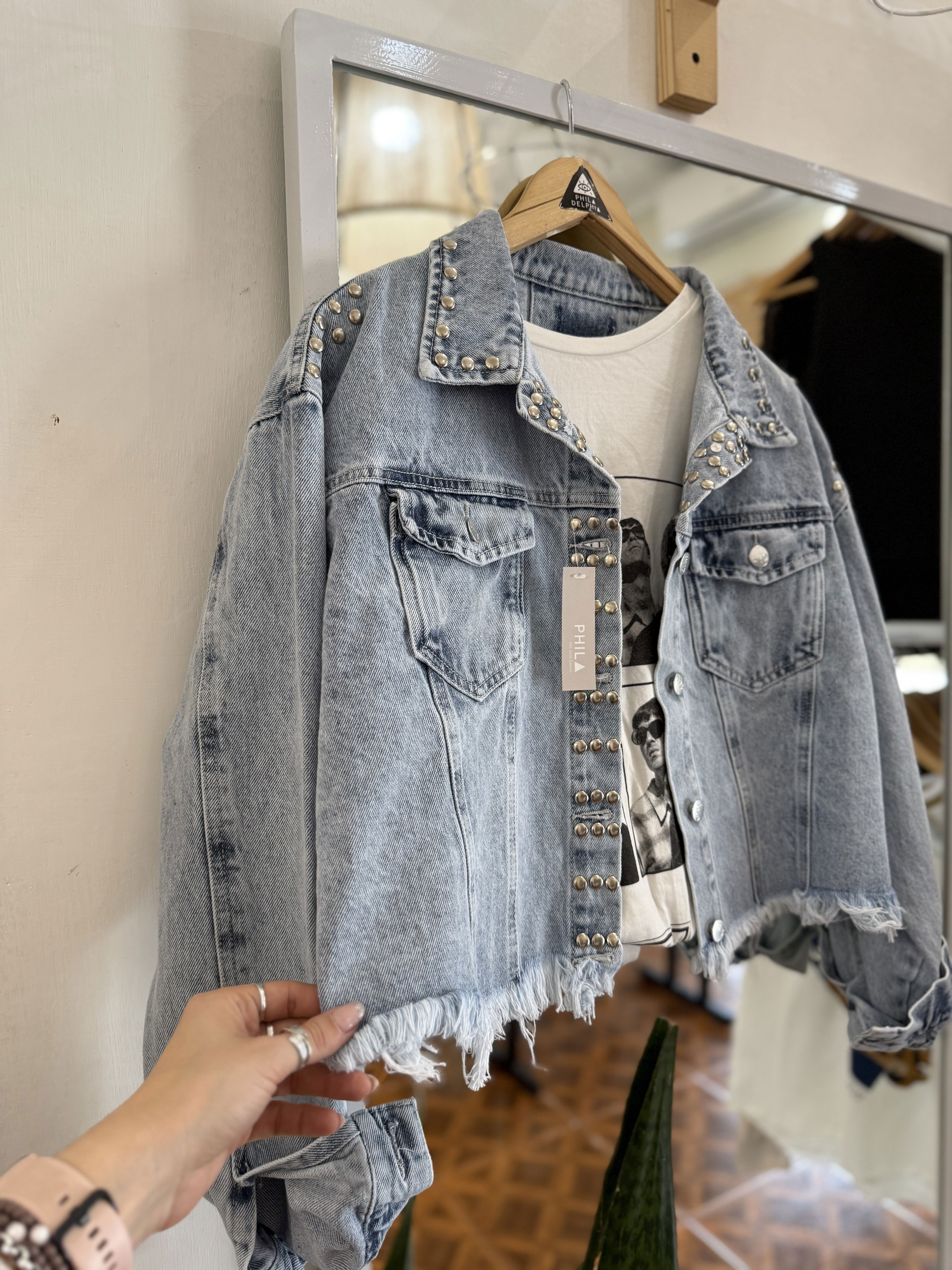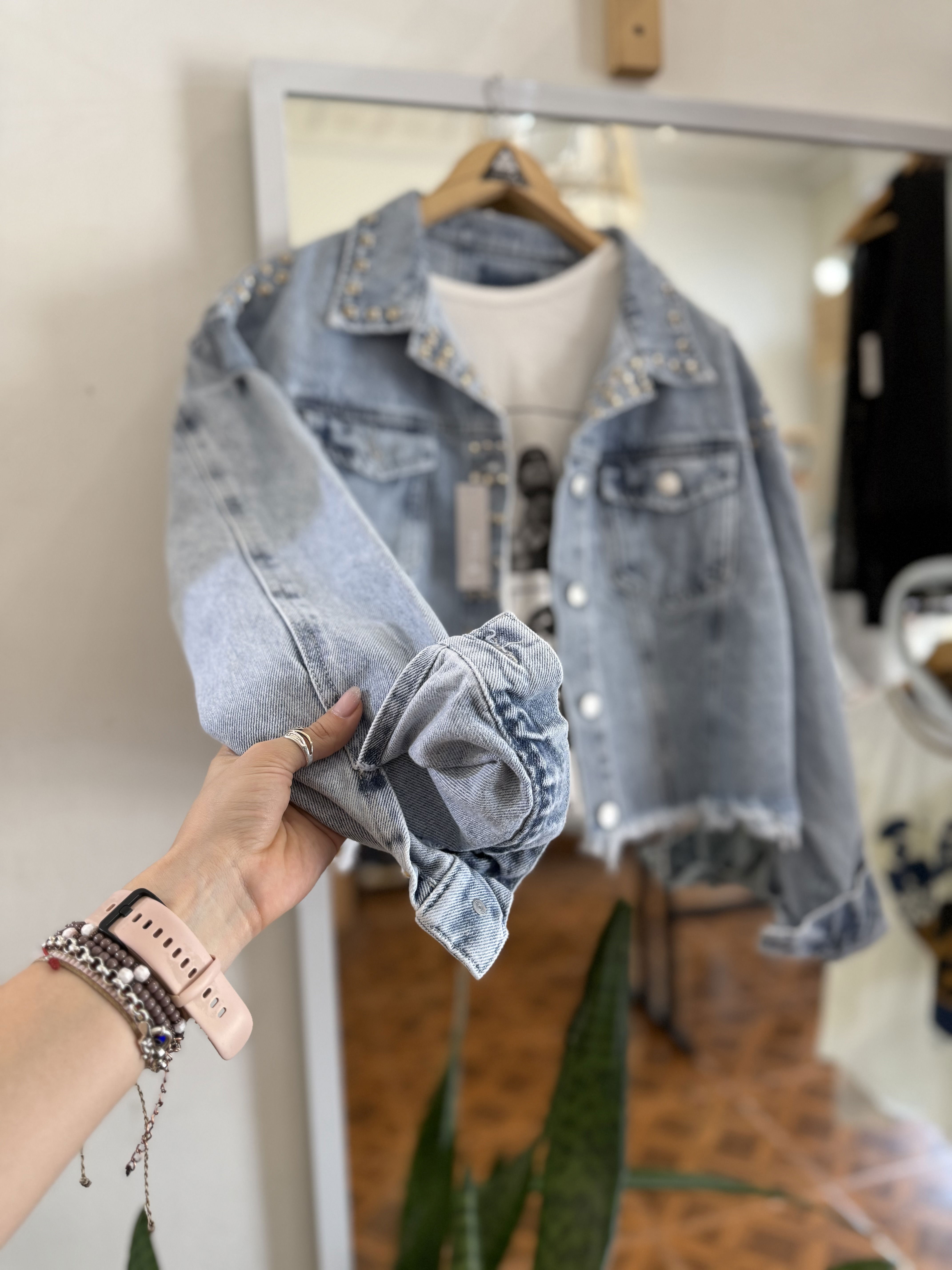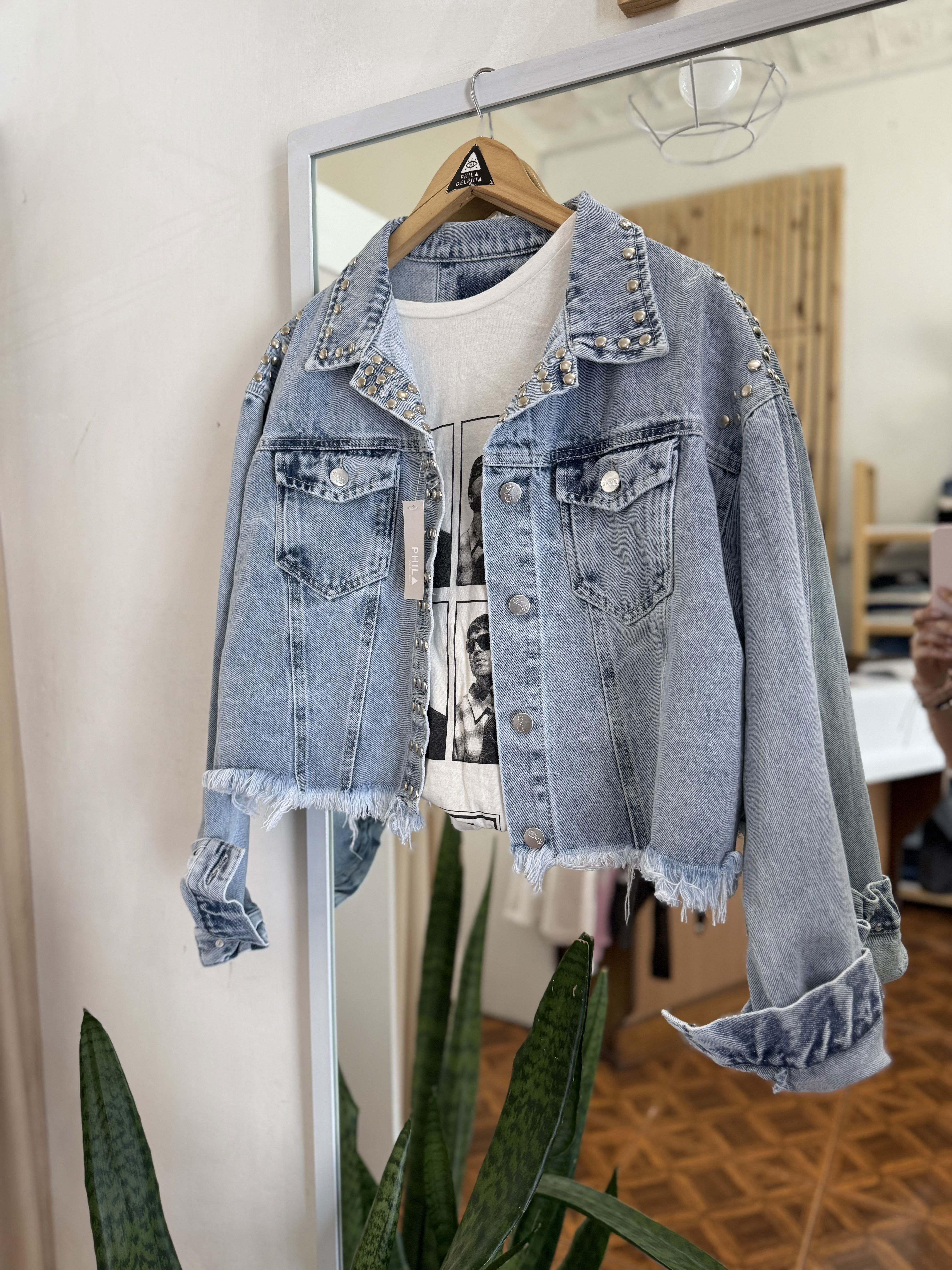 Hermosa chaqueta de Jean con detalles de tachas al frente. Jean clarito, corte retro ancho.
