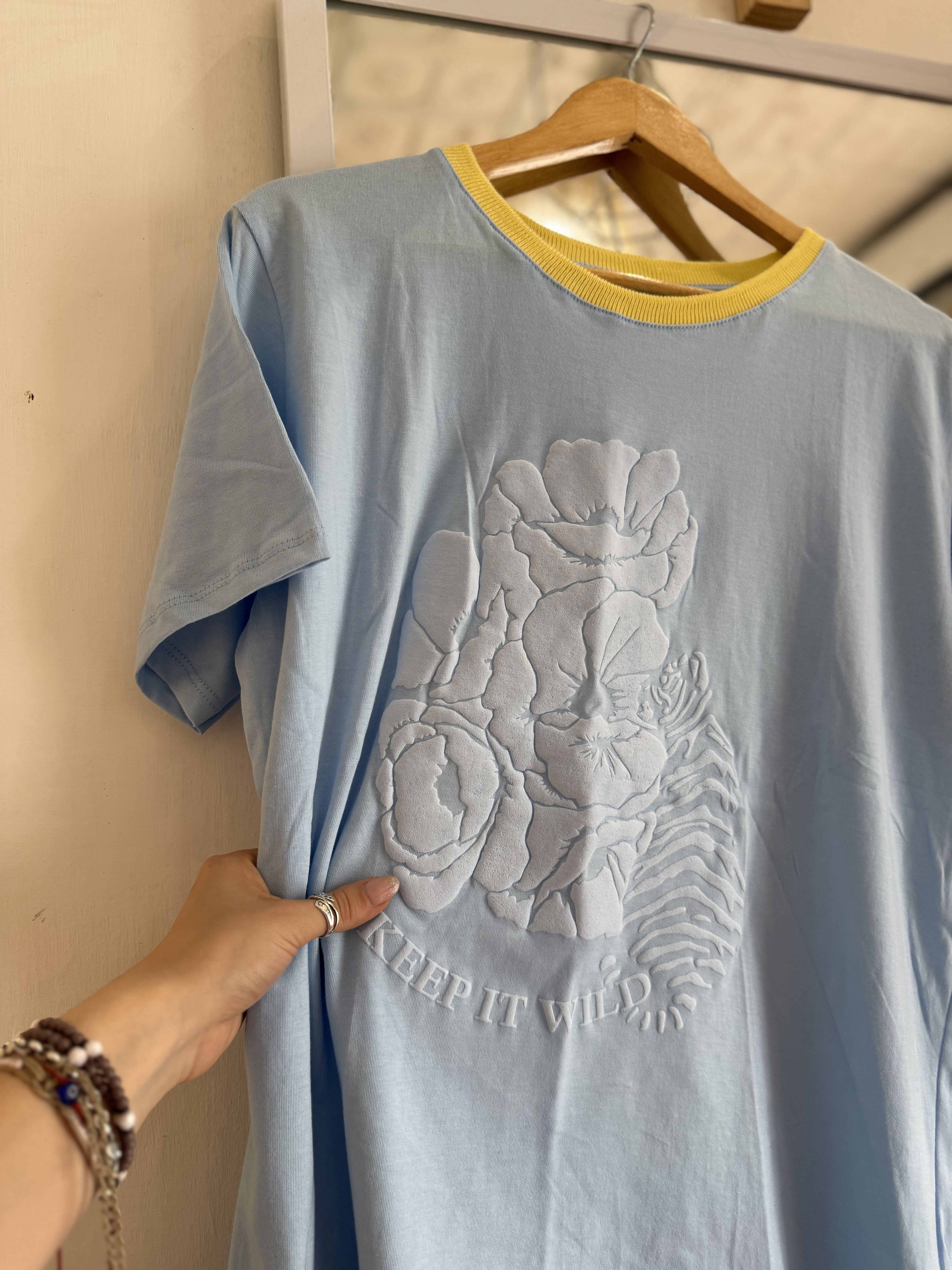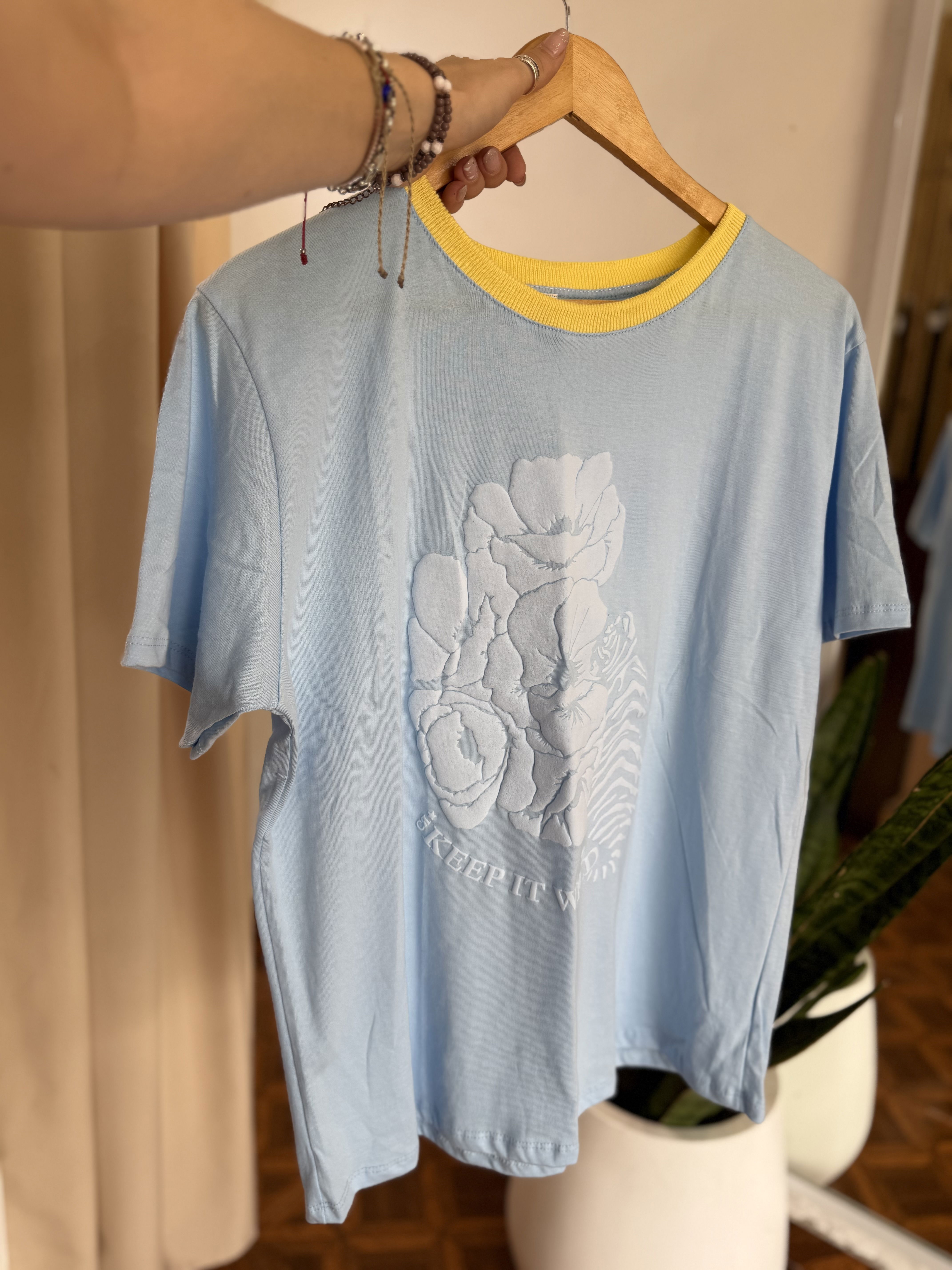Remera de algodón con estampa EN RELIEVE y cuello combinado, divinas !
