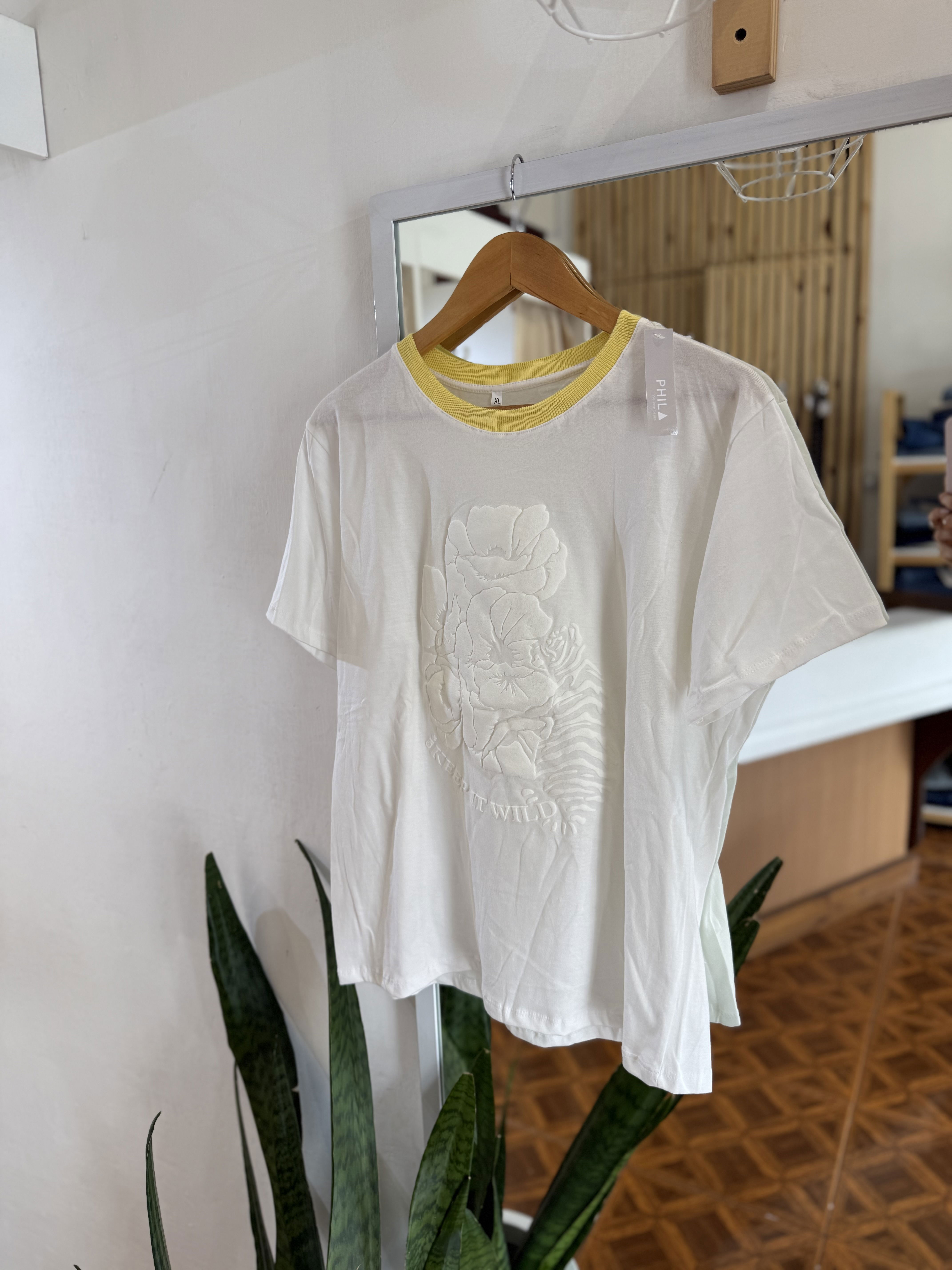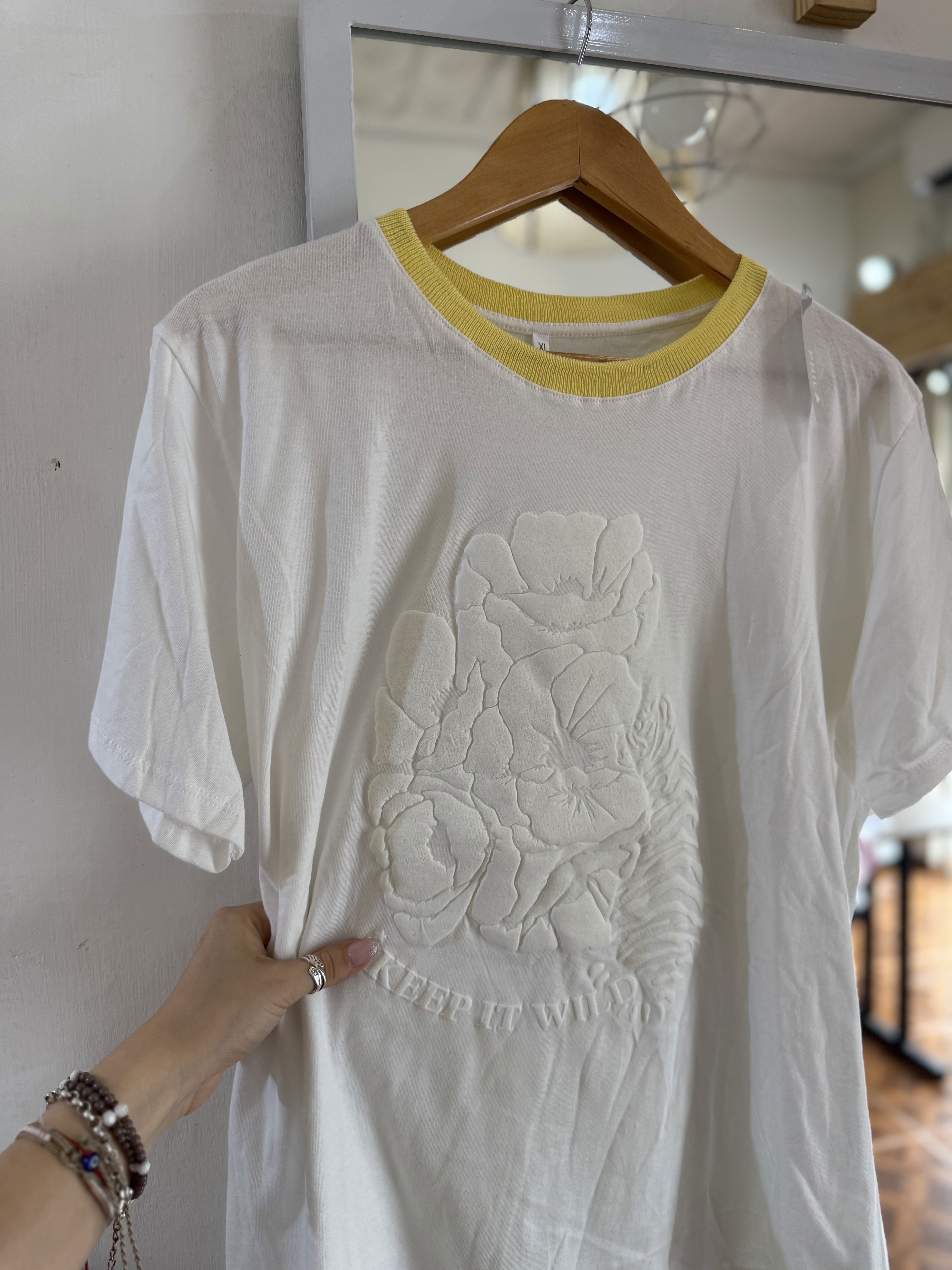 Remera de algodón con estampa EN RELIEVE y cuello combinado, divinas !