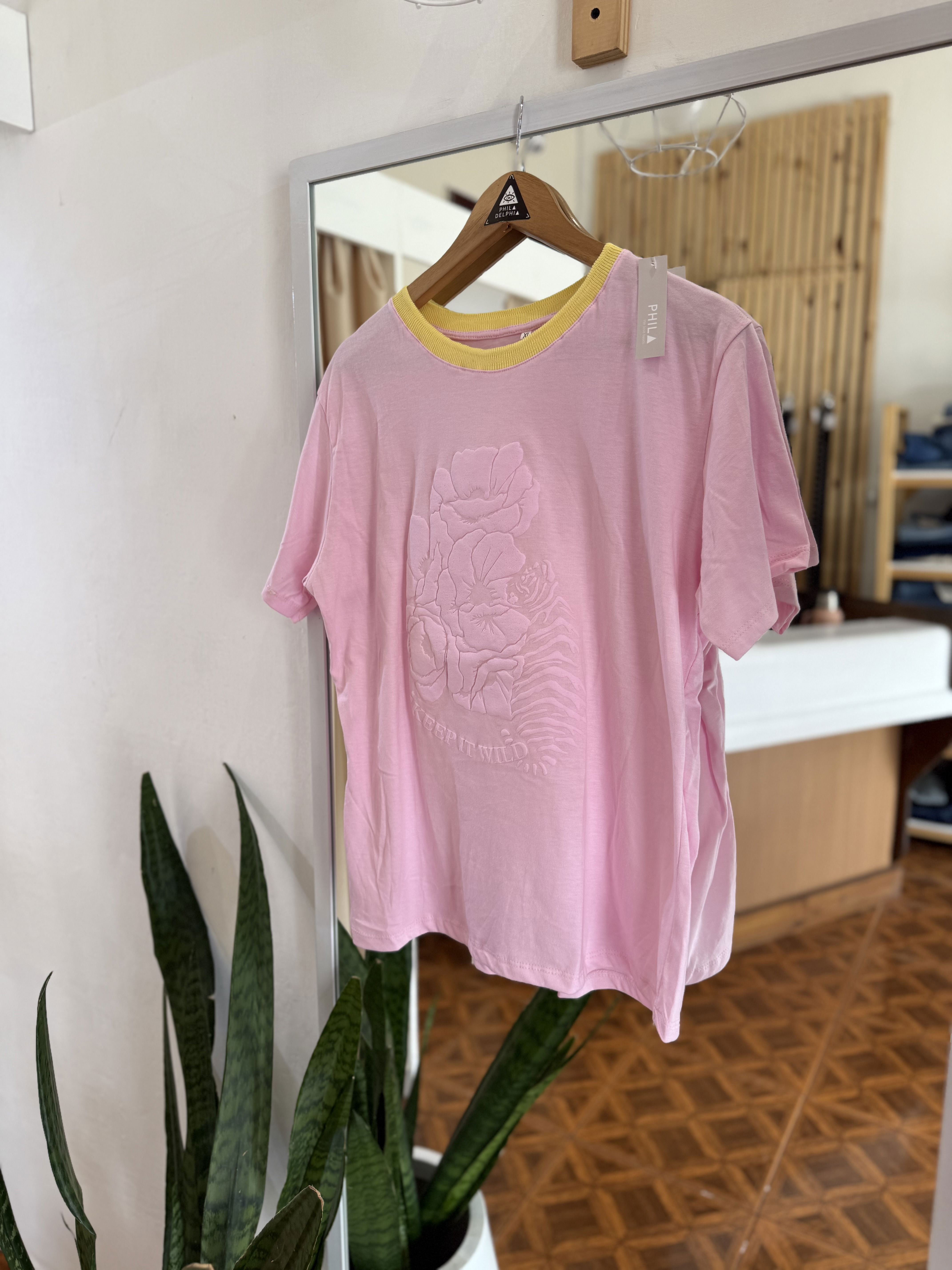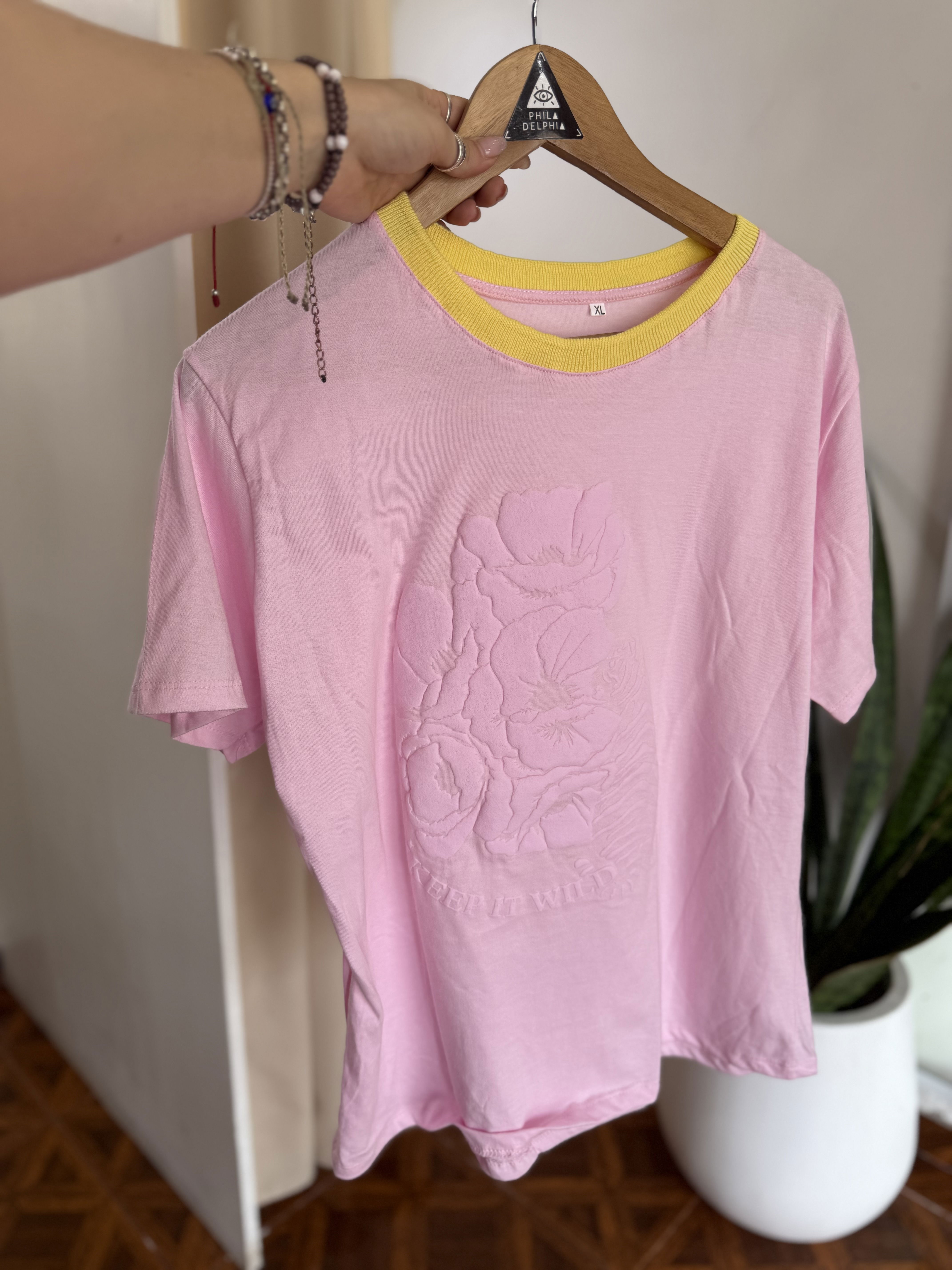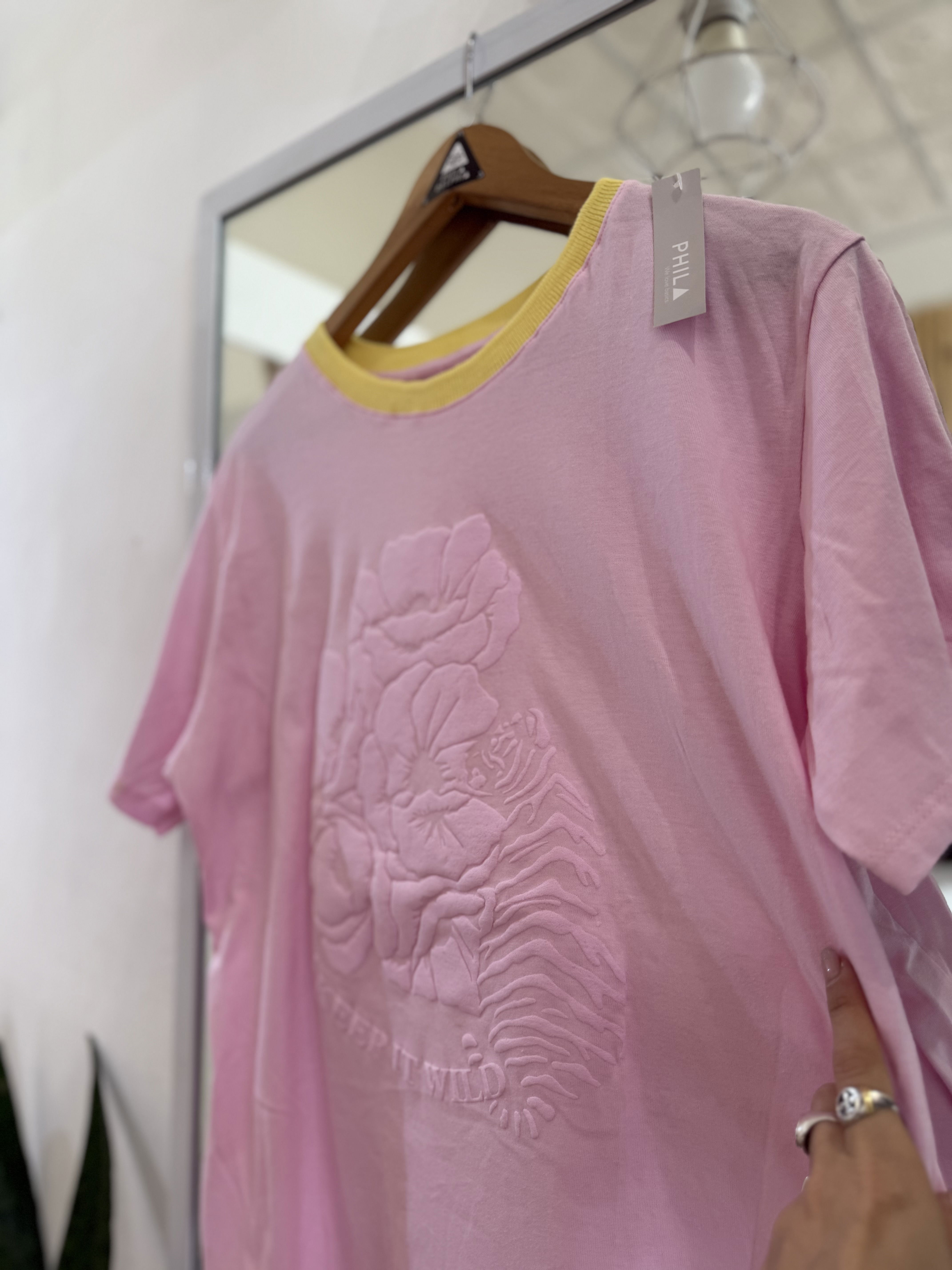 Remera de algodón con estampa EN RELIEVE y cuello combinado, divinas !