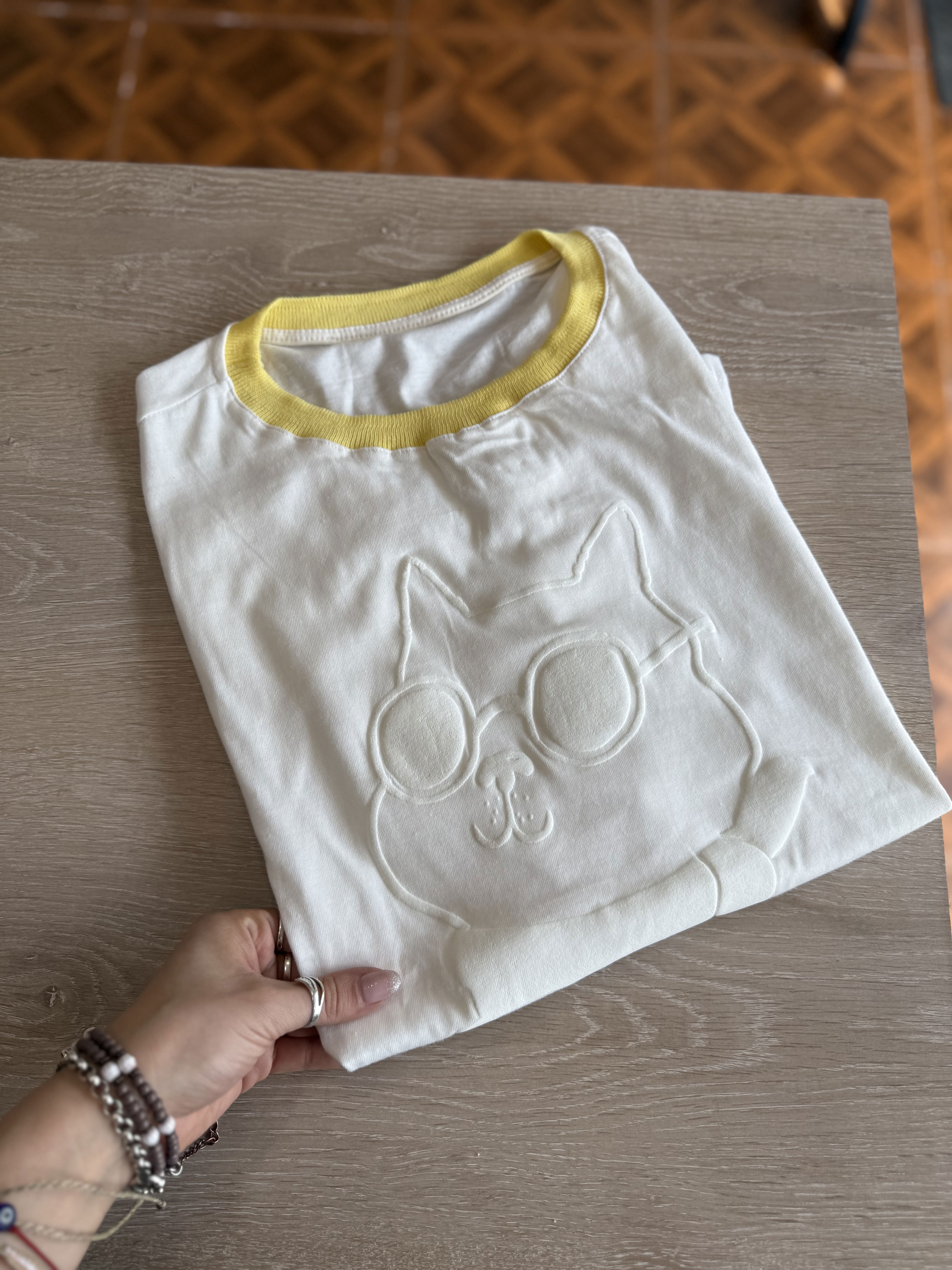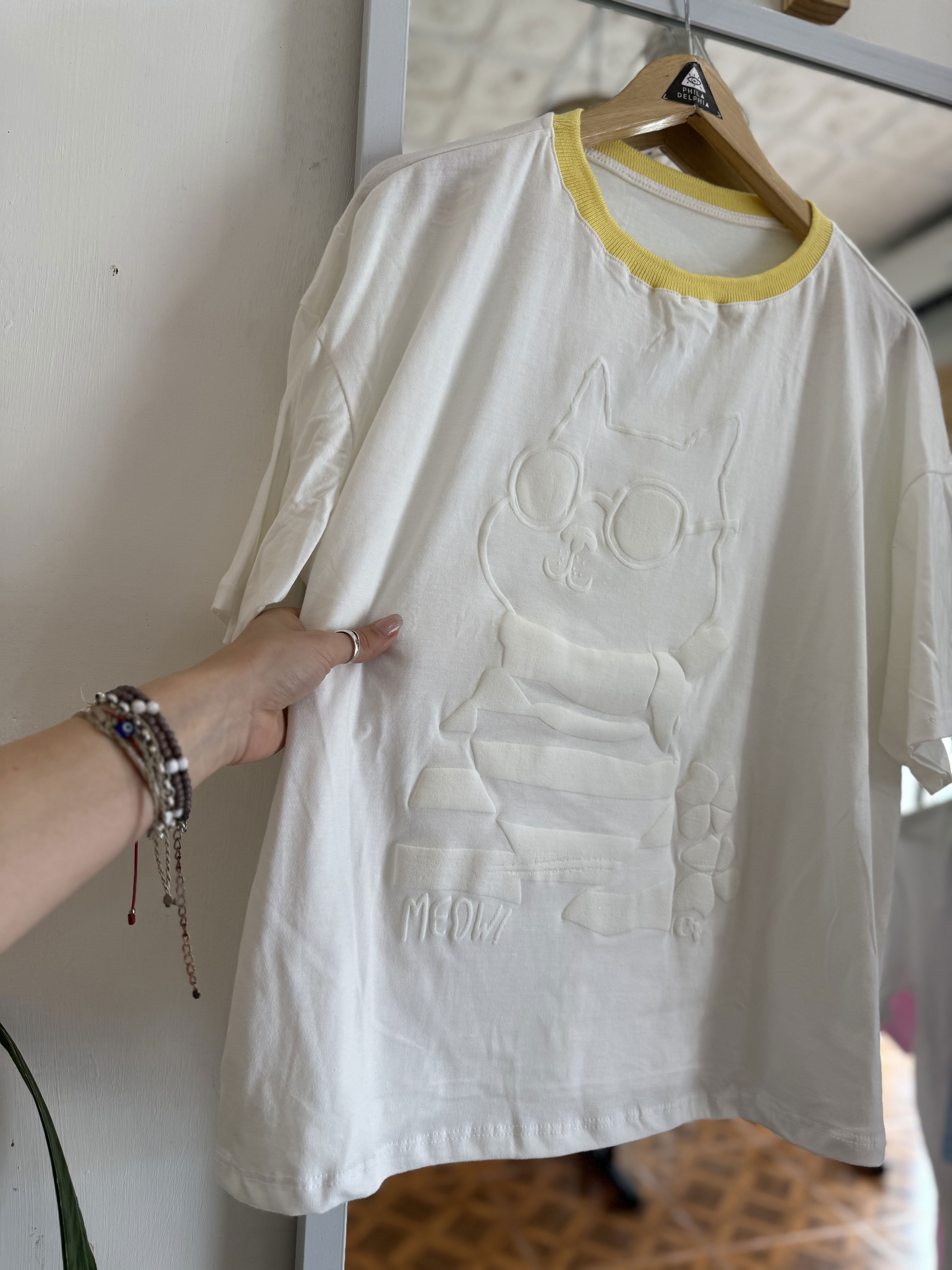Remera de algodón con estampa EN RELIEVE y cuello combinado, divinas !