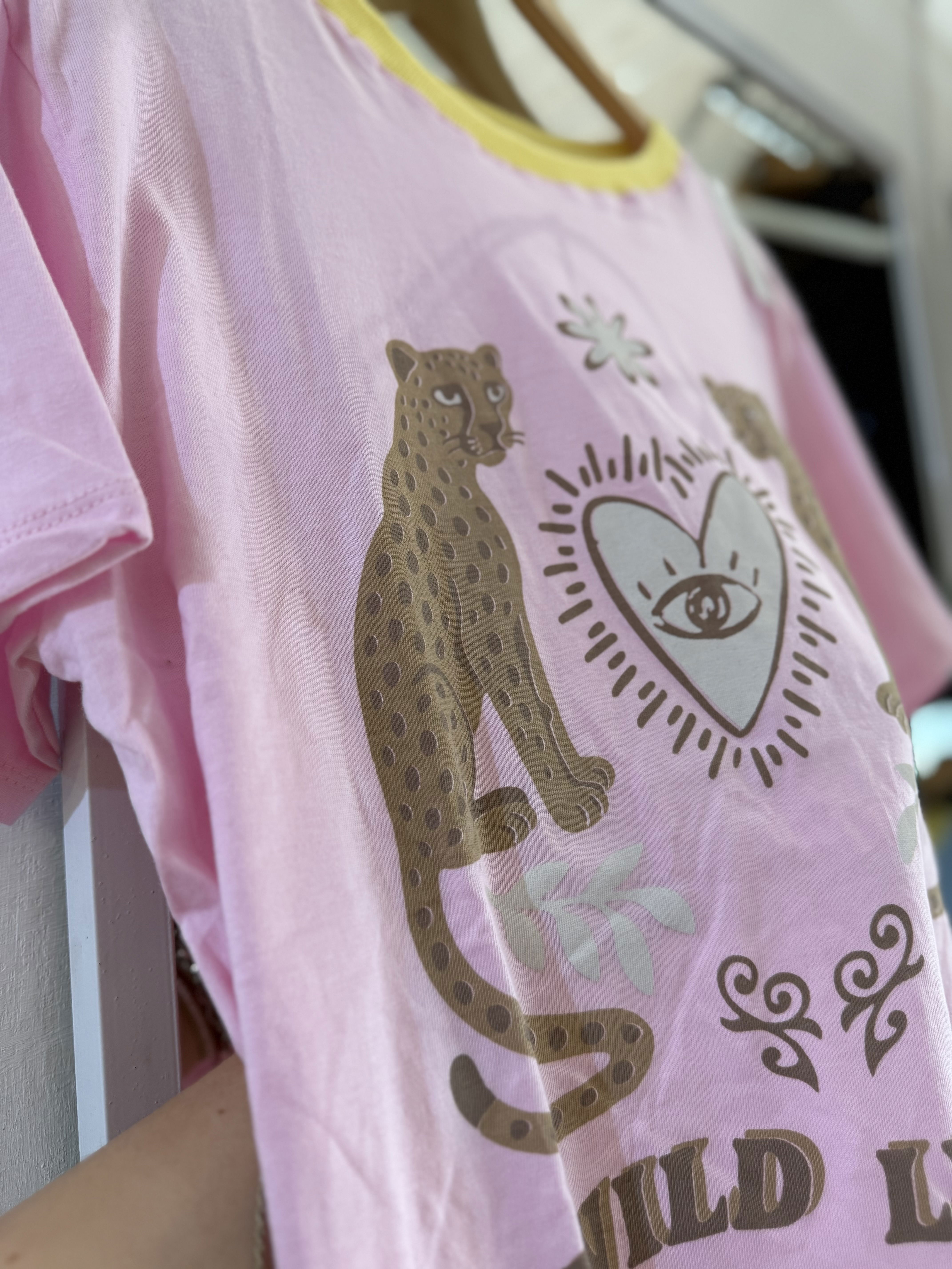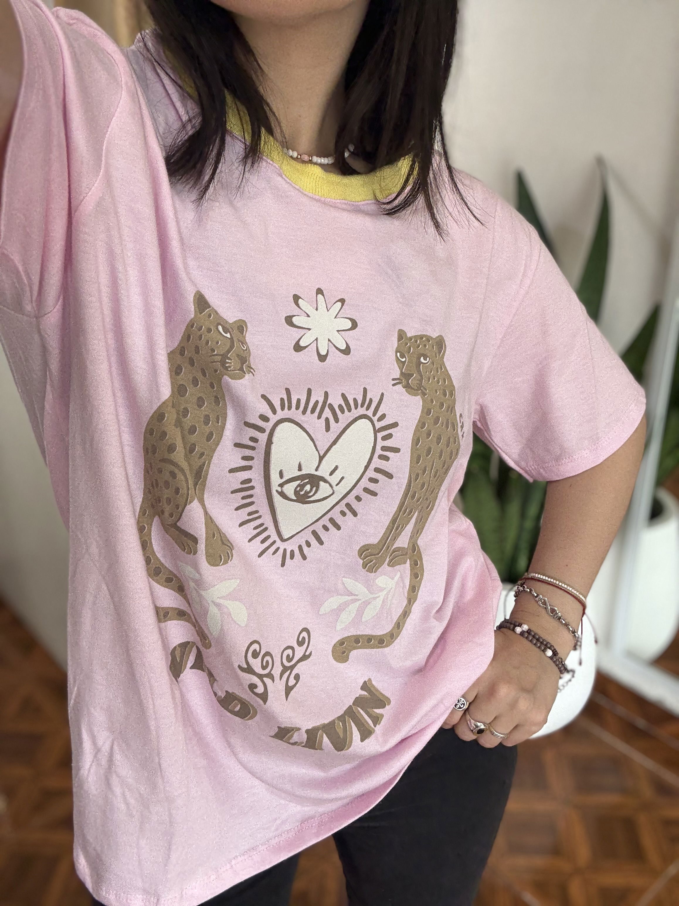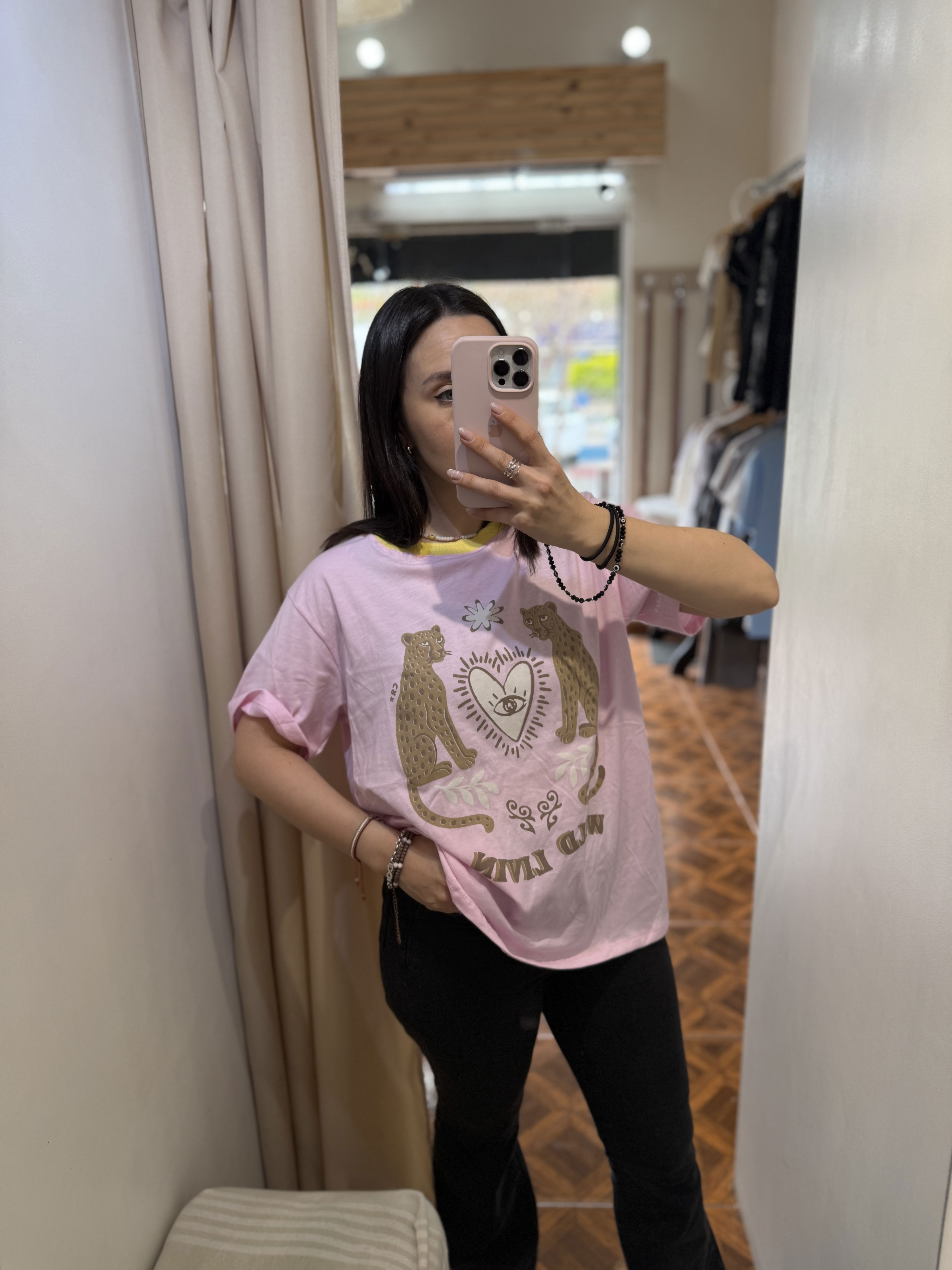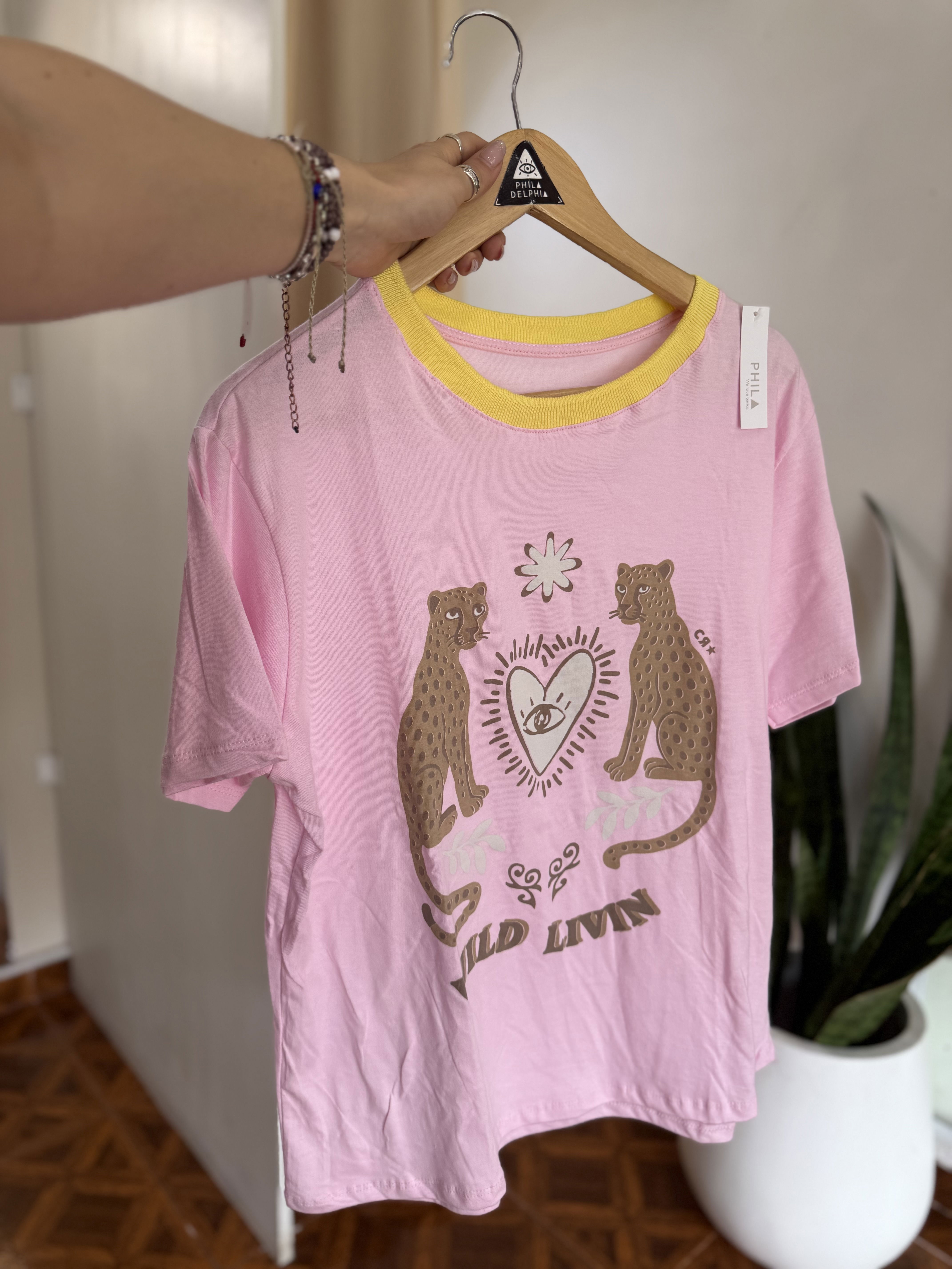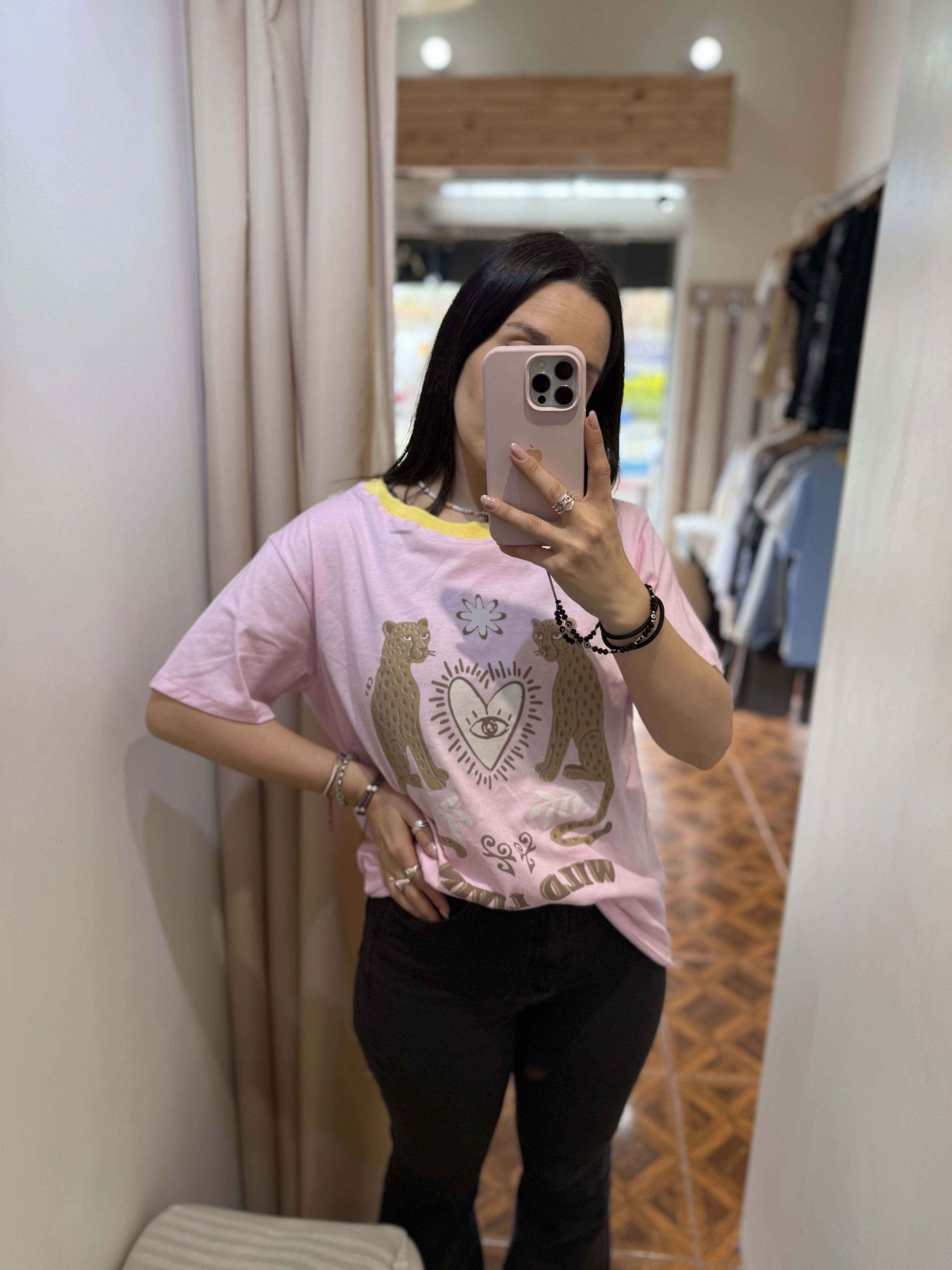 Remera de algodón con estampa al frente y cuello combinado, divinas !