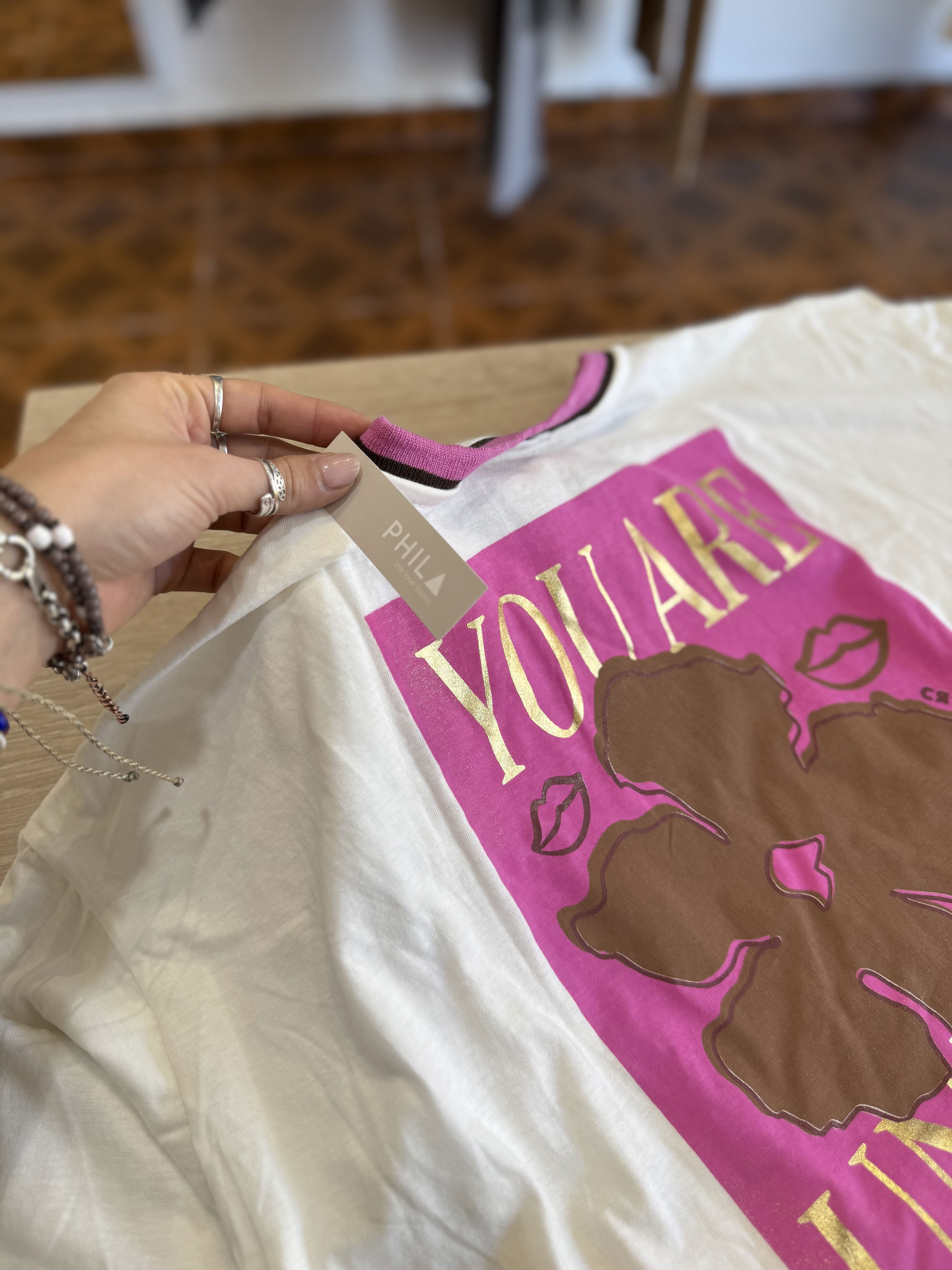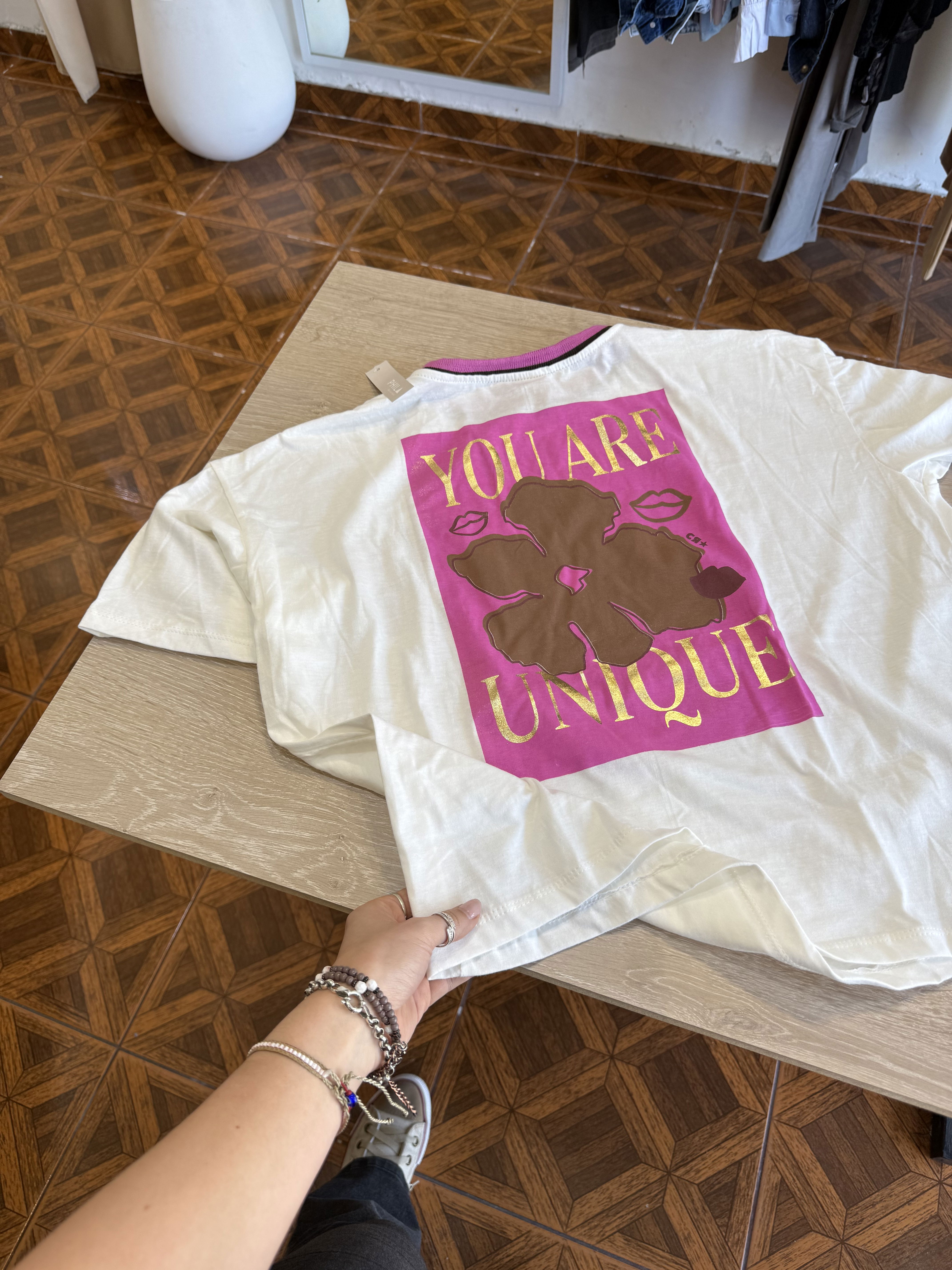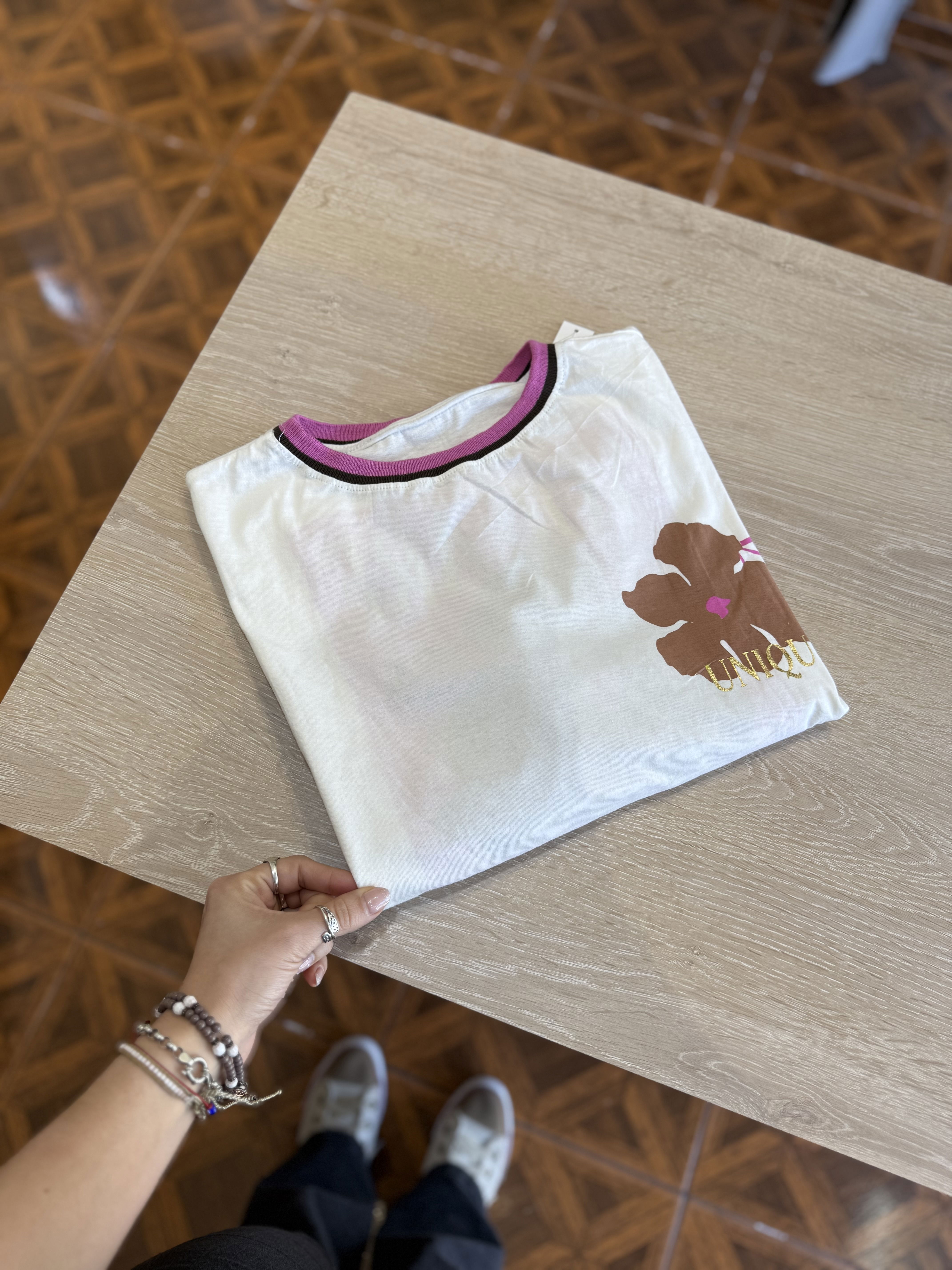 Remera de algodón con pequeña estampa al frente, y full estampa en espalda y detalles de foil, cuello combinado, divinas !