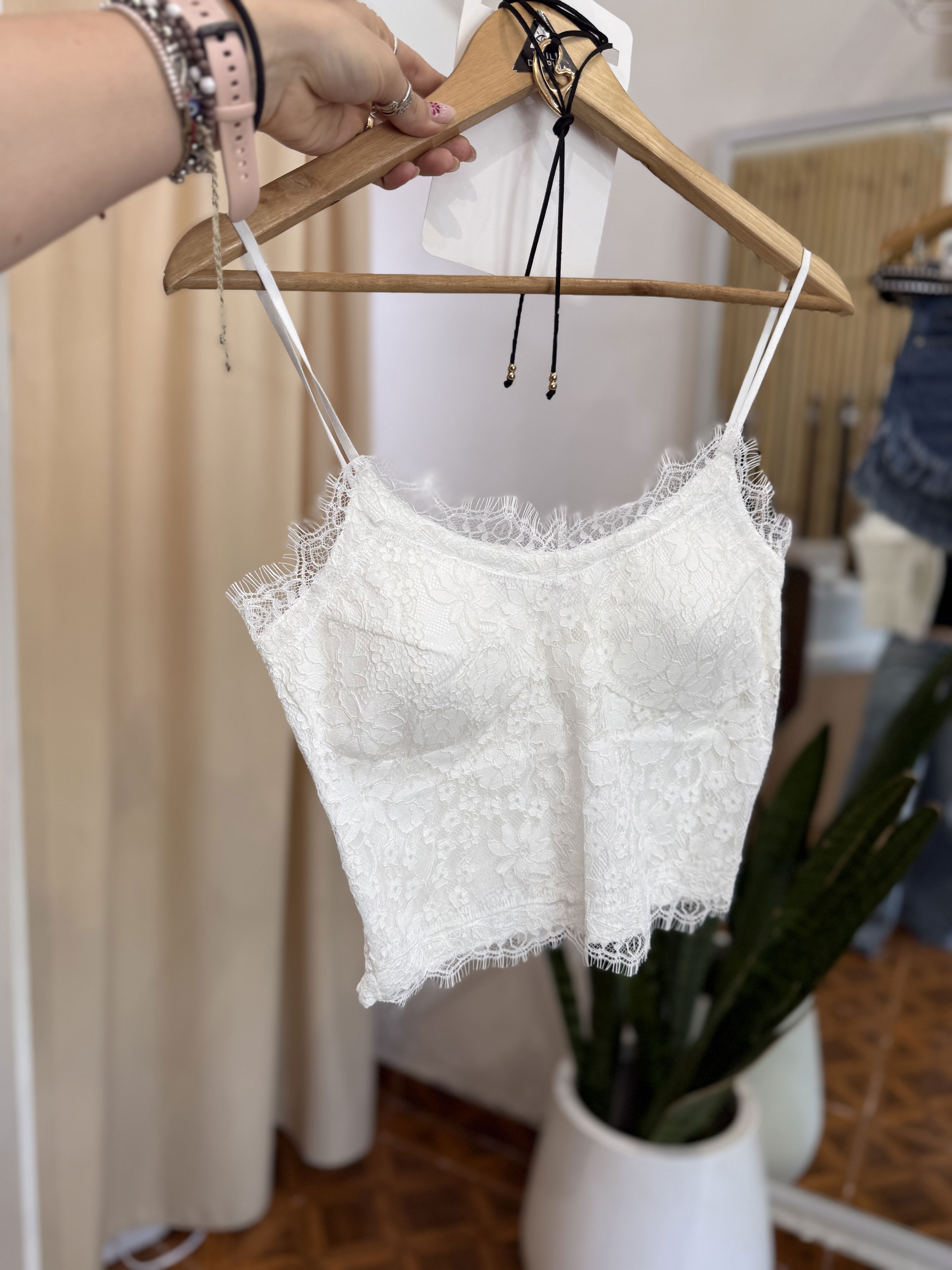 Hermoso top lencero, en color blanco con detalles de encaje en las terminaciones. Tazas en el busto, y tiritas elastizadas regulables. Divino! Espalda con elastico que hace adaptable el modelito.
