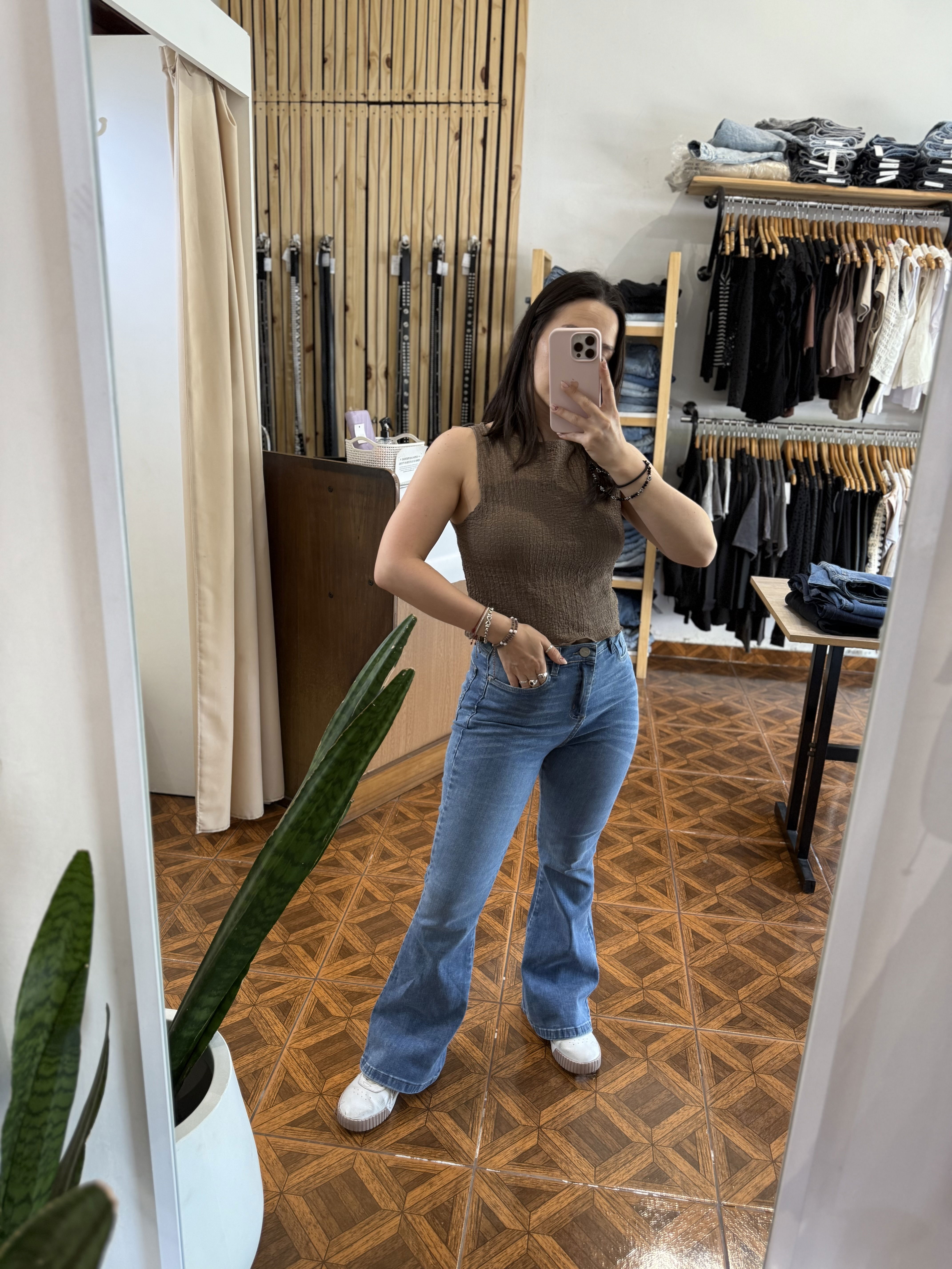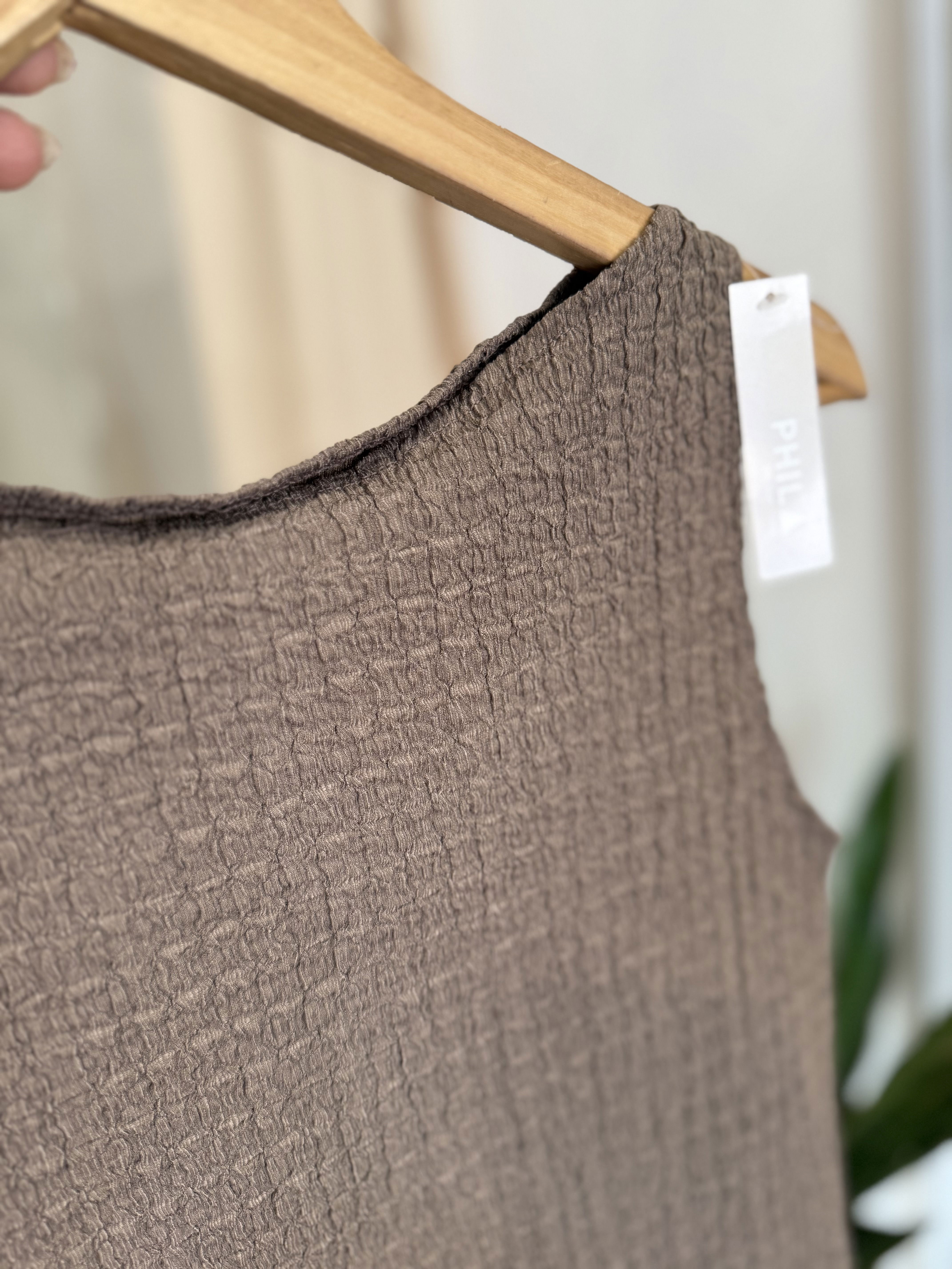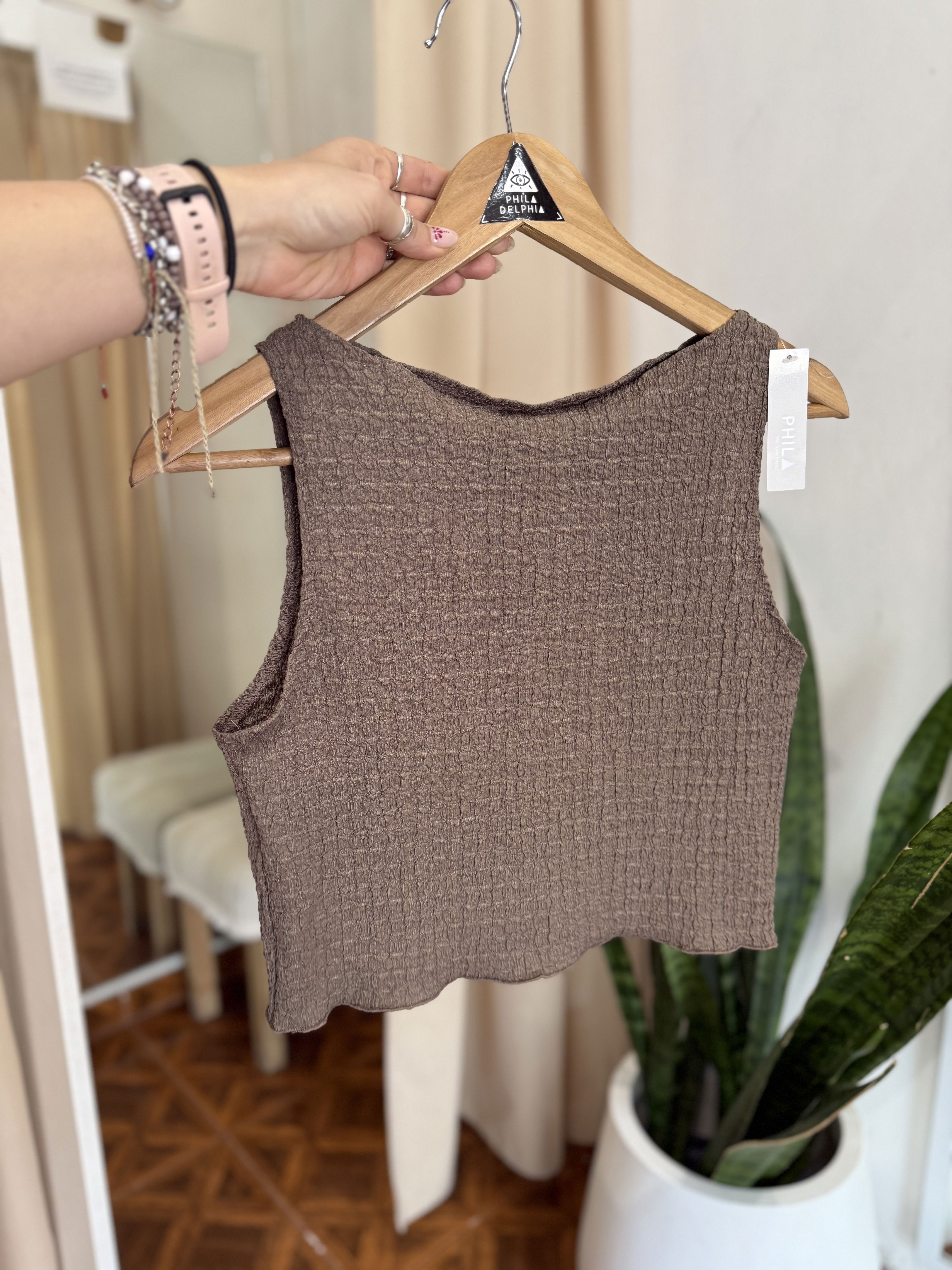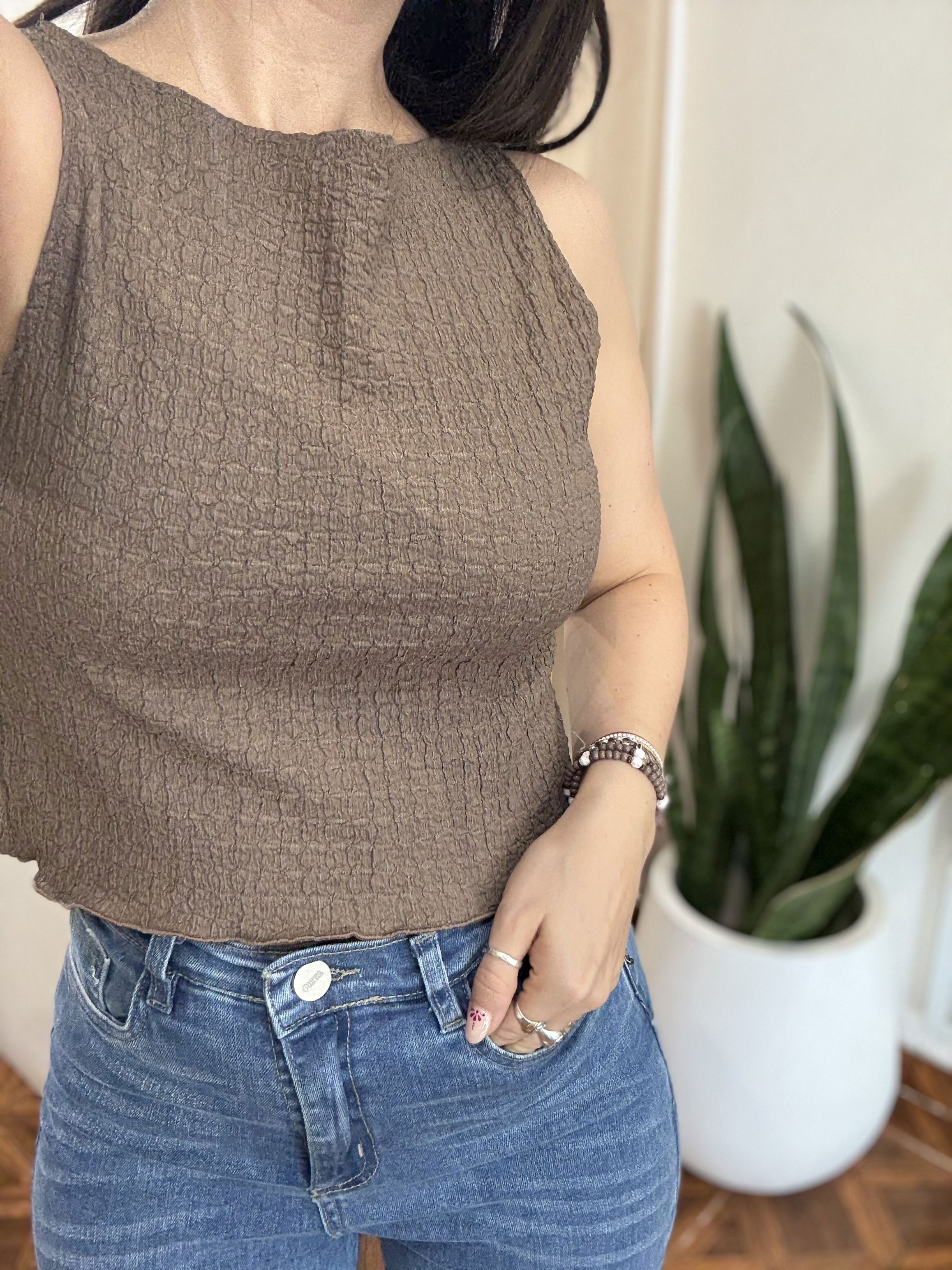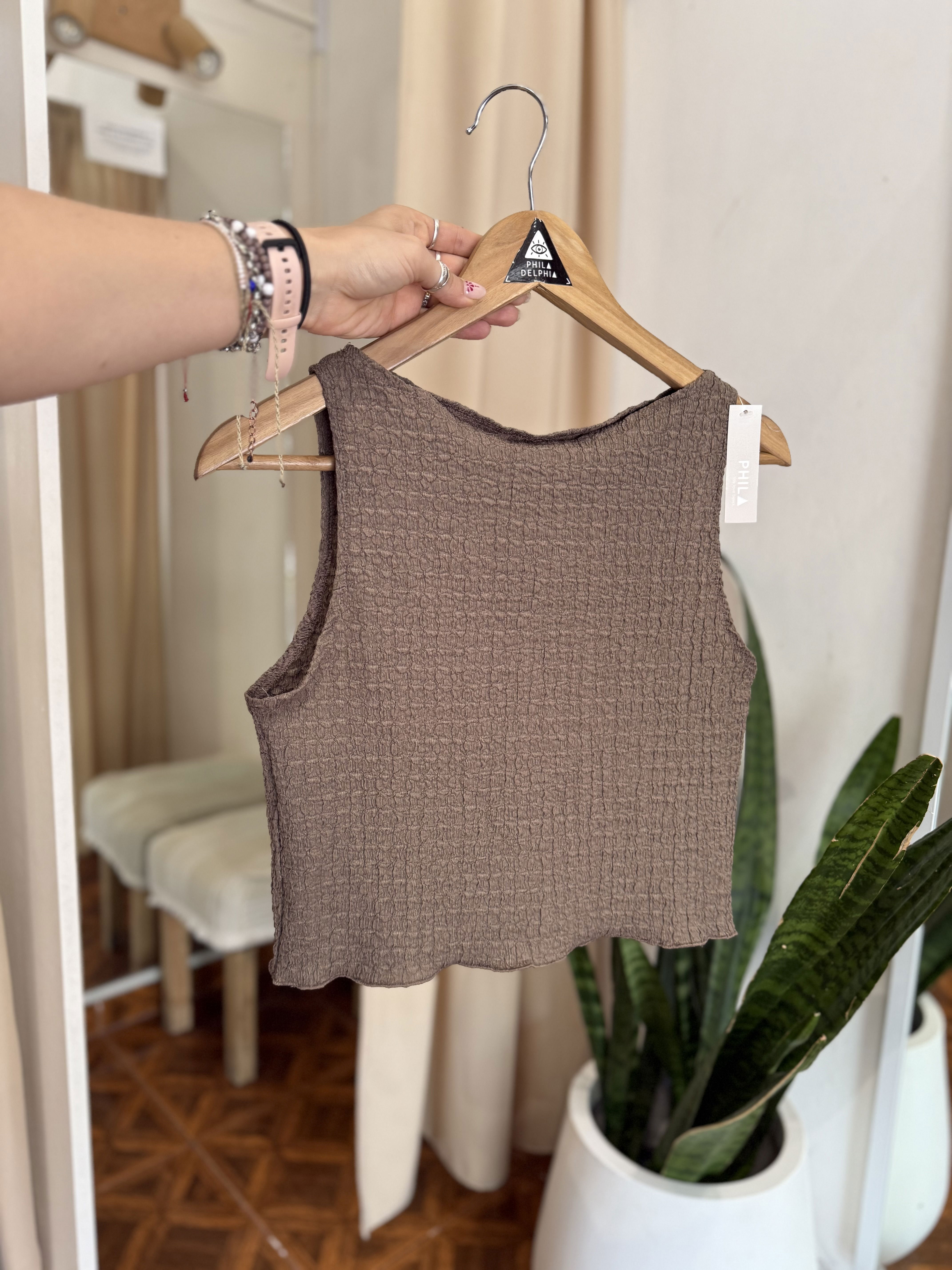 Musculosa de crep texturado, elastizado. Un modelo clásico divino para la temporada de verano por ser liviano y muy canchero.