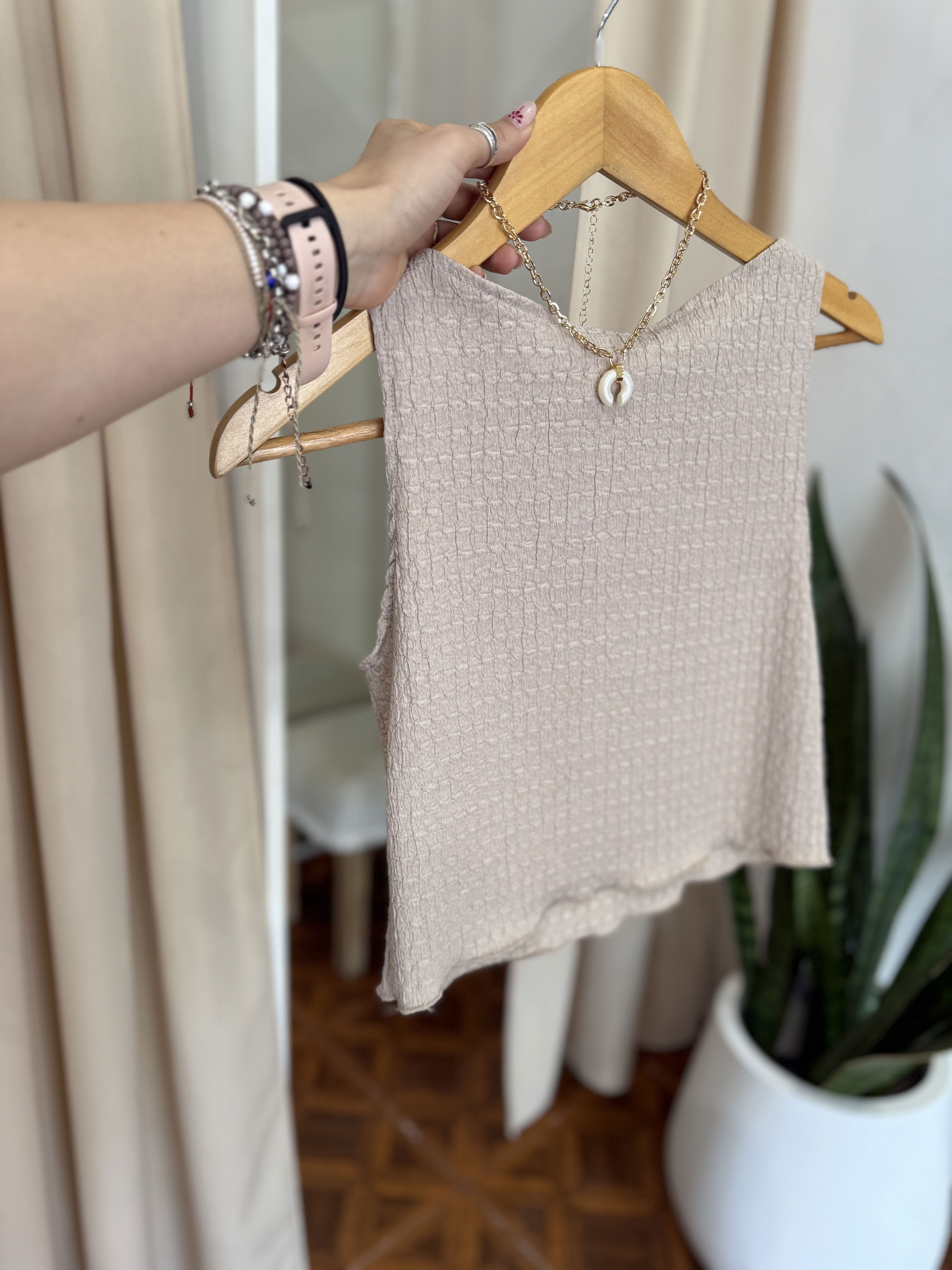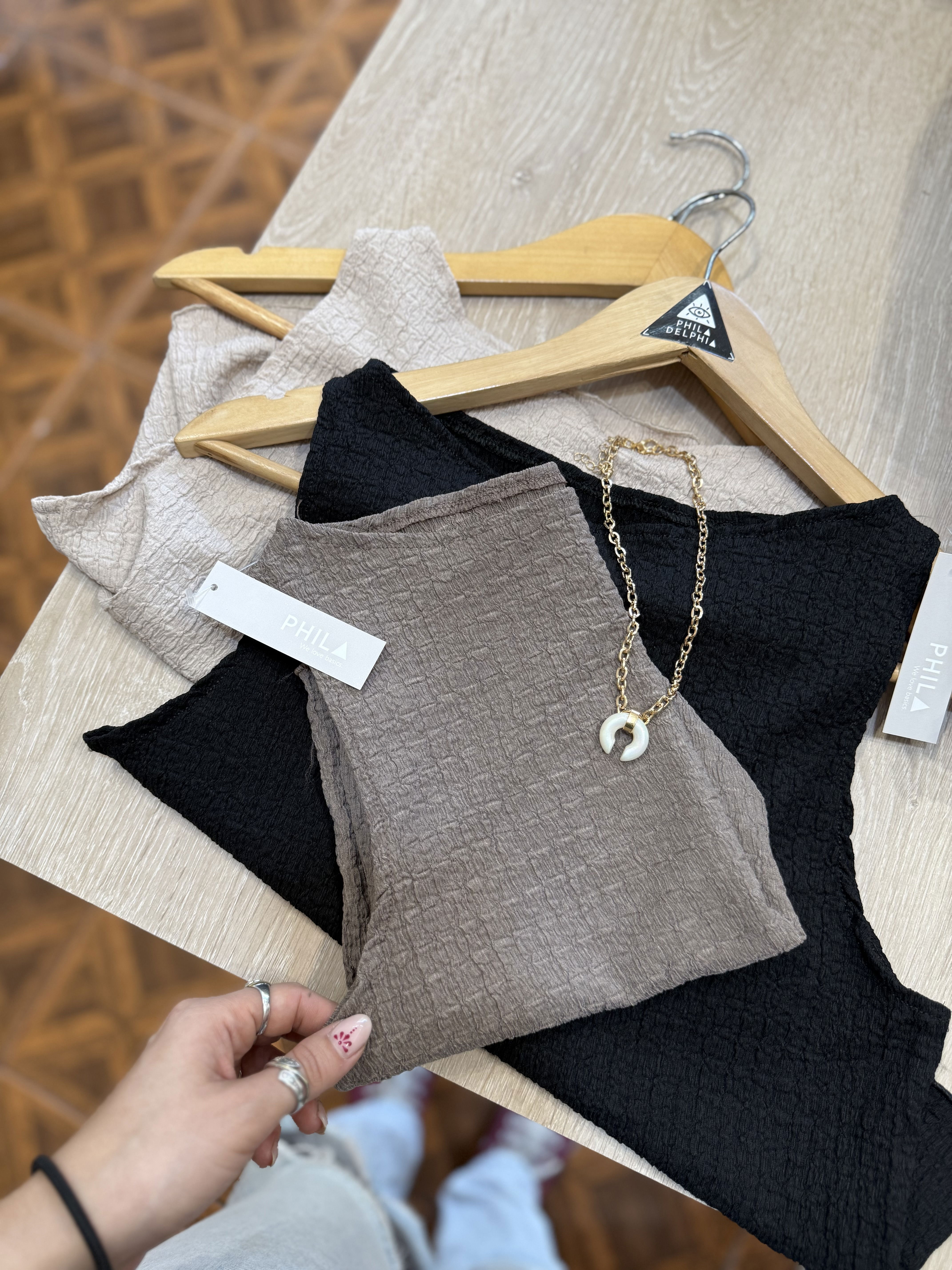 Musculosa de crep texturado, elastizado. Un modelo clásico divino para la temporada de verano por ser liviano y muy canchero.
