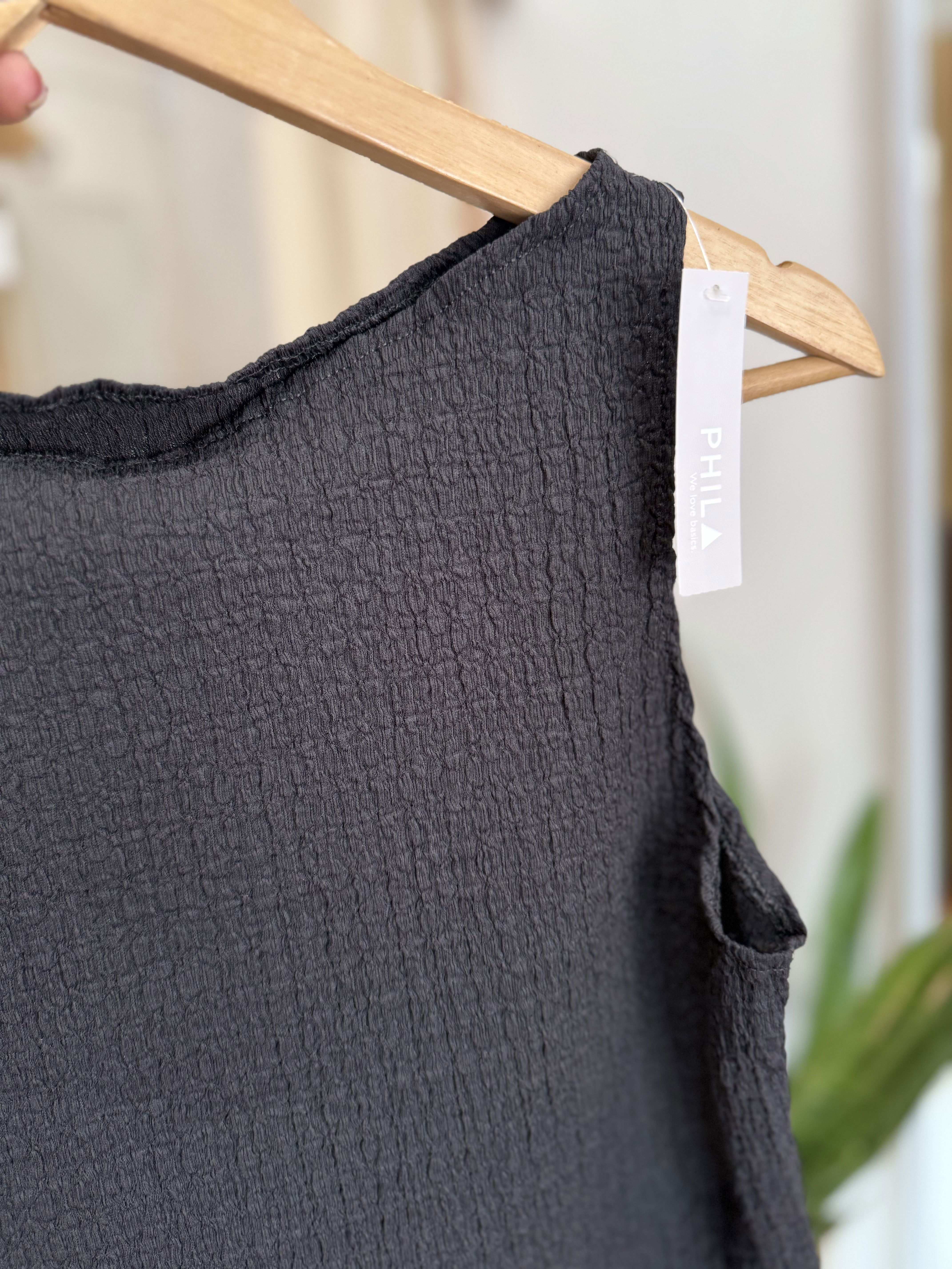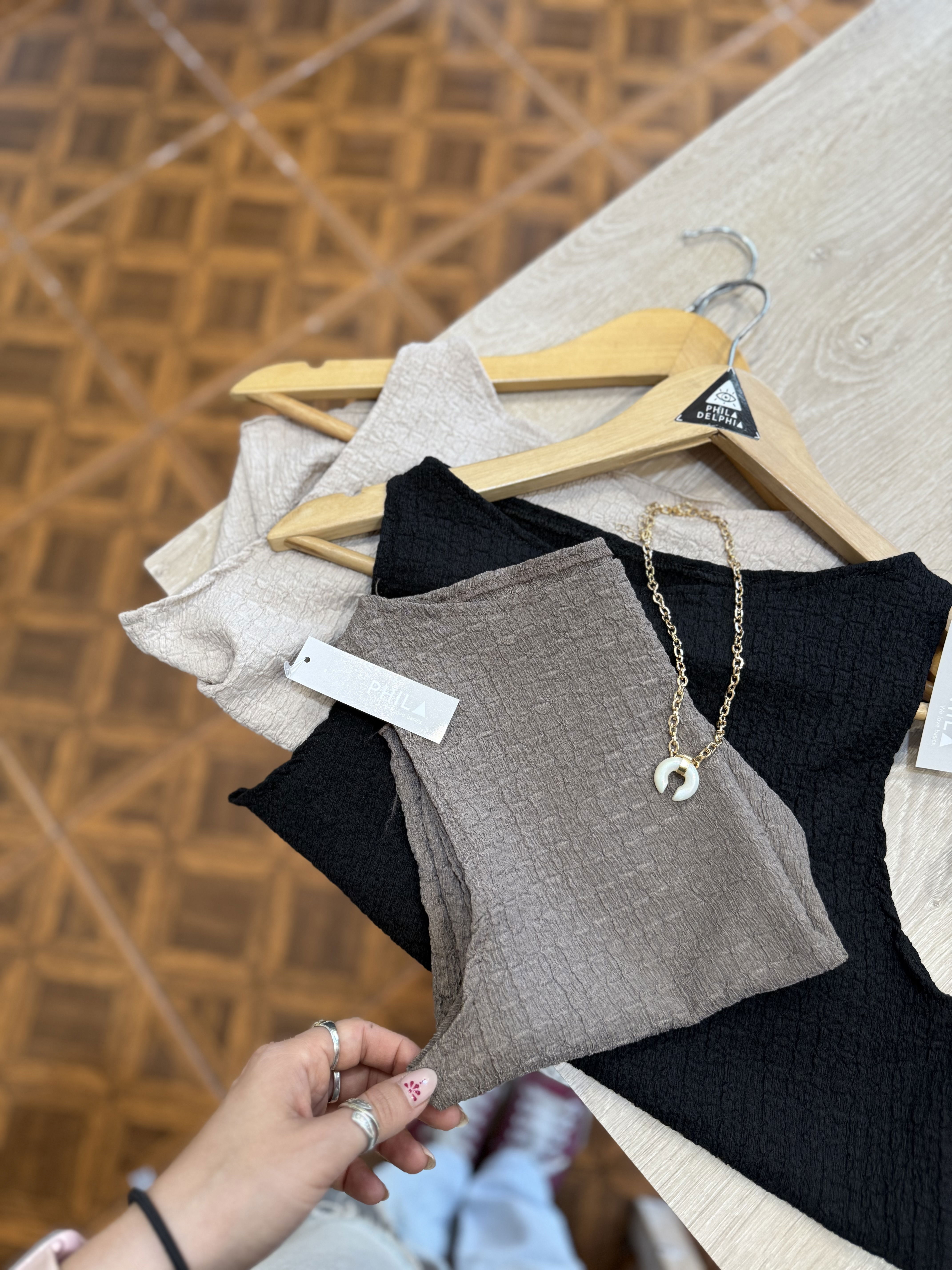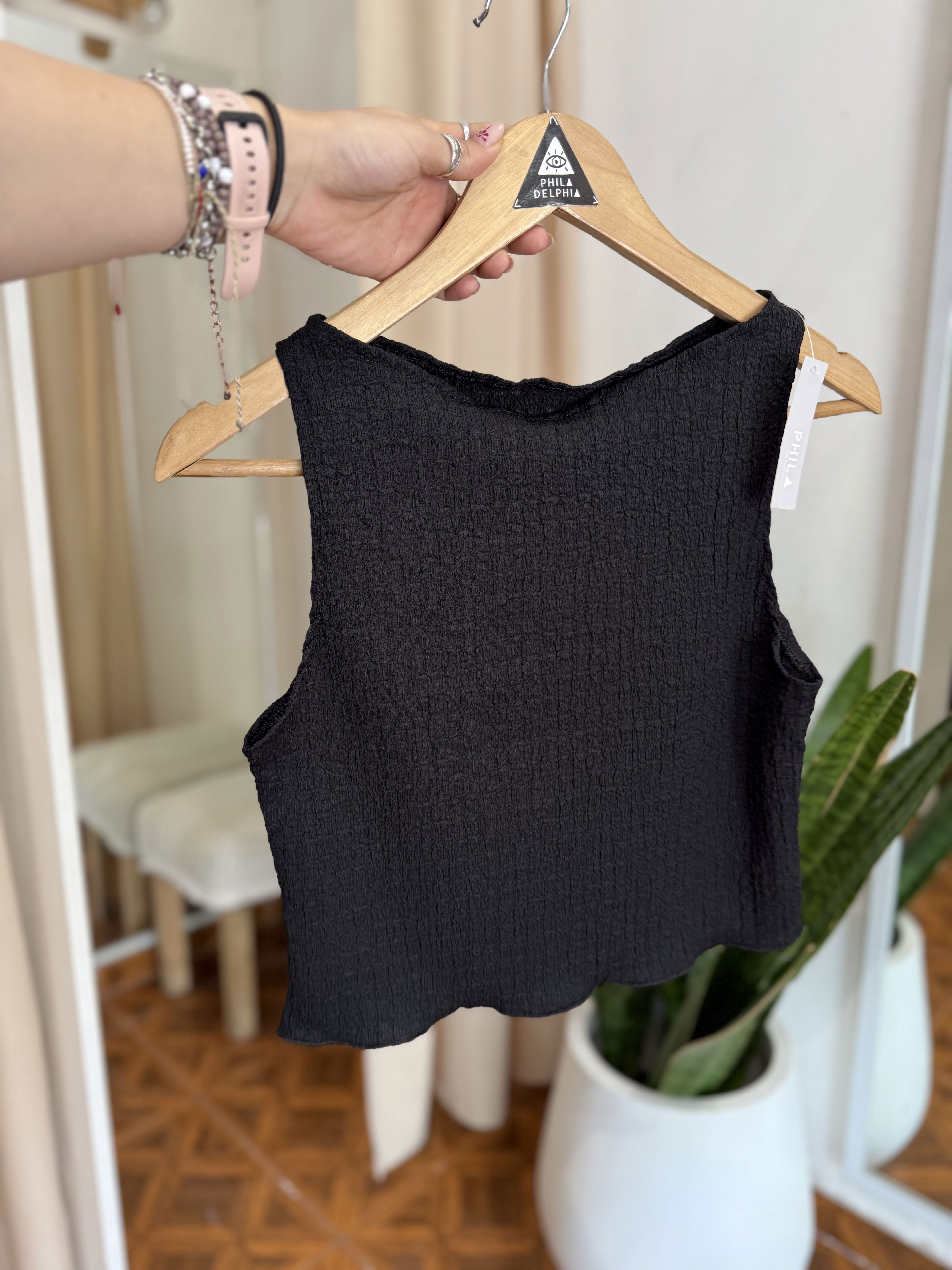 Musculosa de crep texturado, elastizado. Un modelo clásico divino para la temporada de verano por ser liviano y muy canchero.