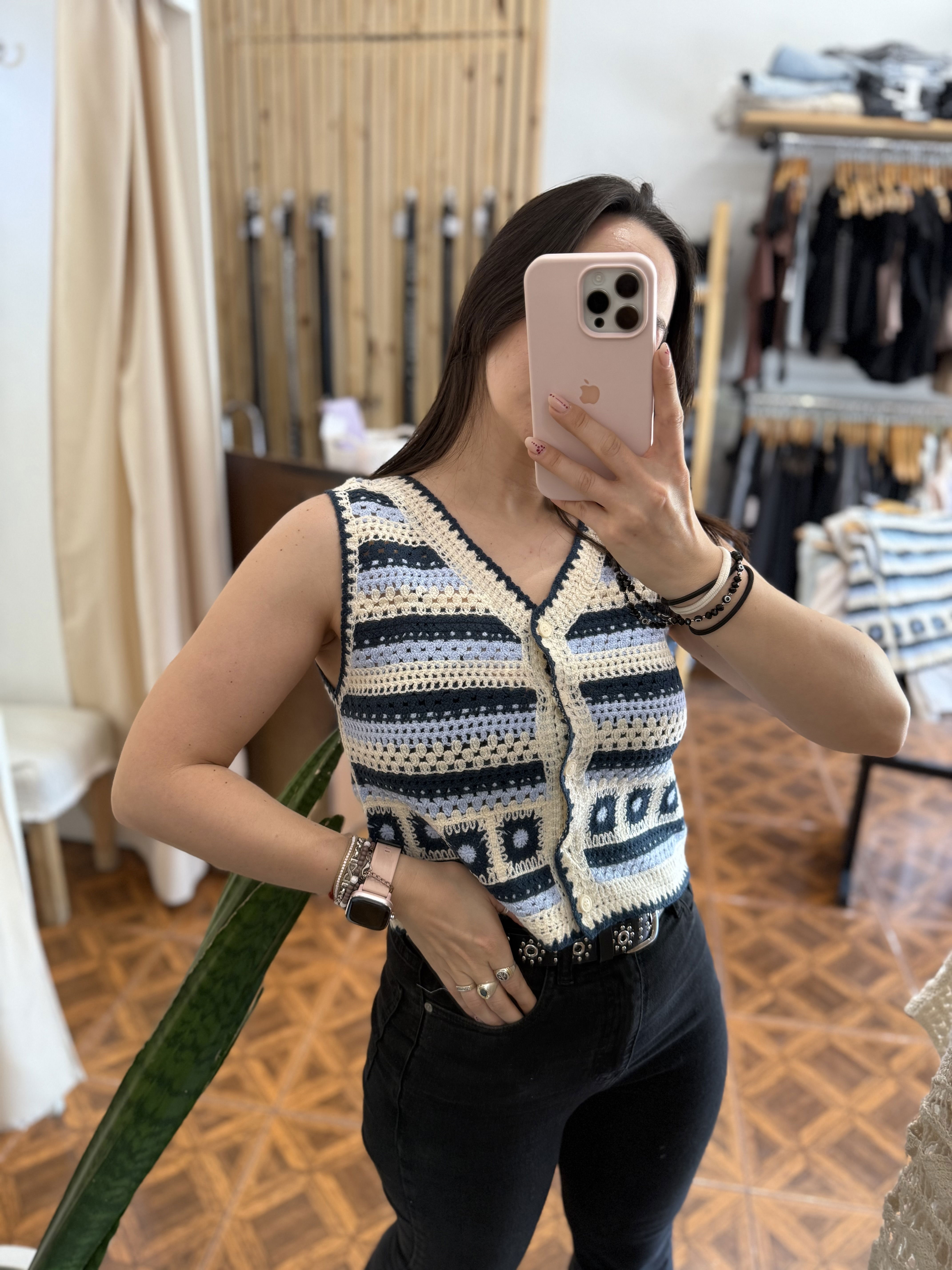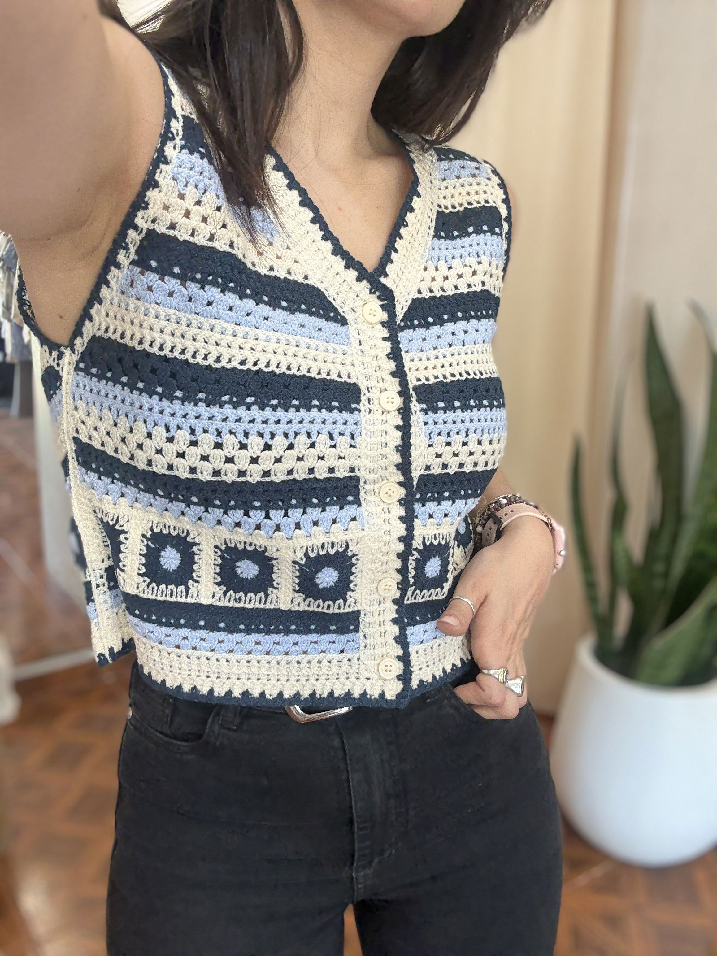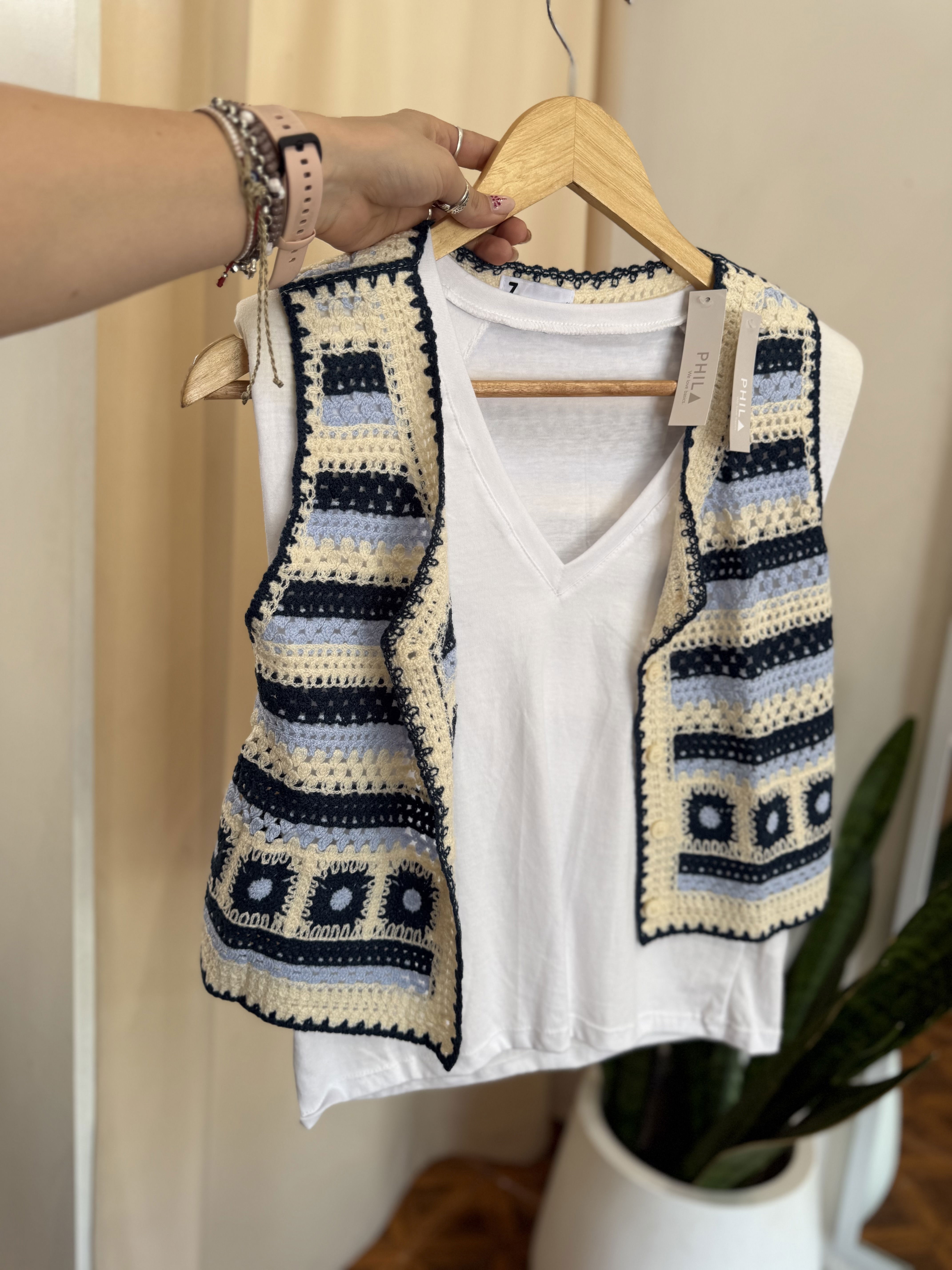 Chaleco combinado en tonos celestes, divino! todo Tejido.