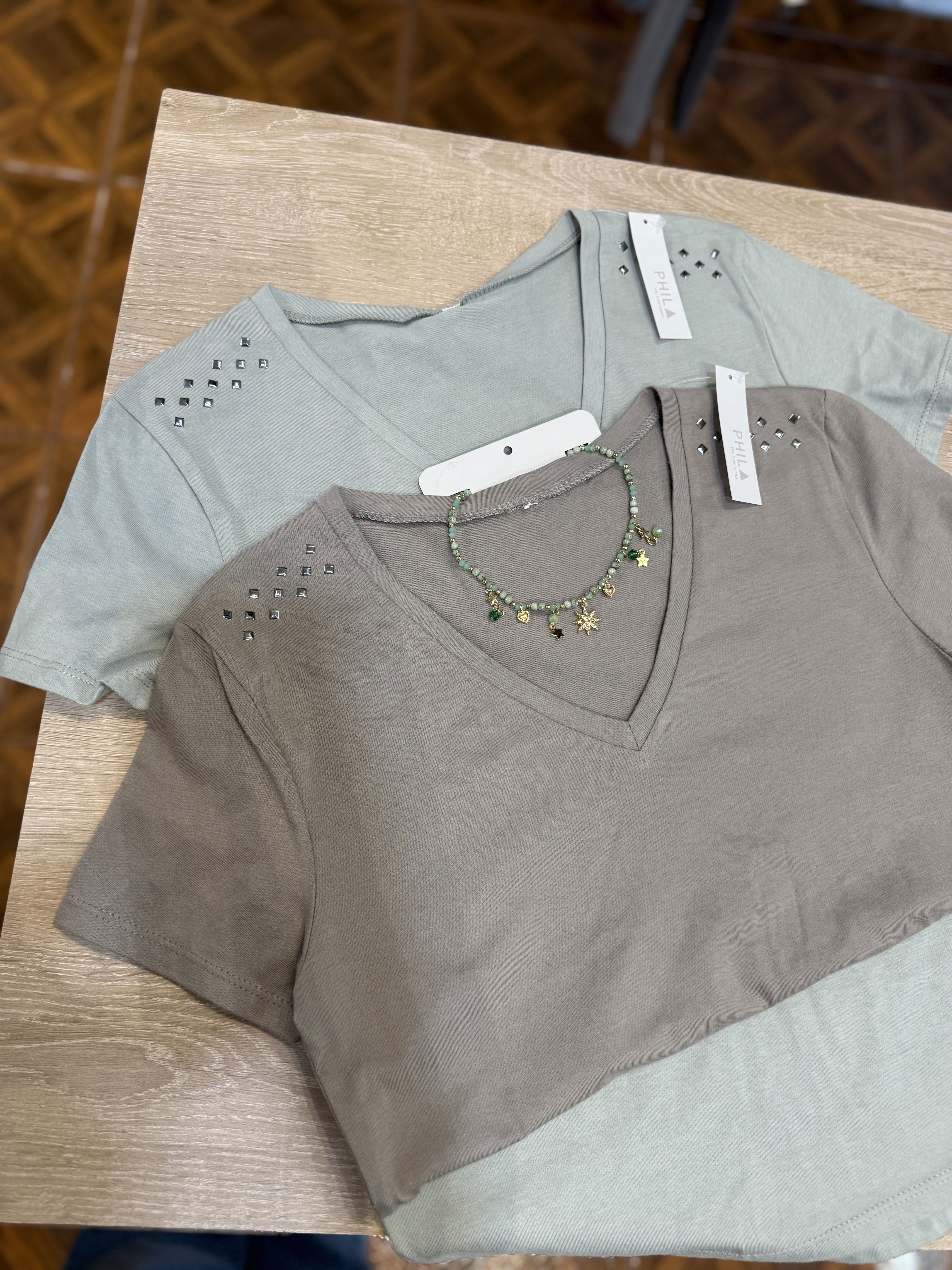 Hermosa remera de algodon Escote V con pequeño detalle de brillo en los hombros.
