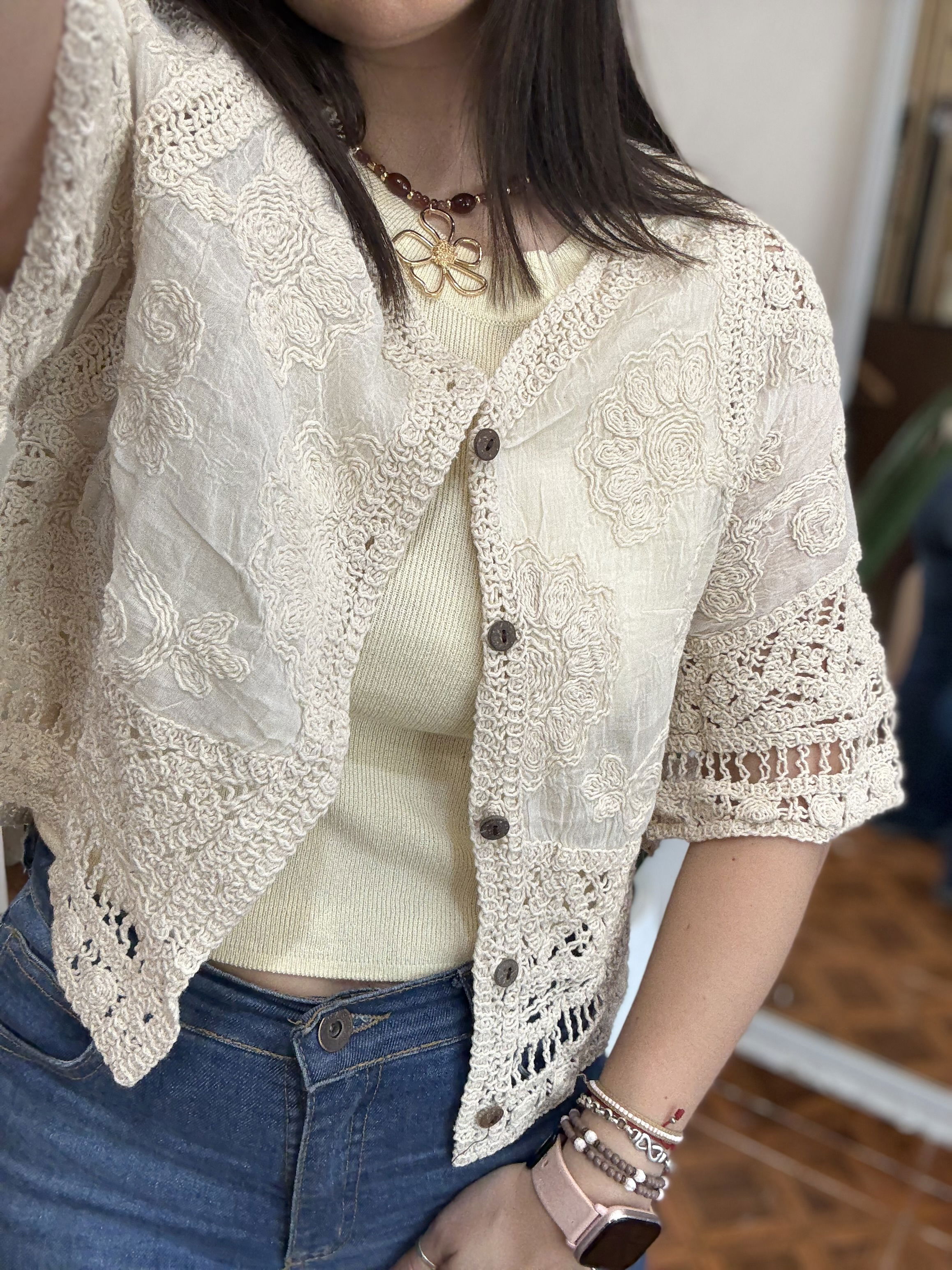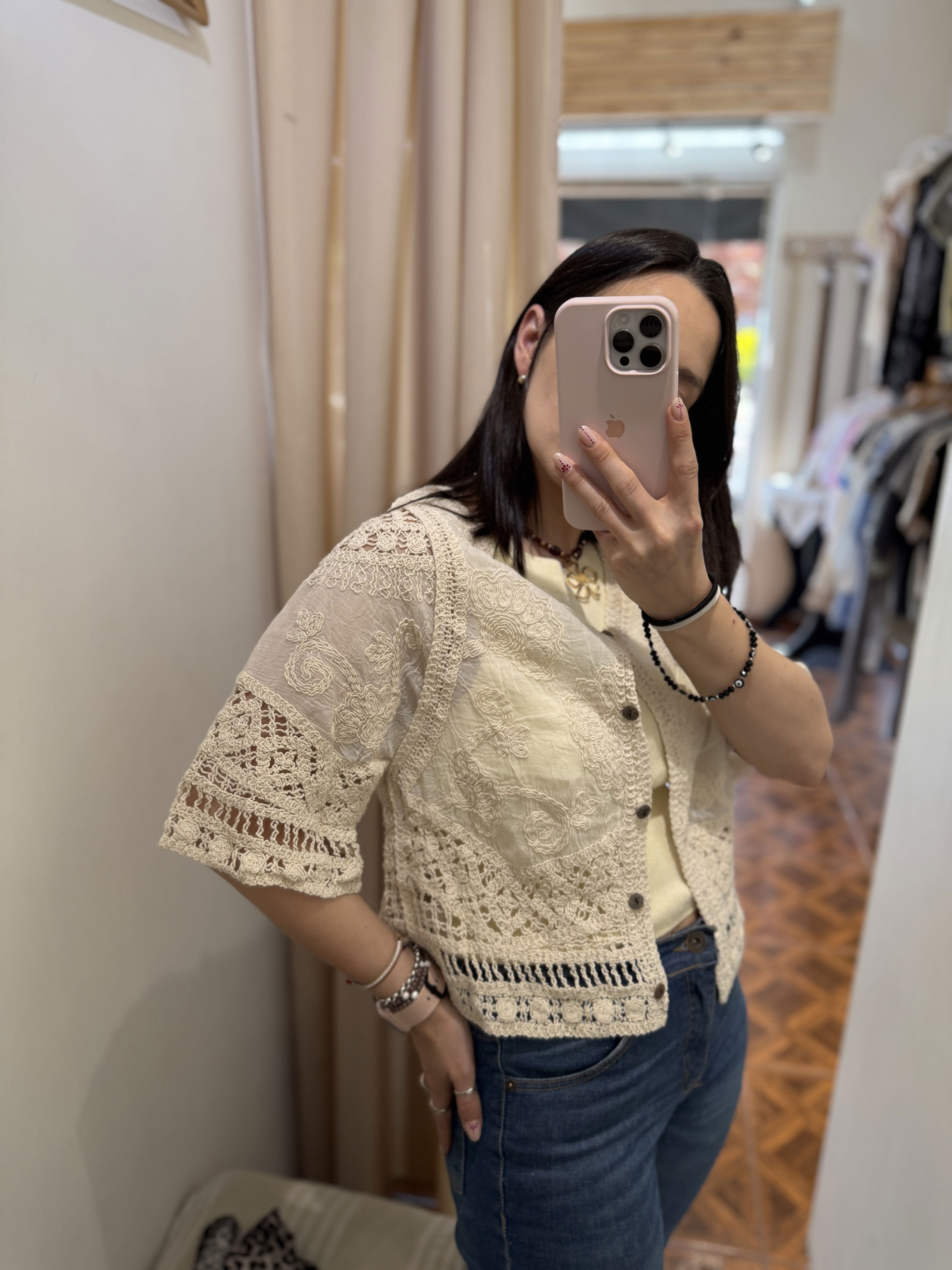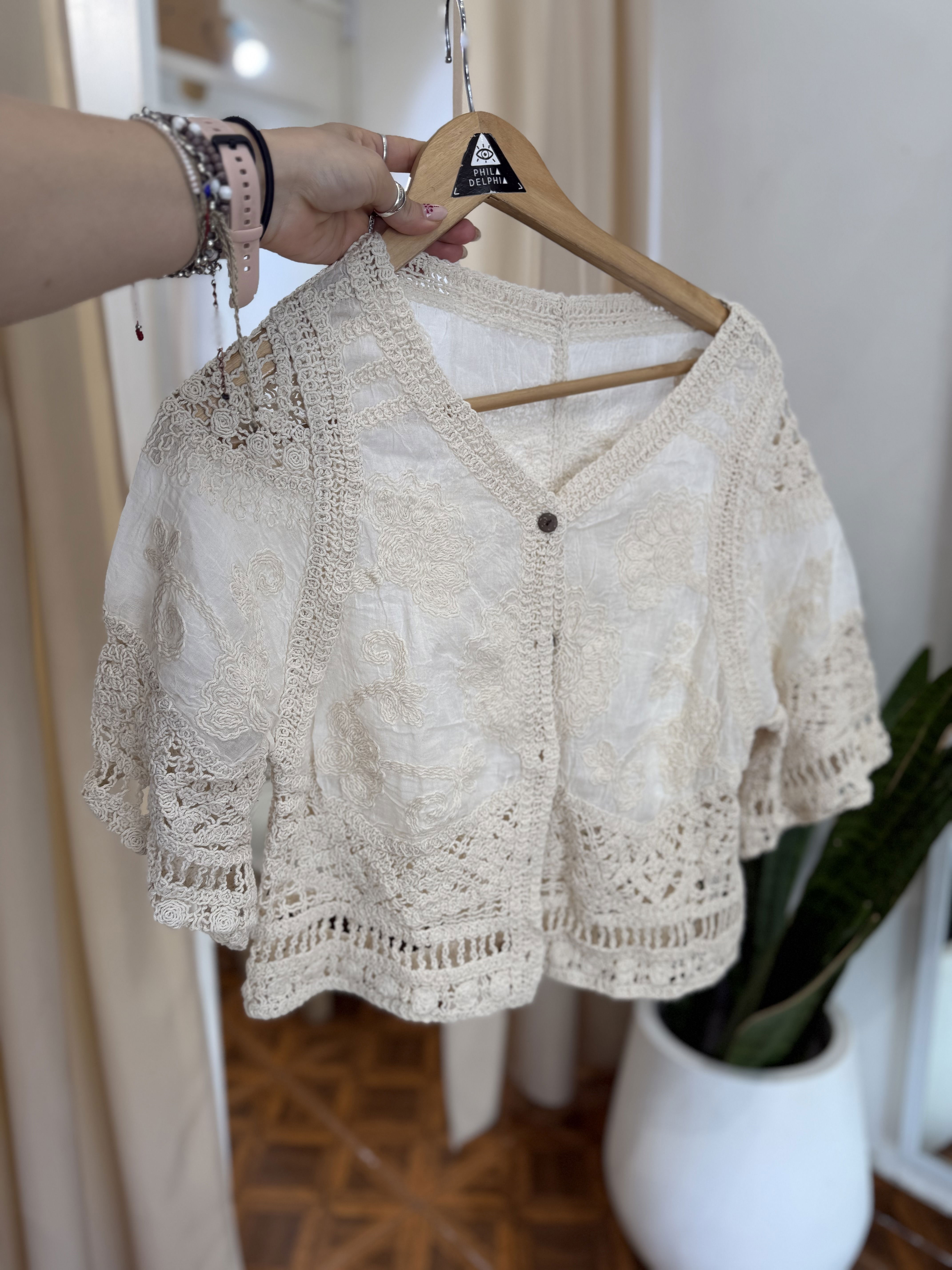 Hermoso modelo camperita con detalles en crochet, manguita corta. Color Nude.