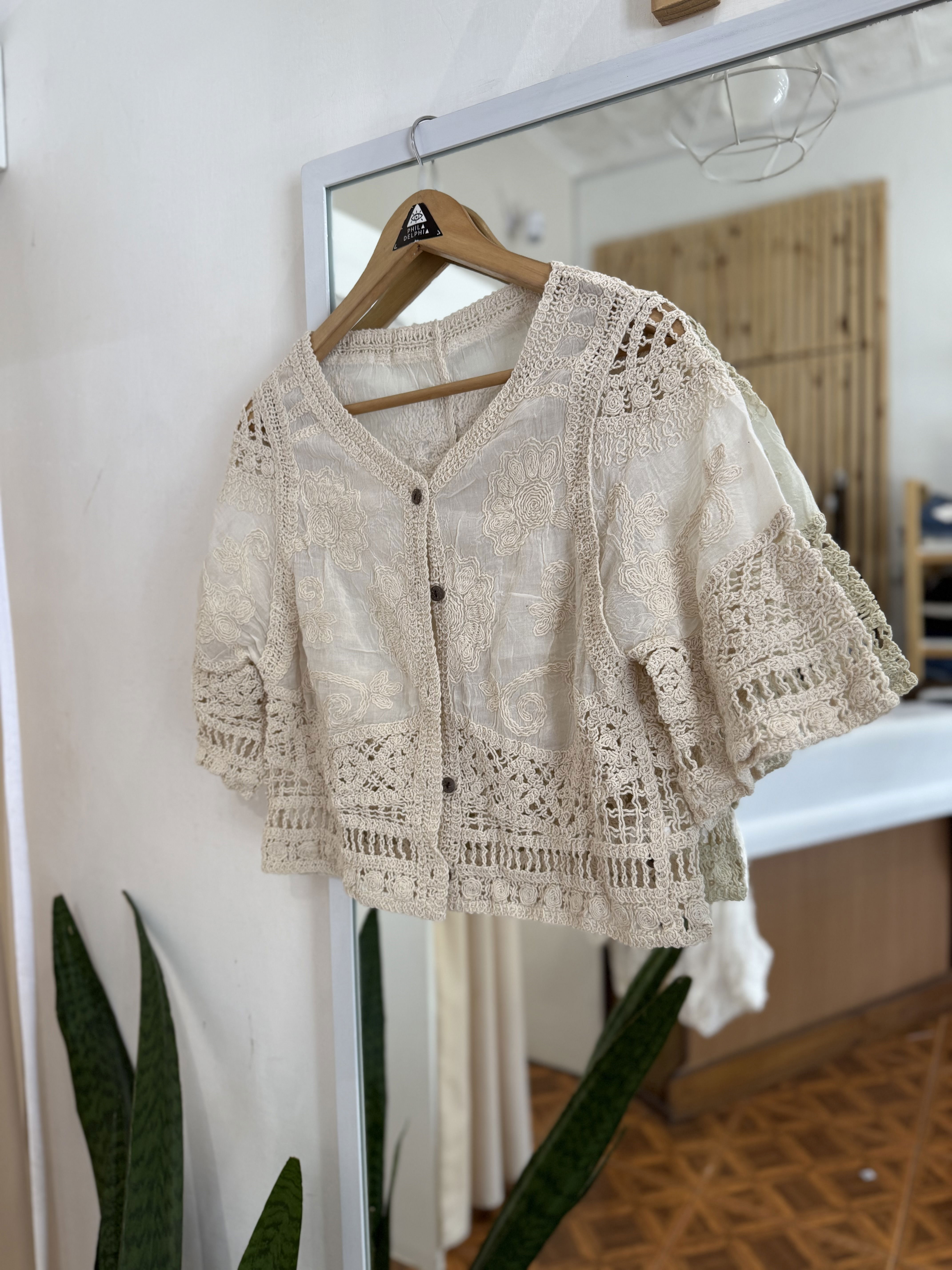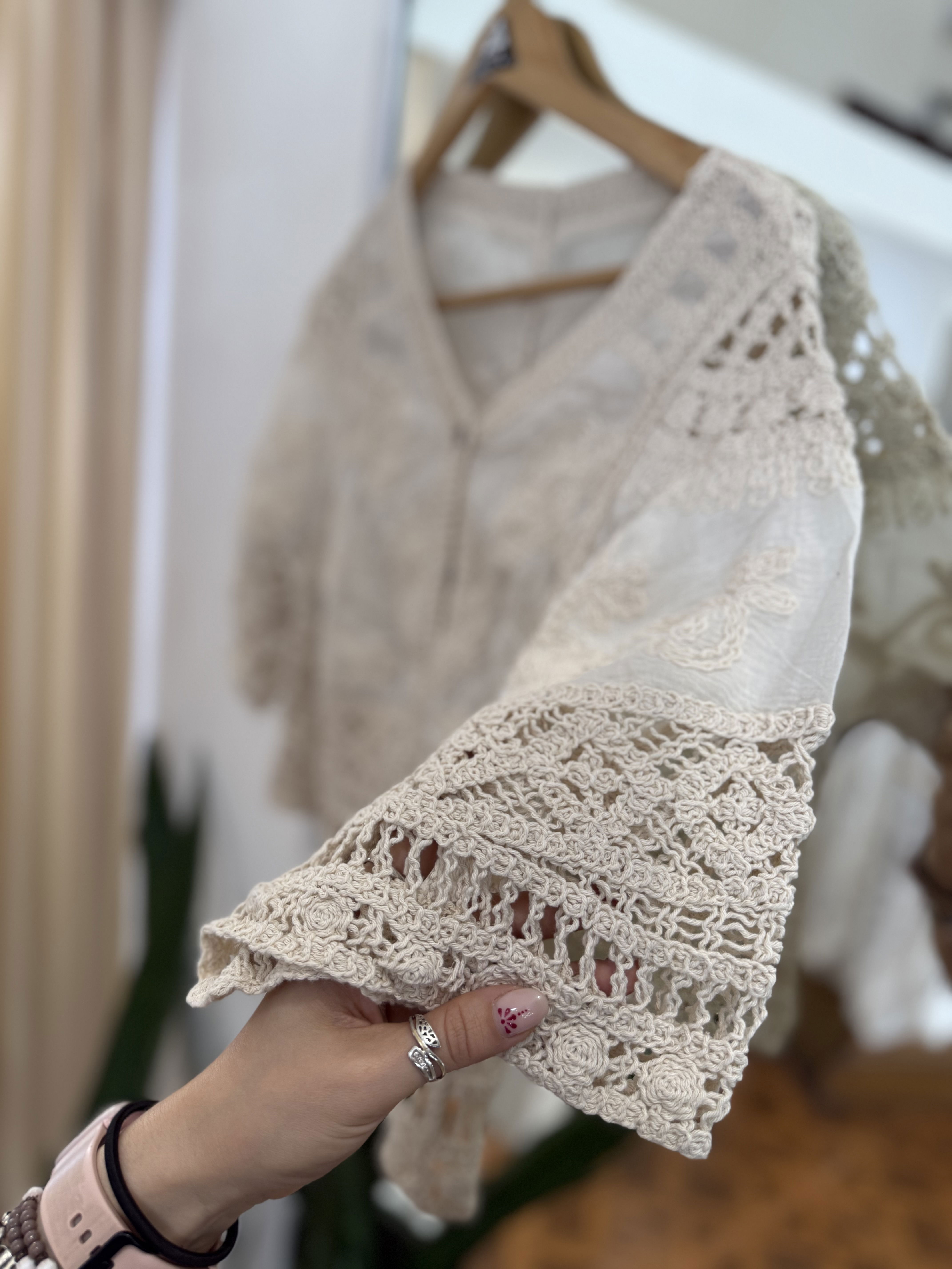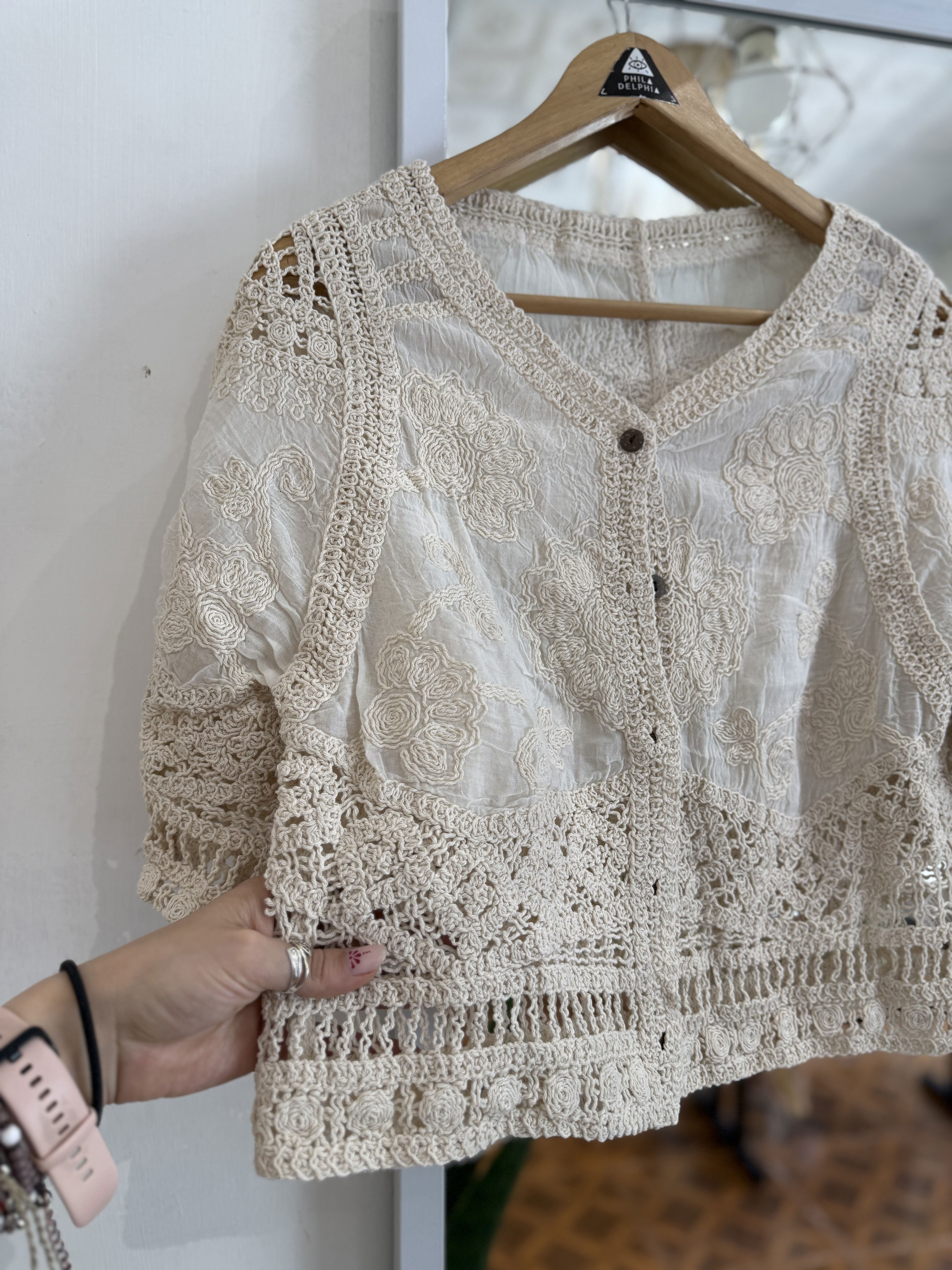 Hermoso modelo camperita con detalles en crochet, manguita corta. Color Nude.