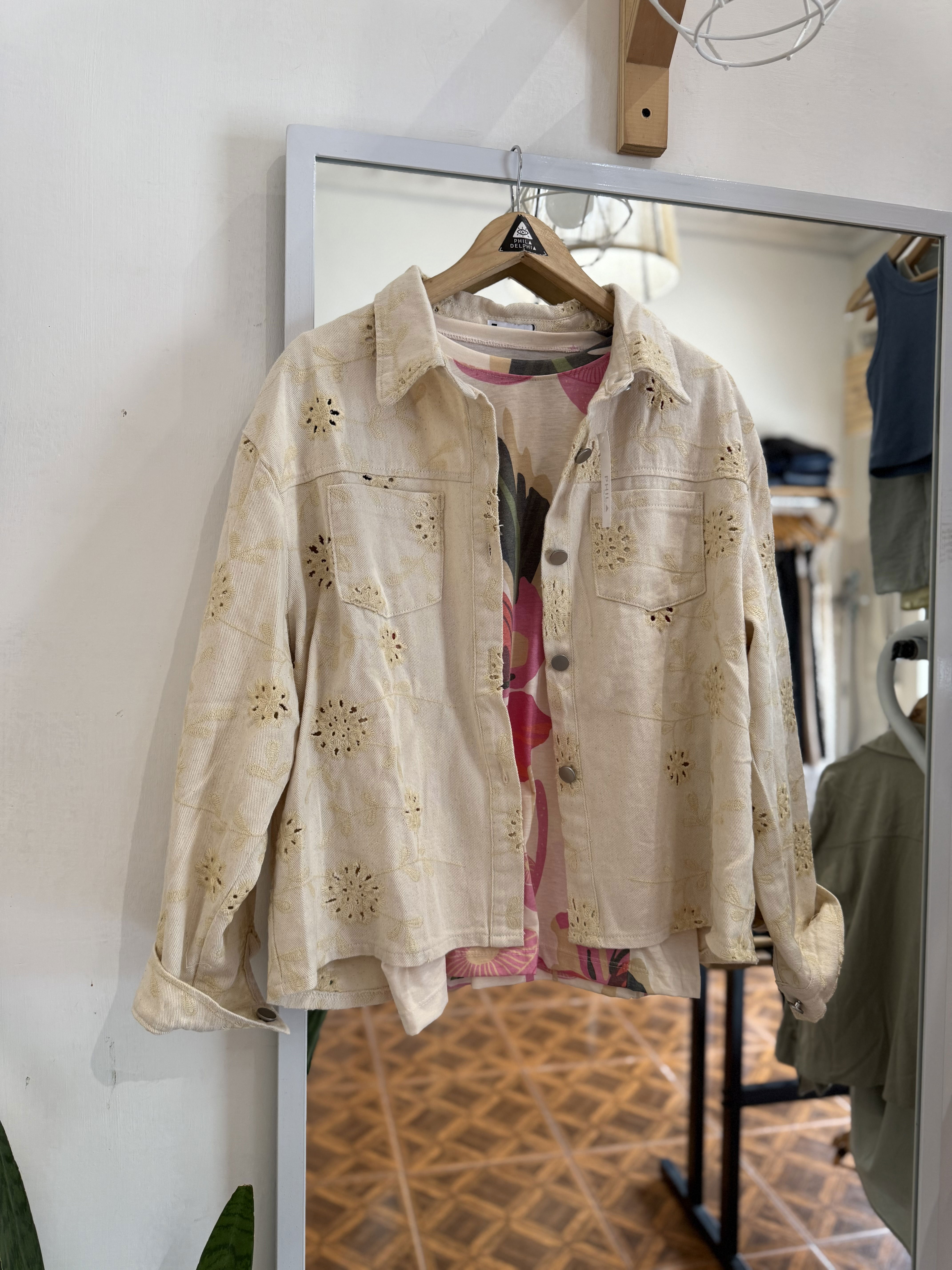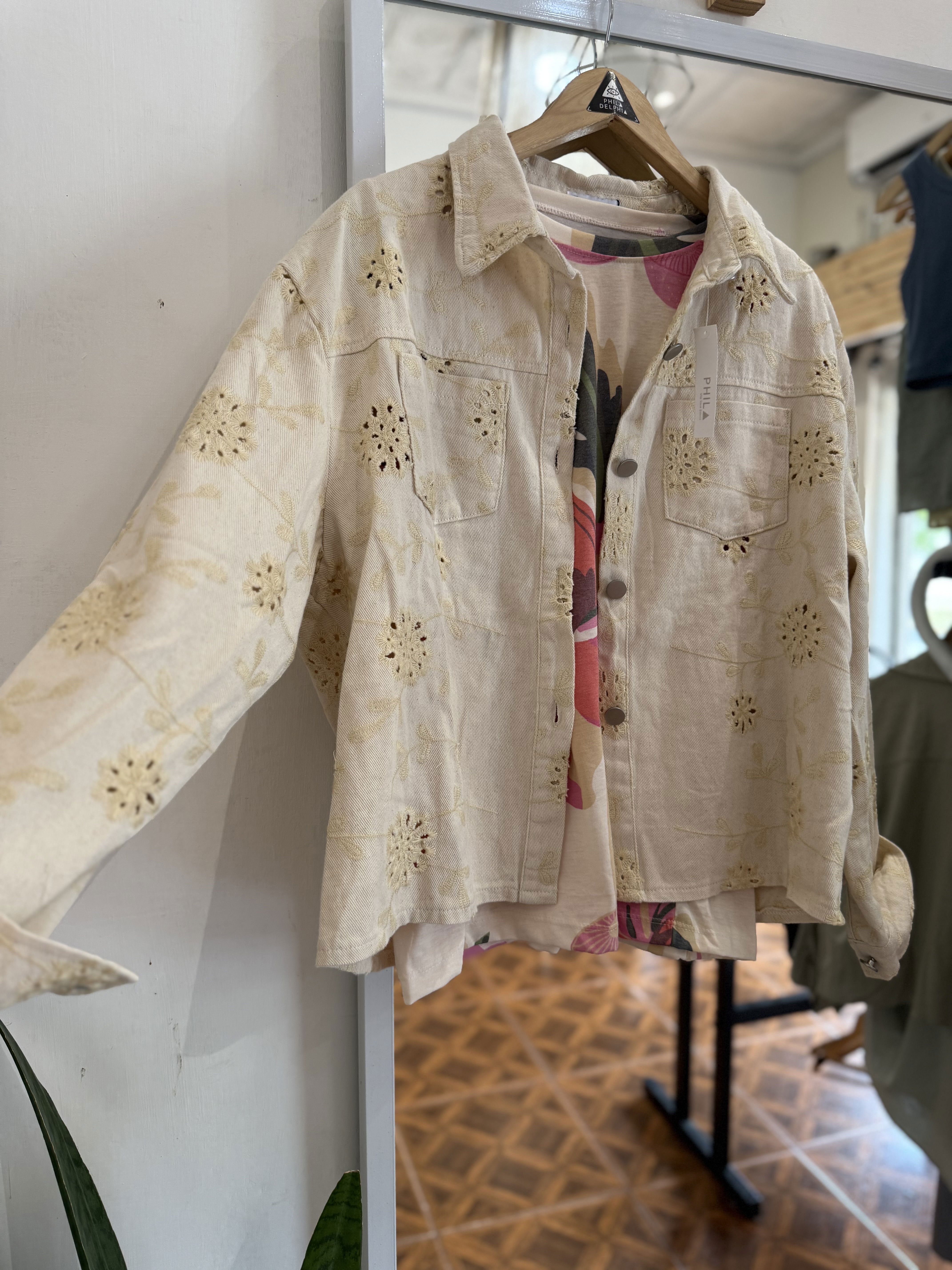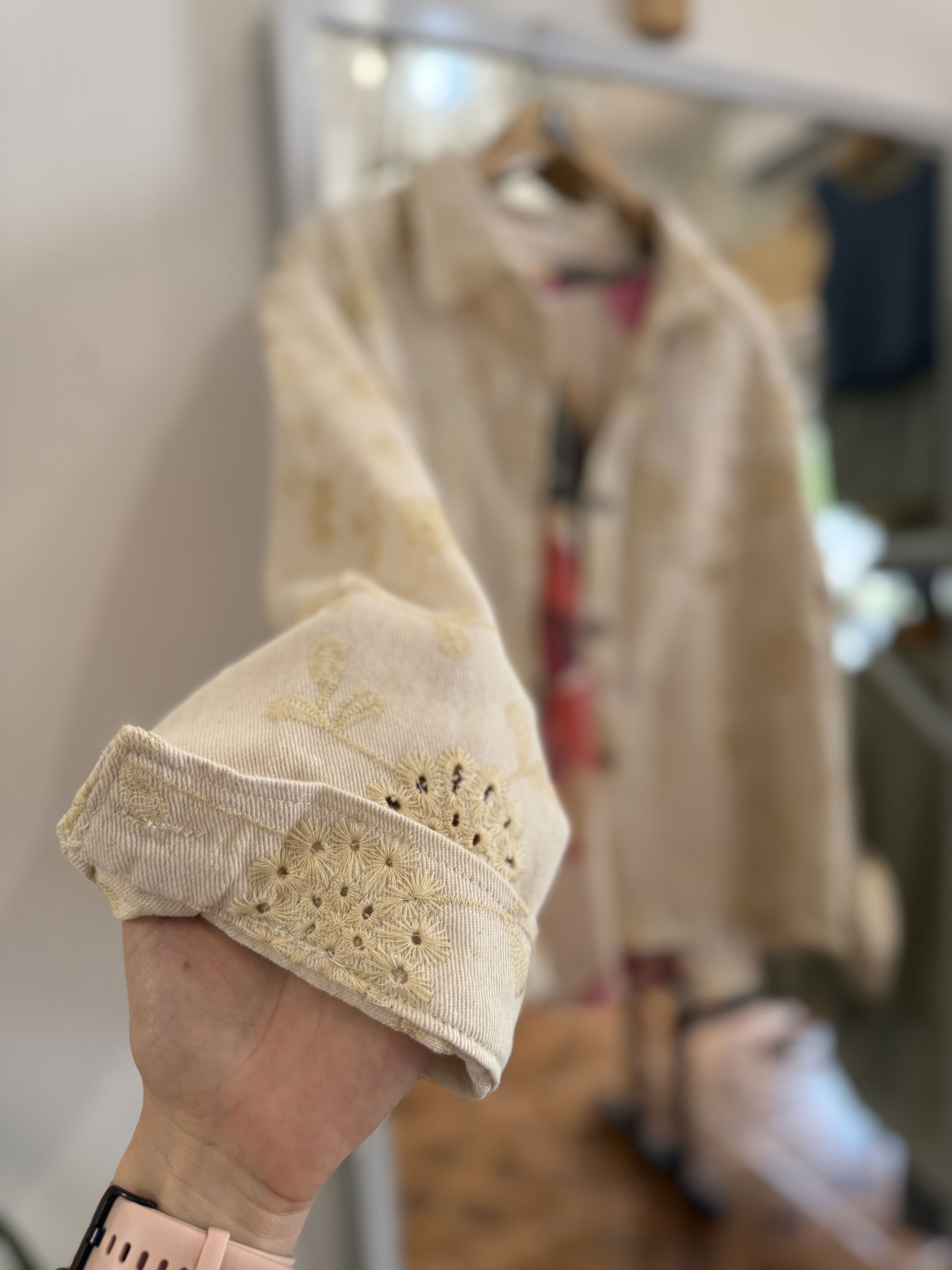 Hermosa chaqueta caladita con detalle en forma de florcitas, en color crema.Un modelo diferente, que le da ese toque romántico a tus looks.