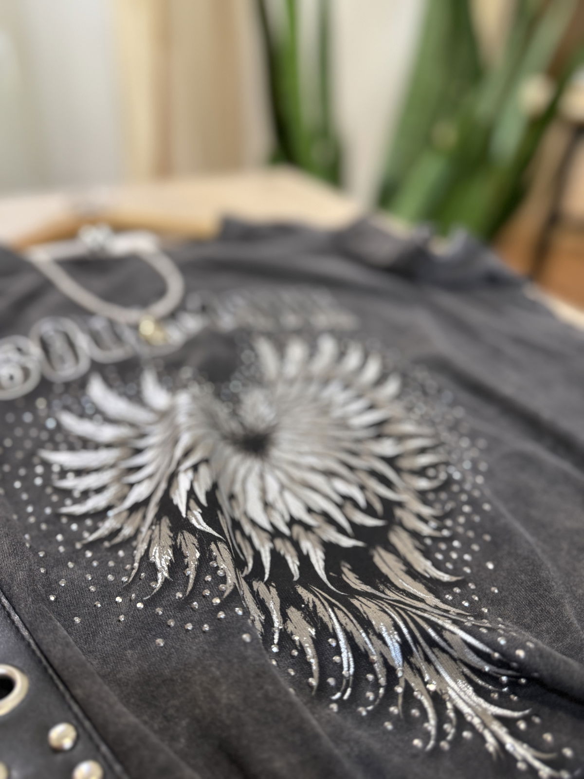 Hermosa reme batik con estampa al frente y unos detalles mega delicados en relieve y brillos.