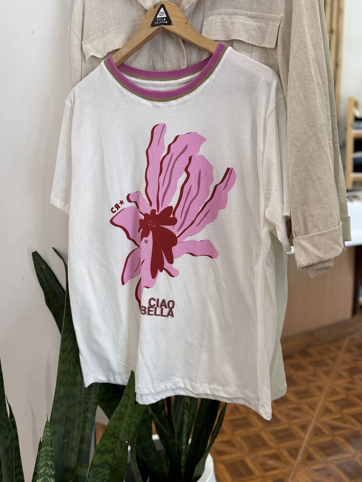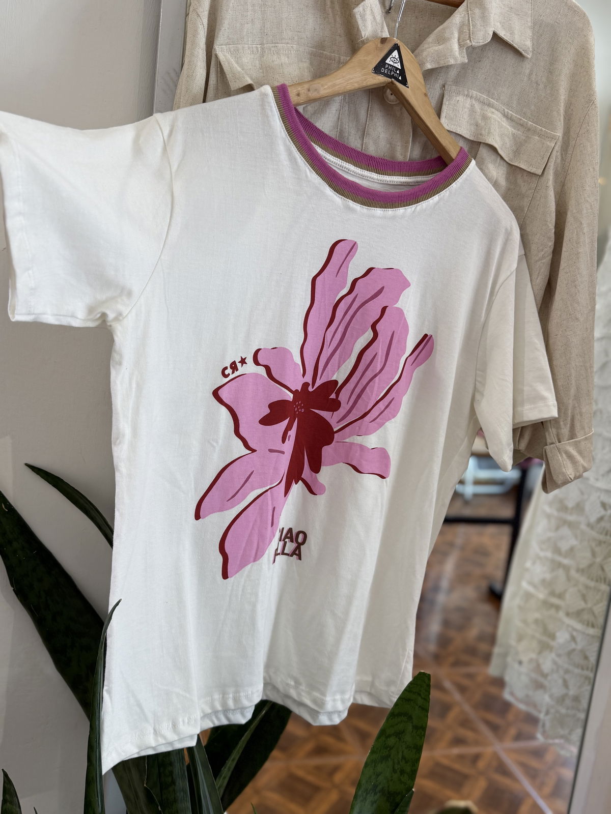 Remera de algodón con estampa al frente, y cuello combinado, divinas !