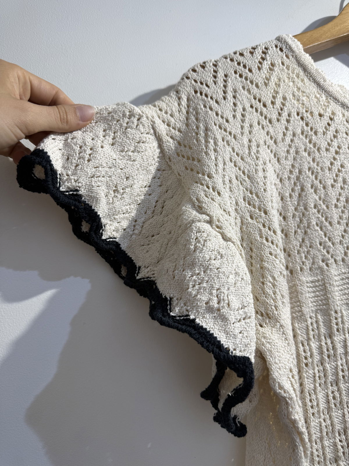 Hermoso modelo en manga corta de hilo calado con manguitas con volado, terminaciones con onditas en color negro. Mega divina!