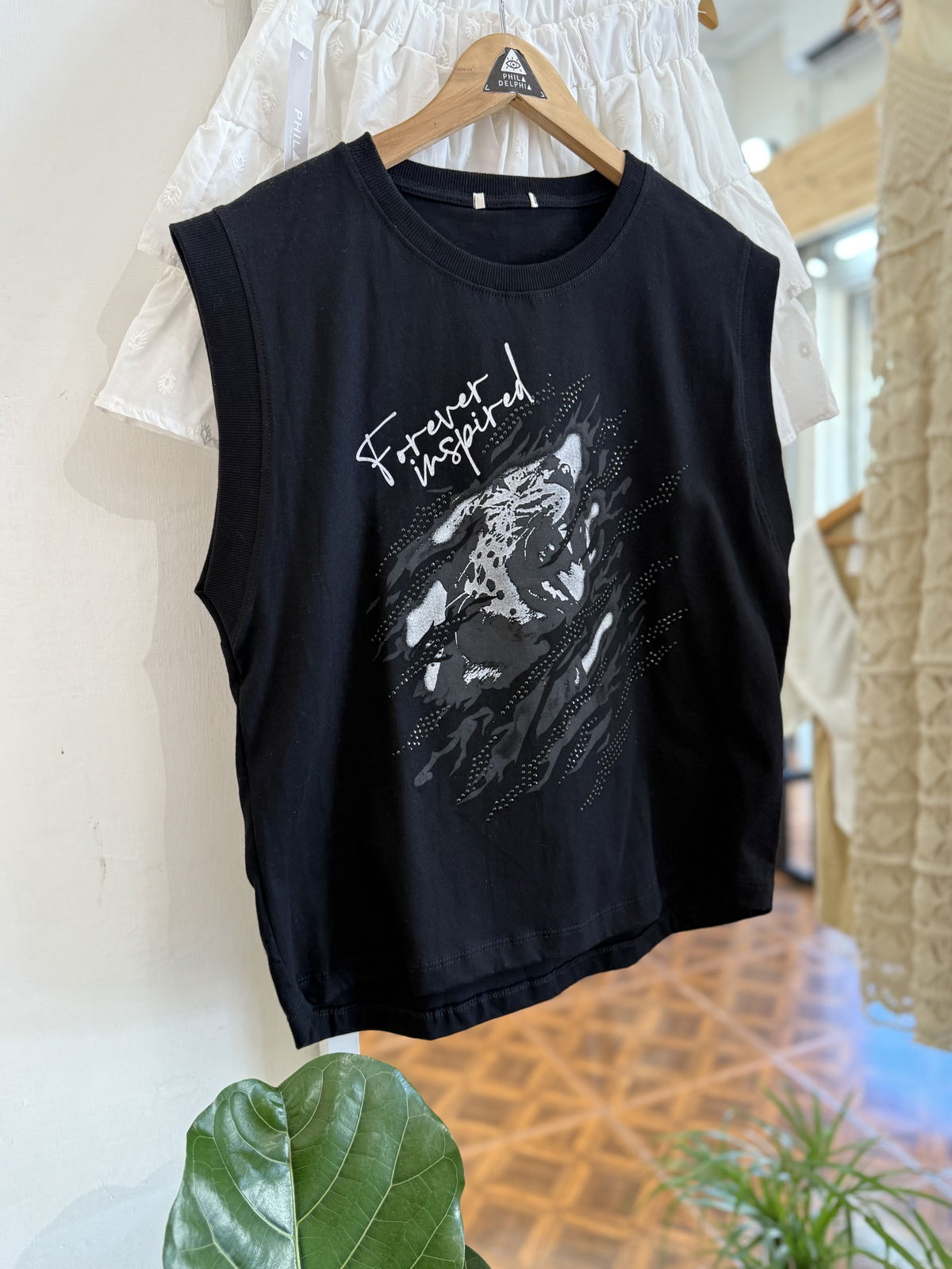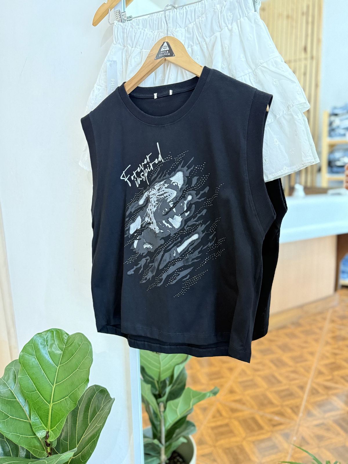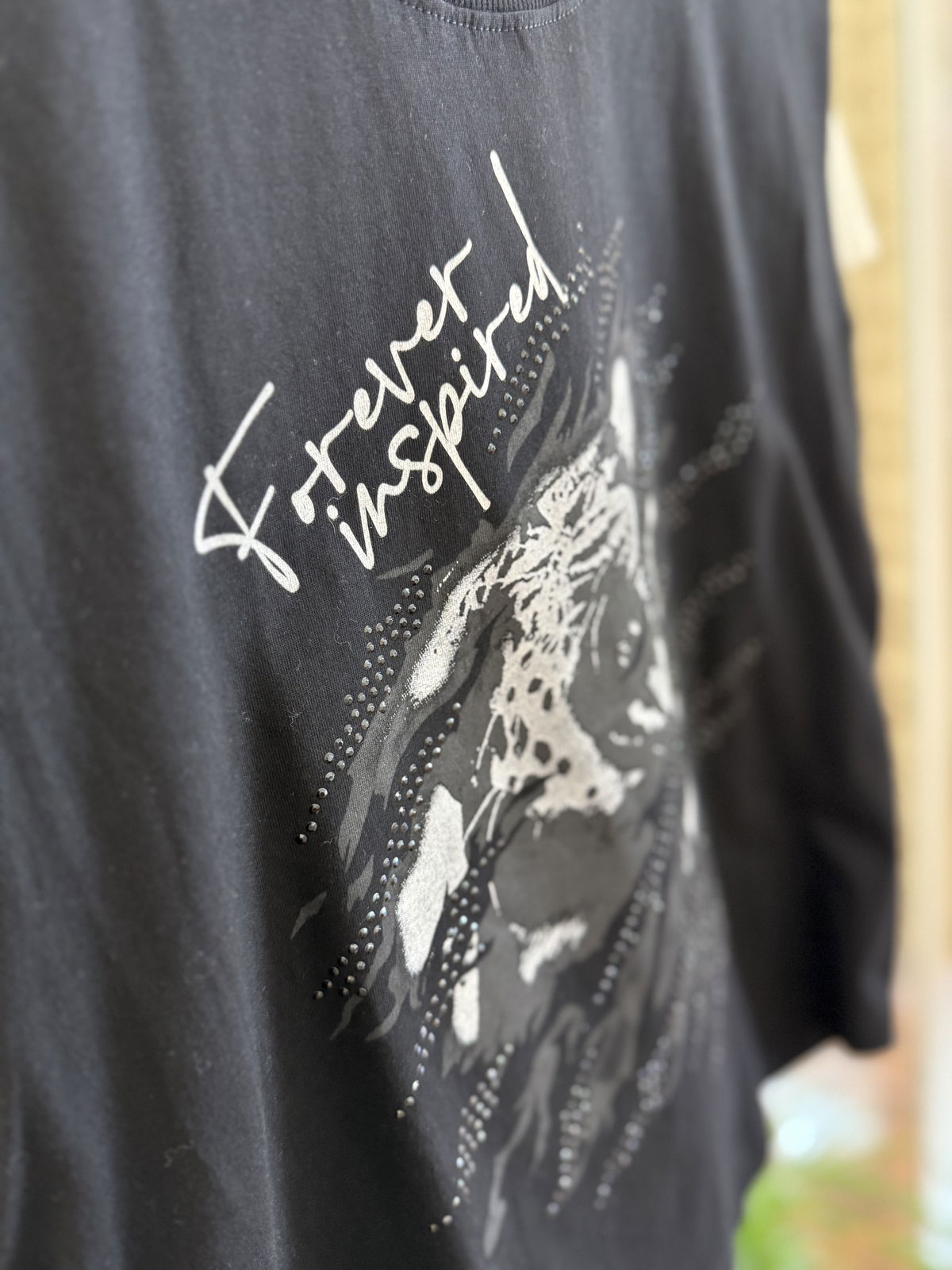 Conestampa al frente y detalles de inscrustes con brillos, mega canchera.