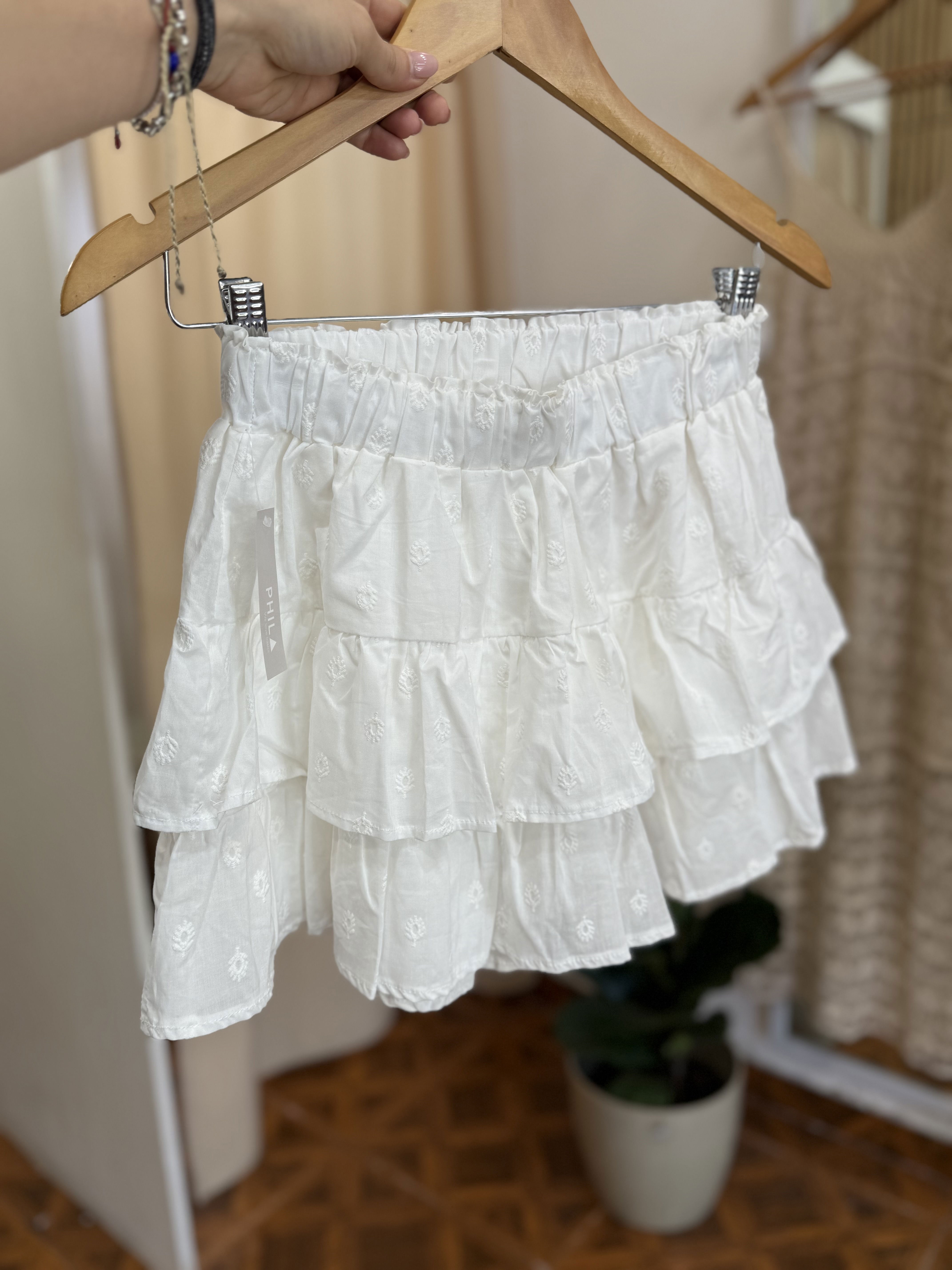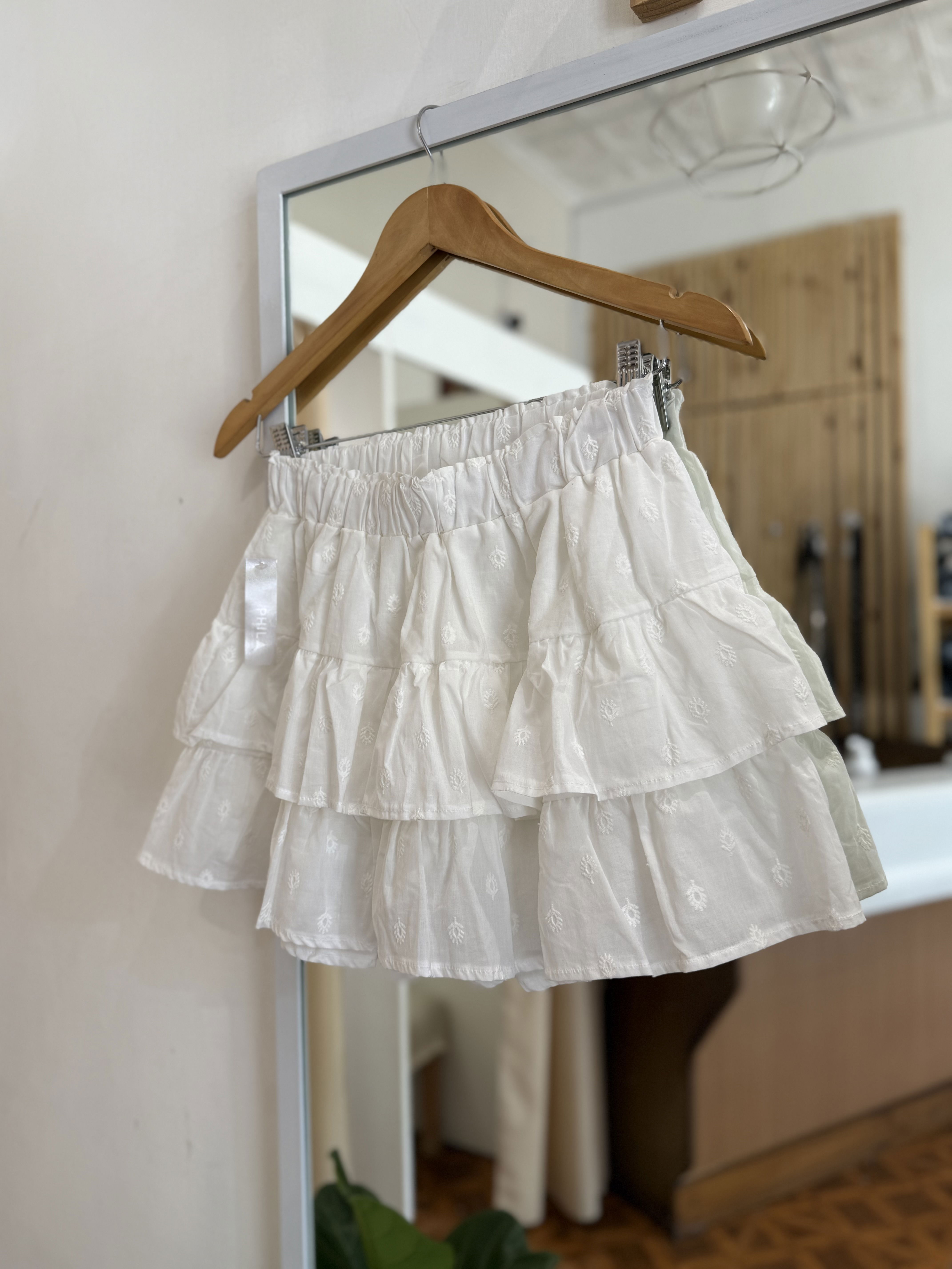 Hermosa mini de lino con short debajo ideal para estar cómoda y segura siempre, con volados y detalles de broderie.
