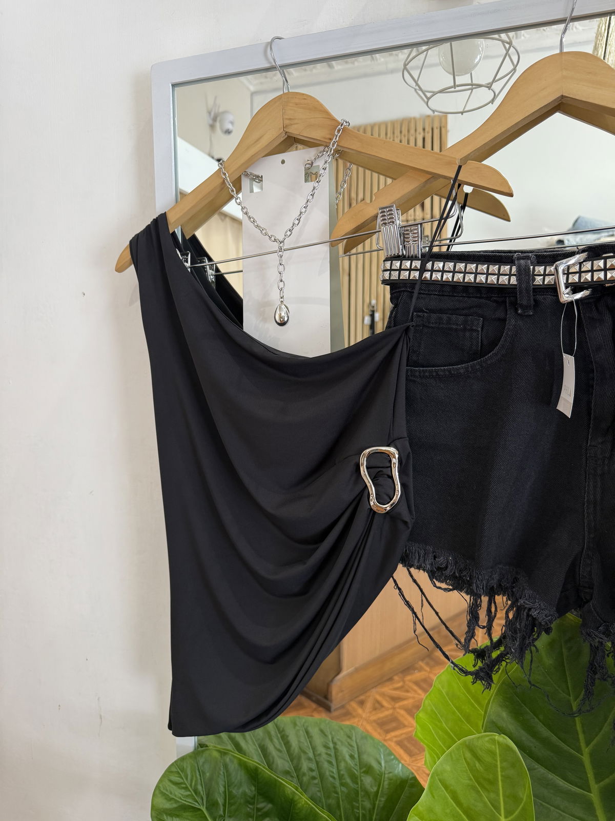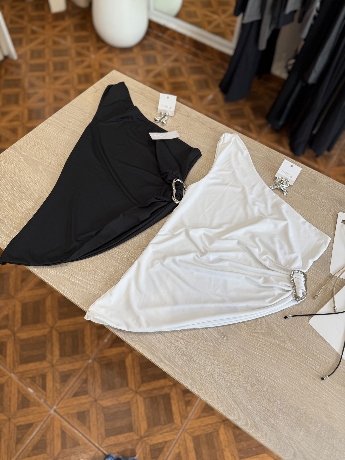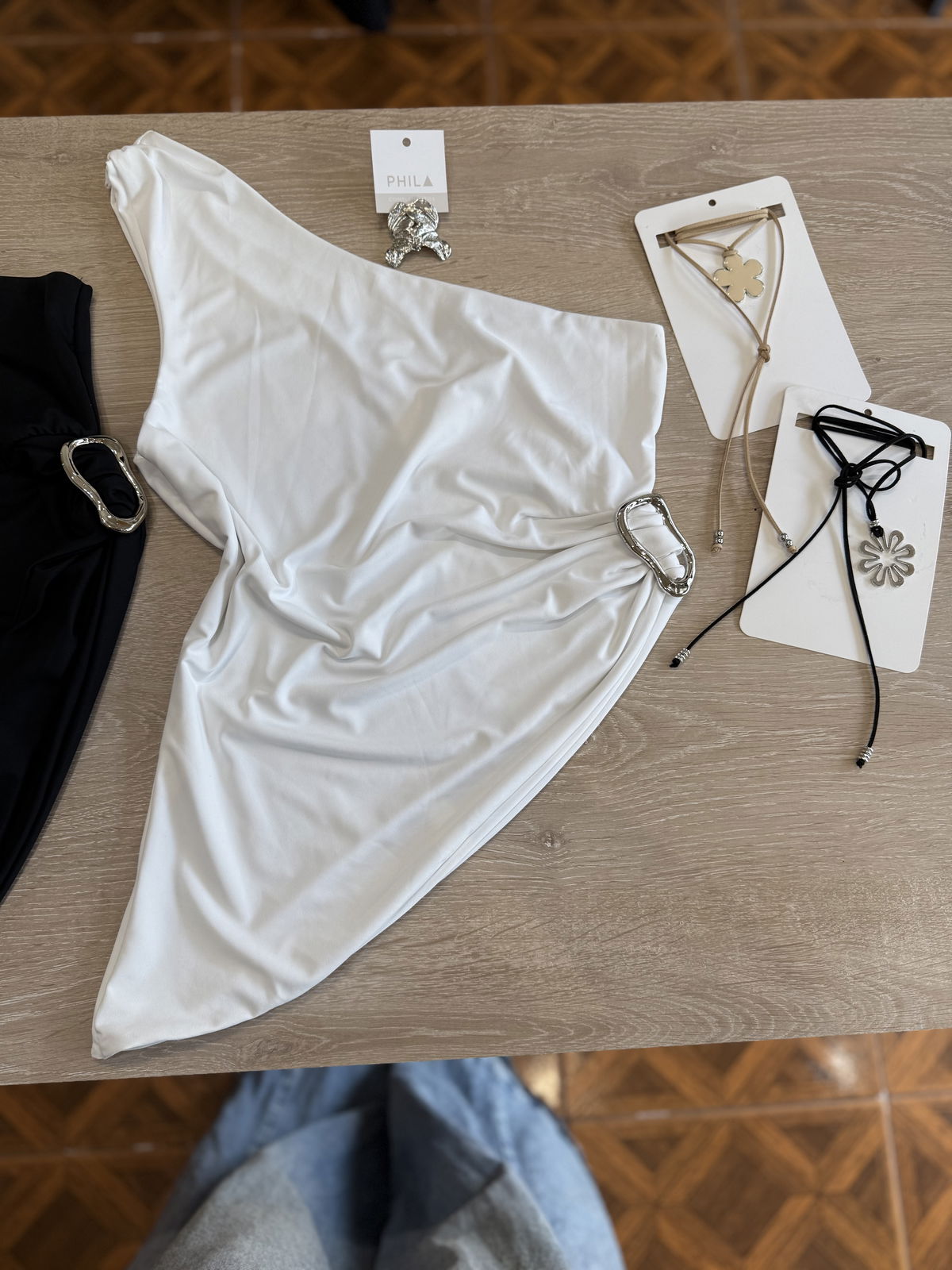 Remera a un hombro, de microfibra con broche plateado al costado divina!