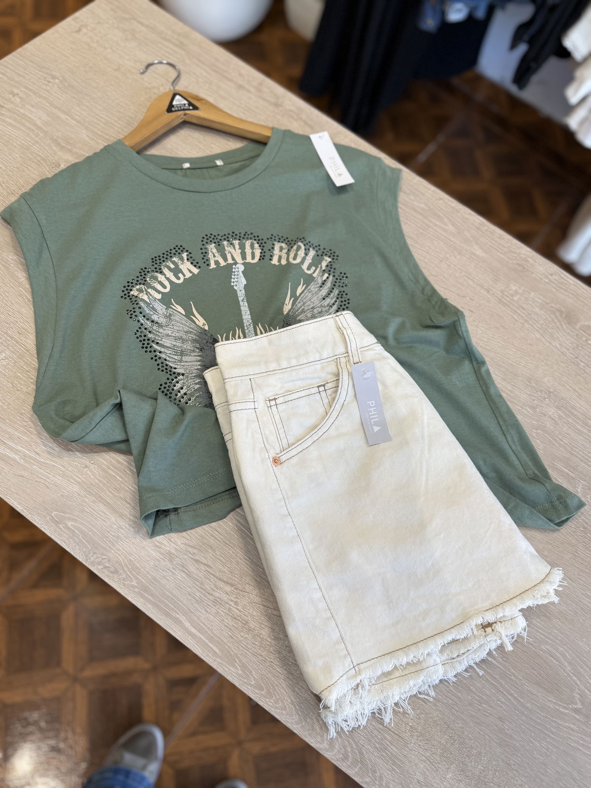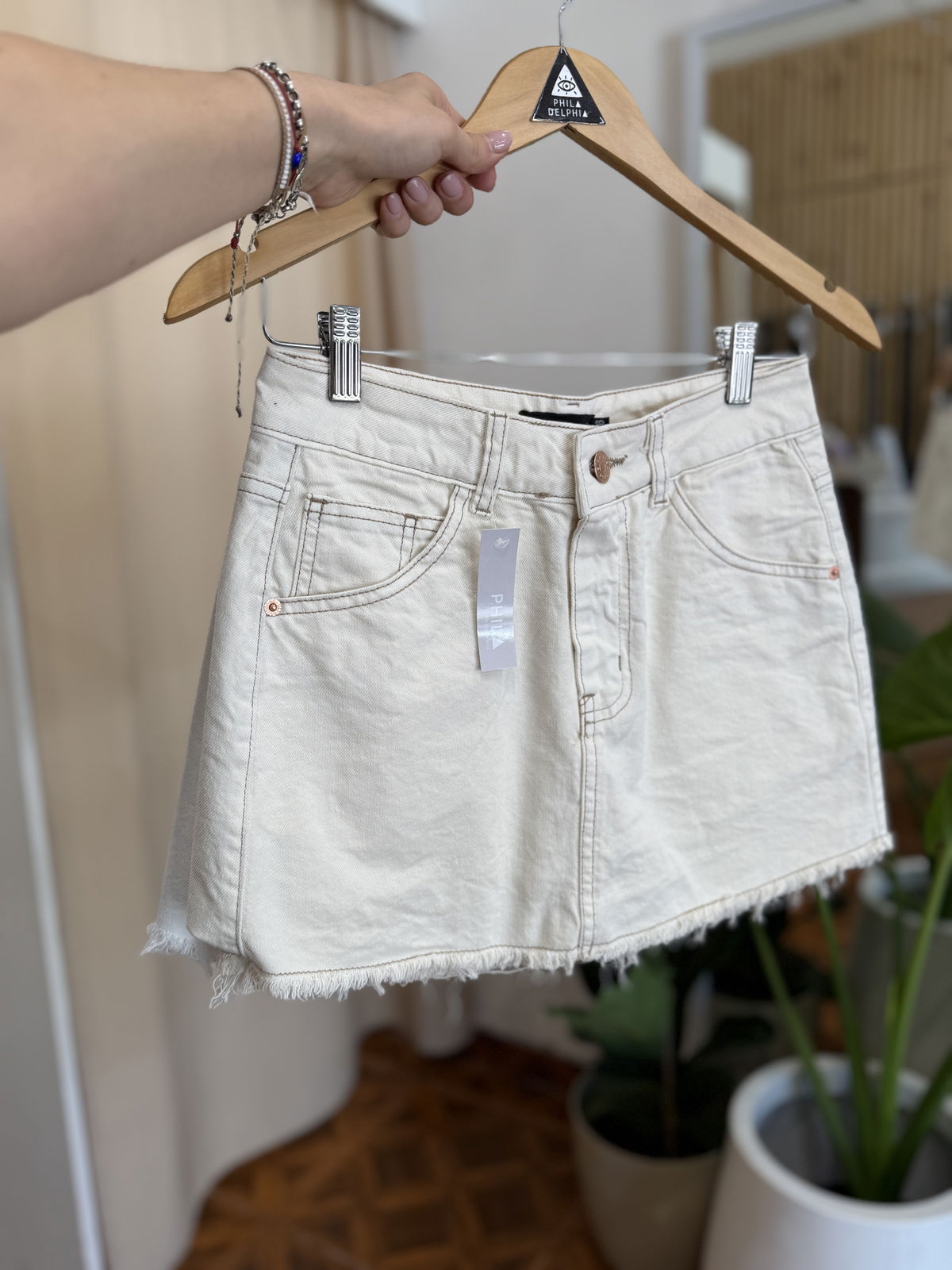 Hermoso modelo Rigido de pollera con short debajo, en jean color nude.