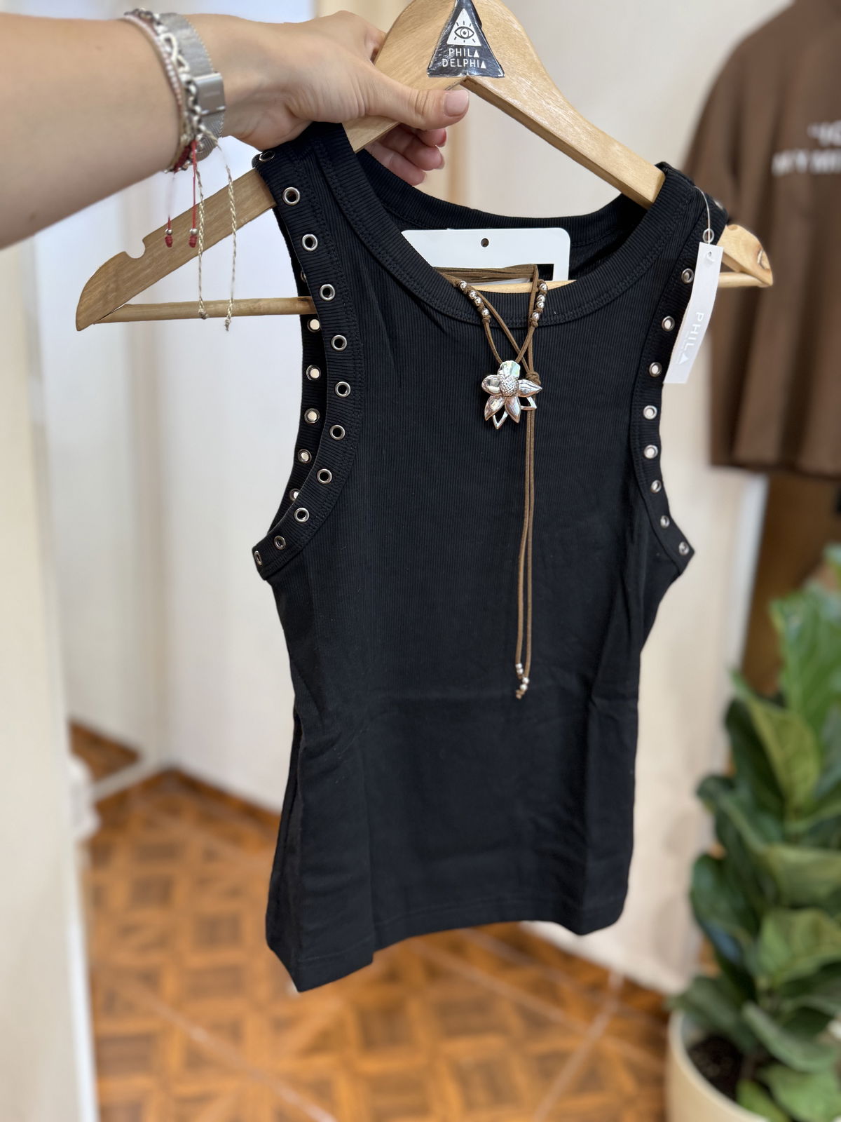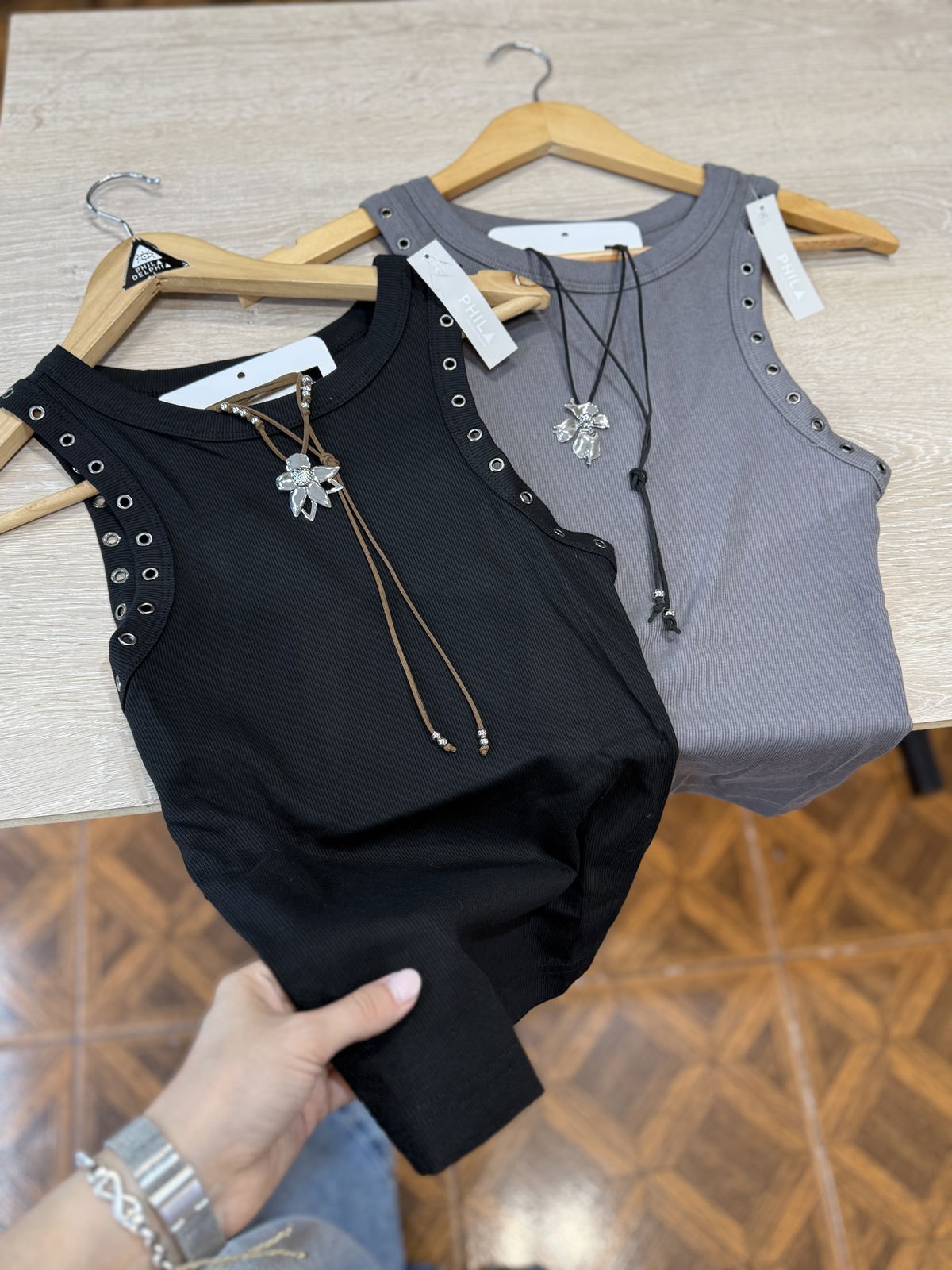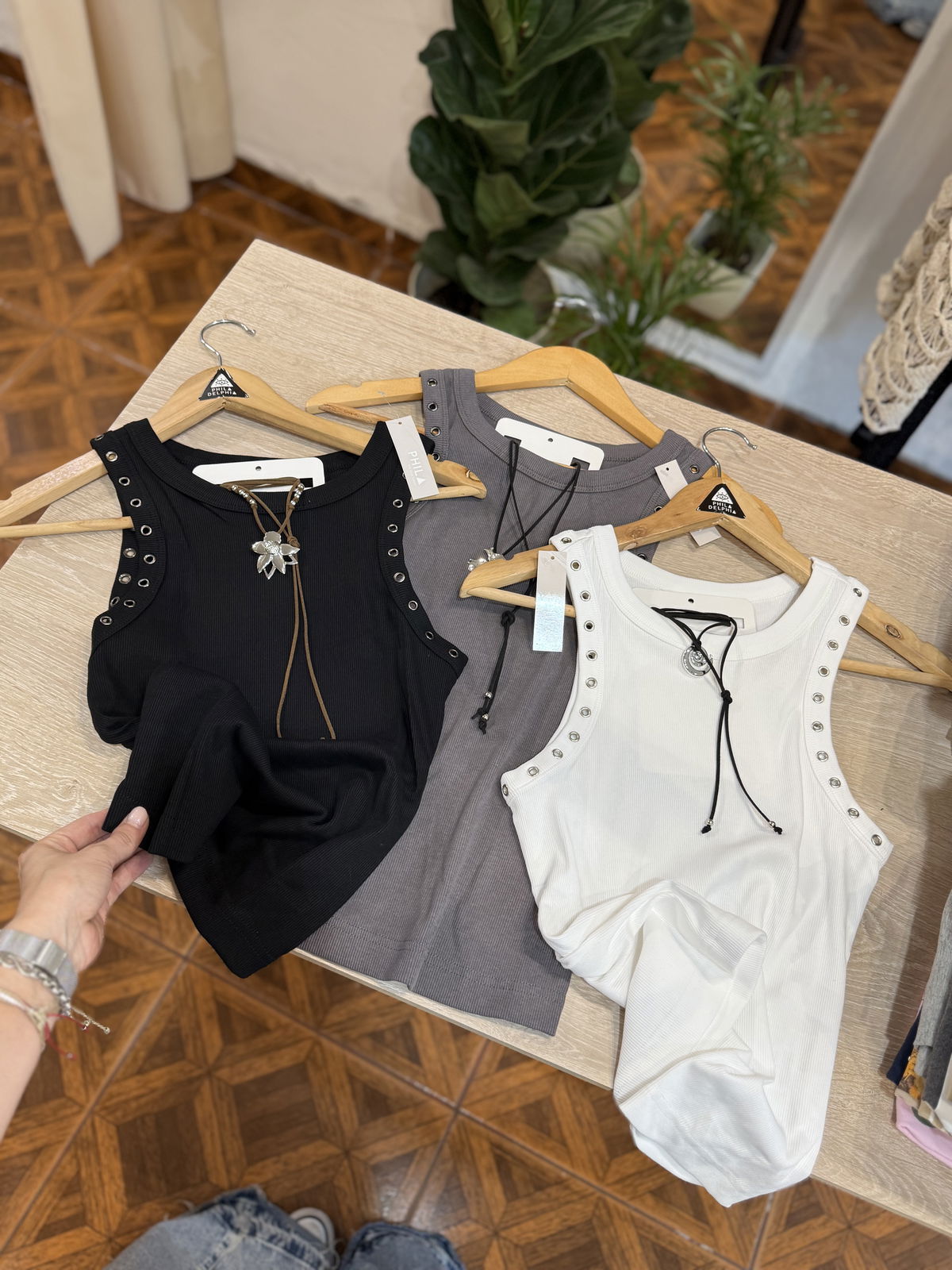 Remera de morley premium, con detalles de arandelas en las terminaciones.