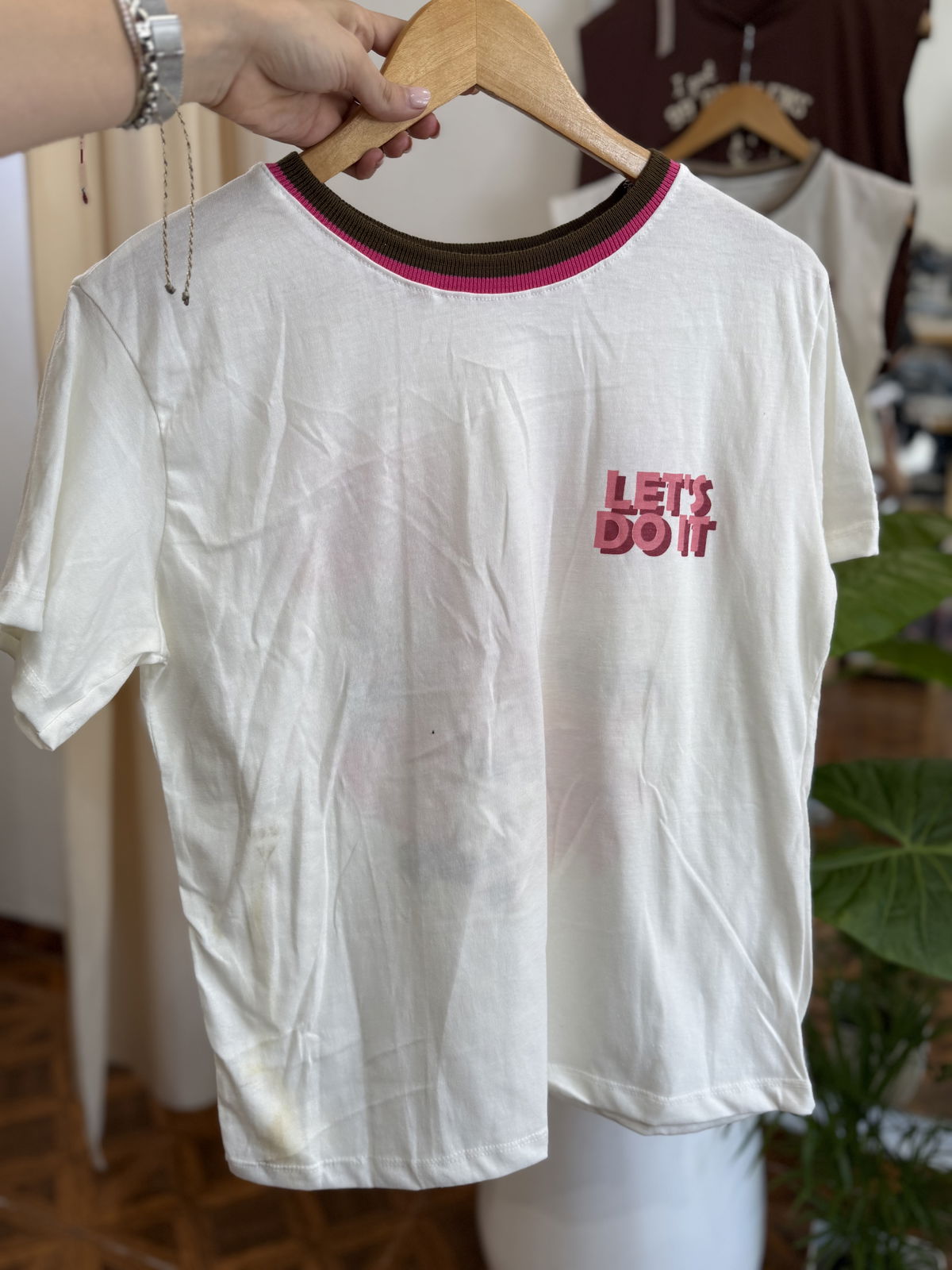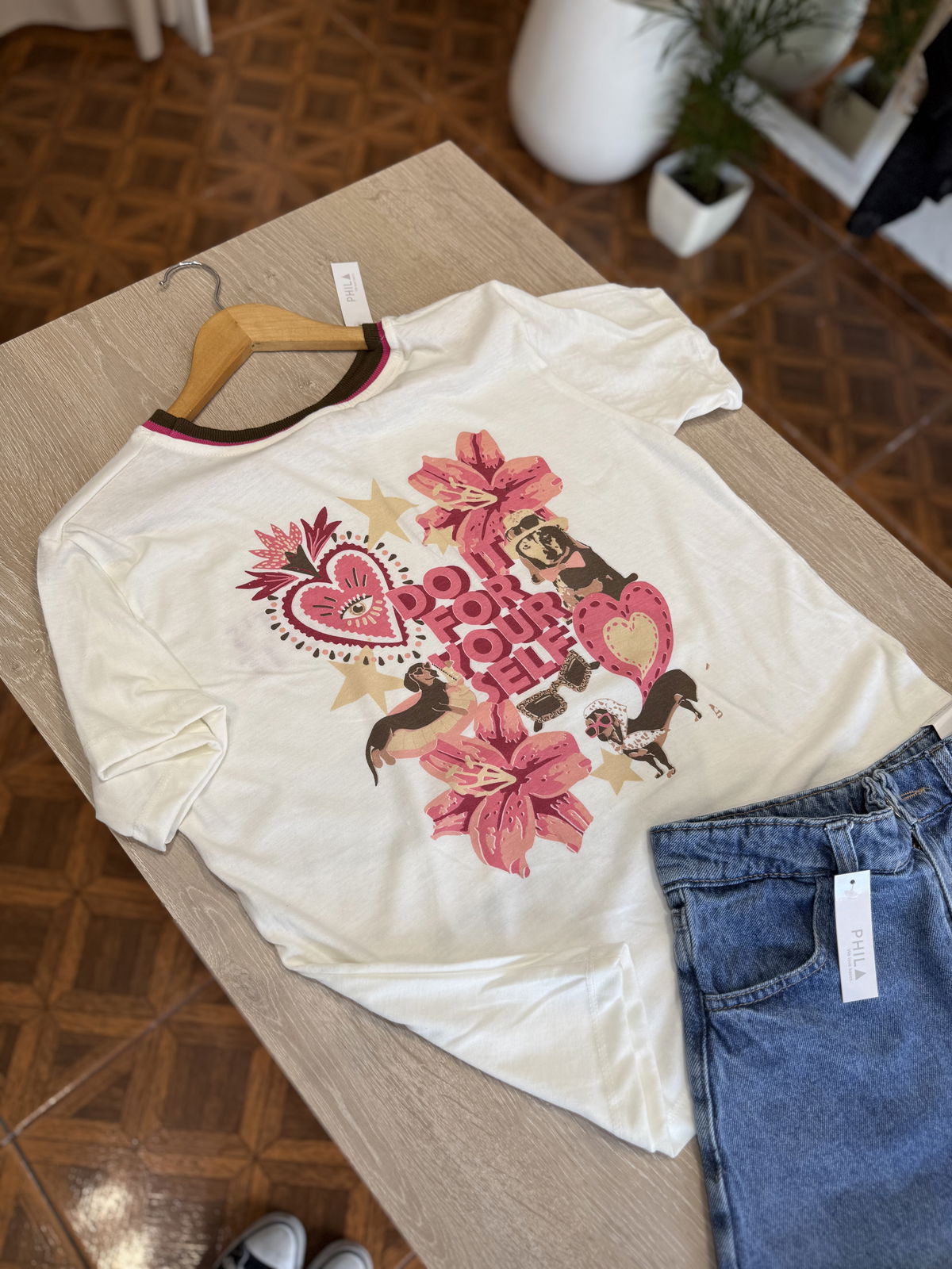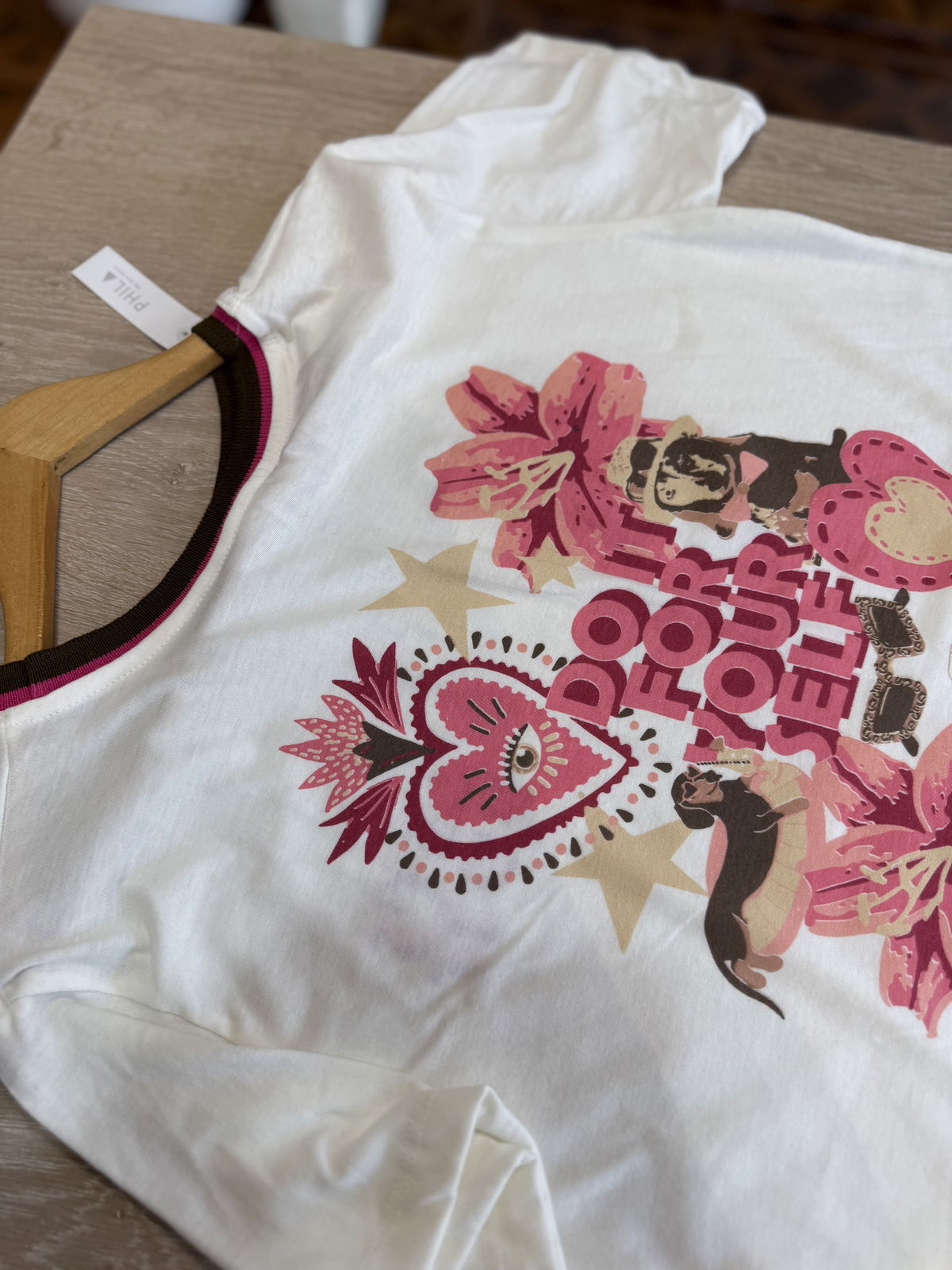 Hermosa remera de algodon, con estampa pequeña al frente y full en espalda.