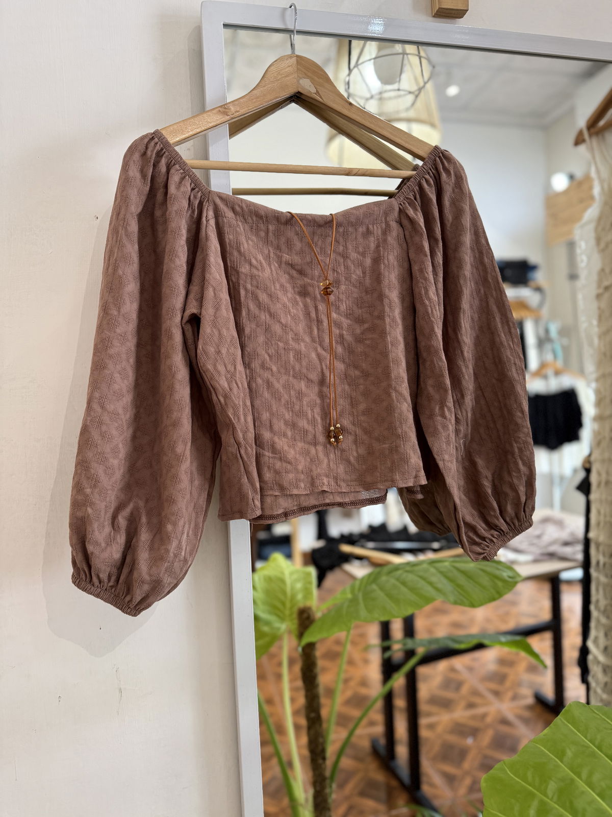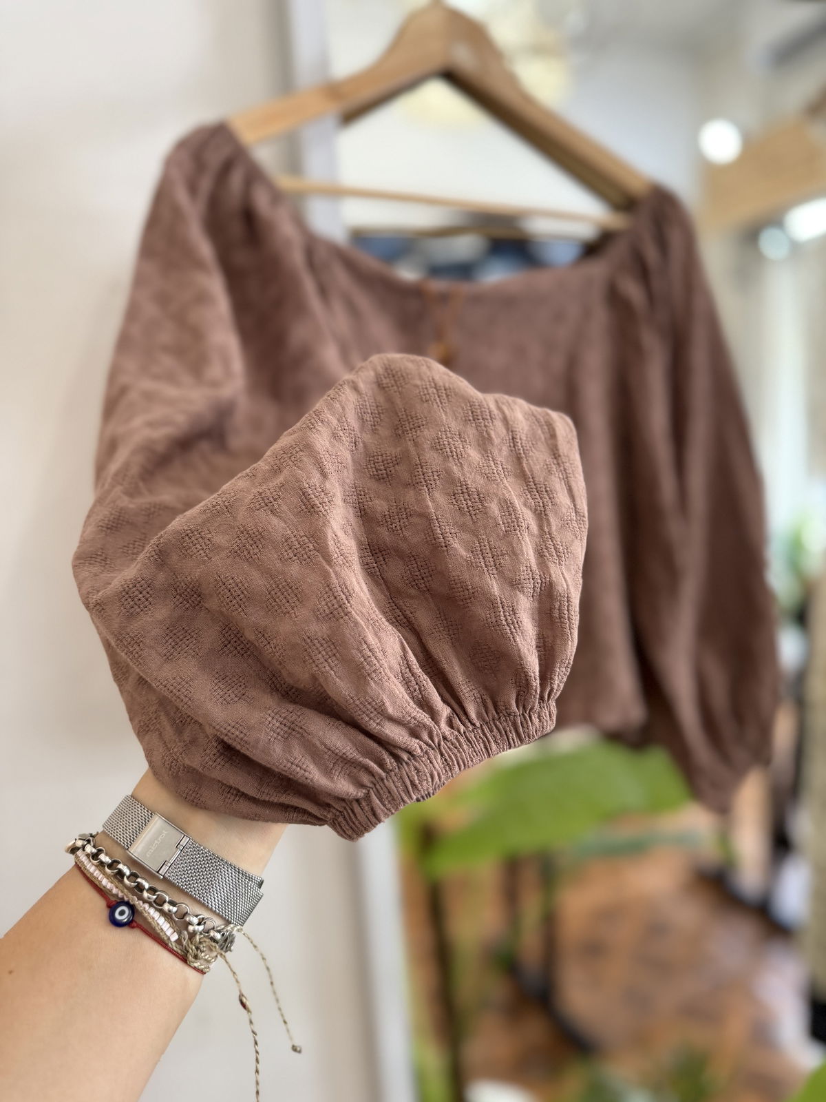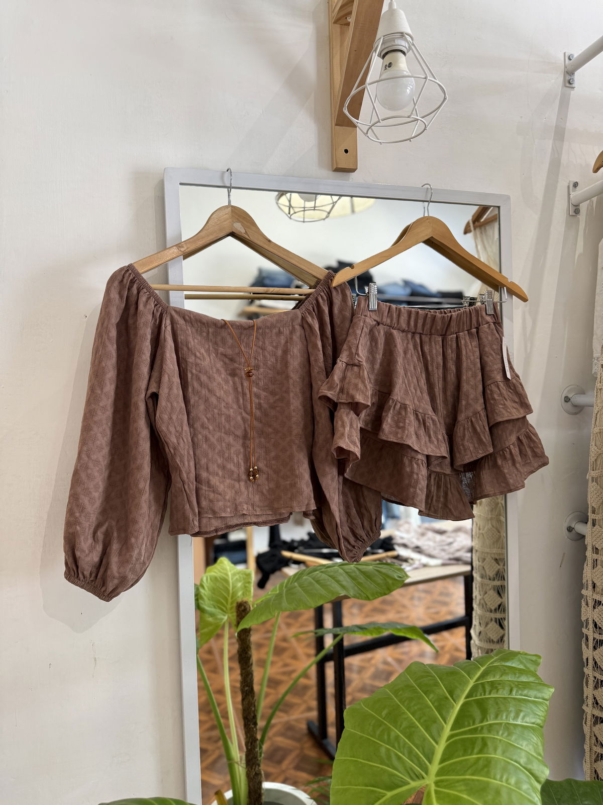 Hermoso conjunto de lino texturado que consta de blusa con corte romantico, manguita globo y elastico en las muñecas, corte cuadrado; y una skort - pollera short - con elastico en la cintura, haciendo juego.