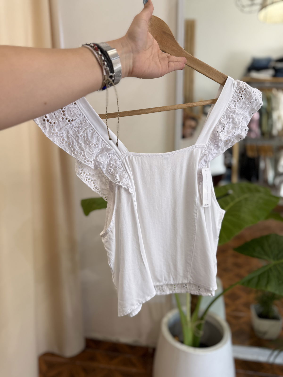 Blusa romántica, combinada con broderie, con pequeños volados en manguitas. Divina.