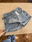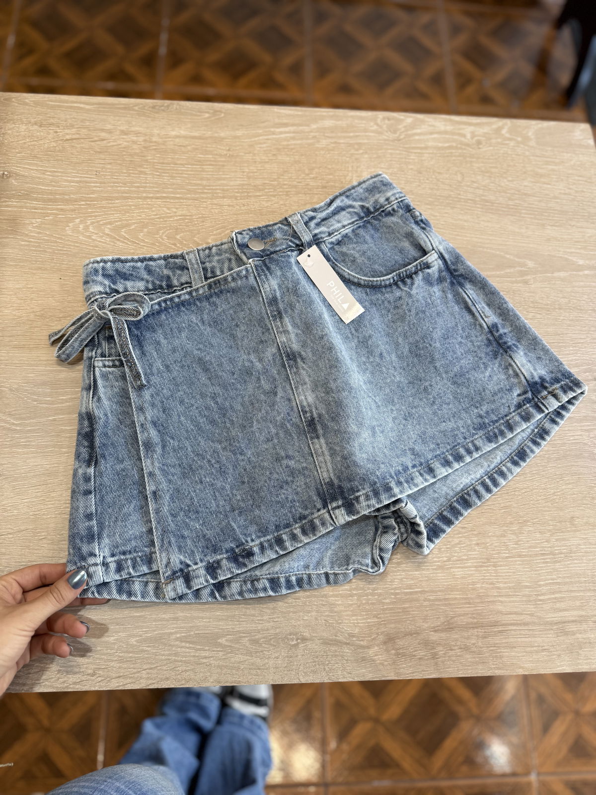 Pollera short de jean, cruzada al frente. Se ve como mini en el frente y short en el reverso.