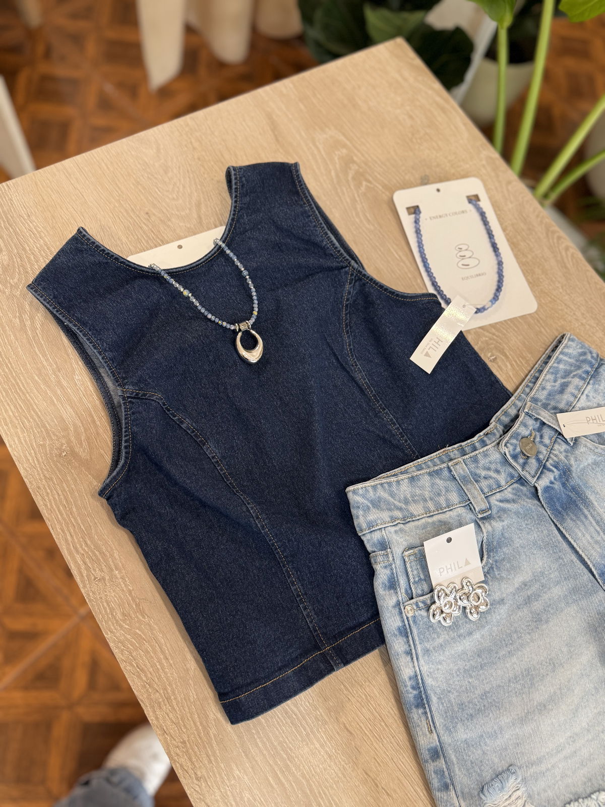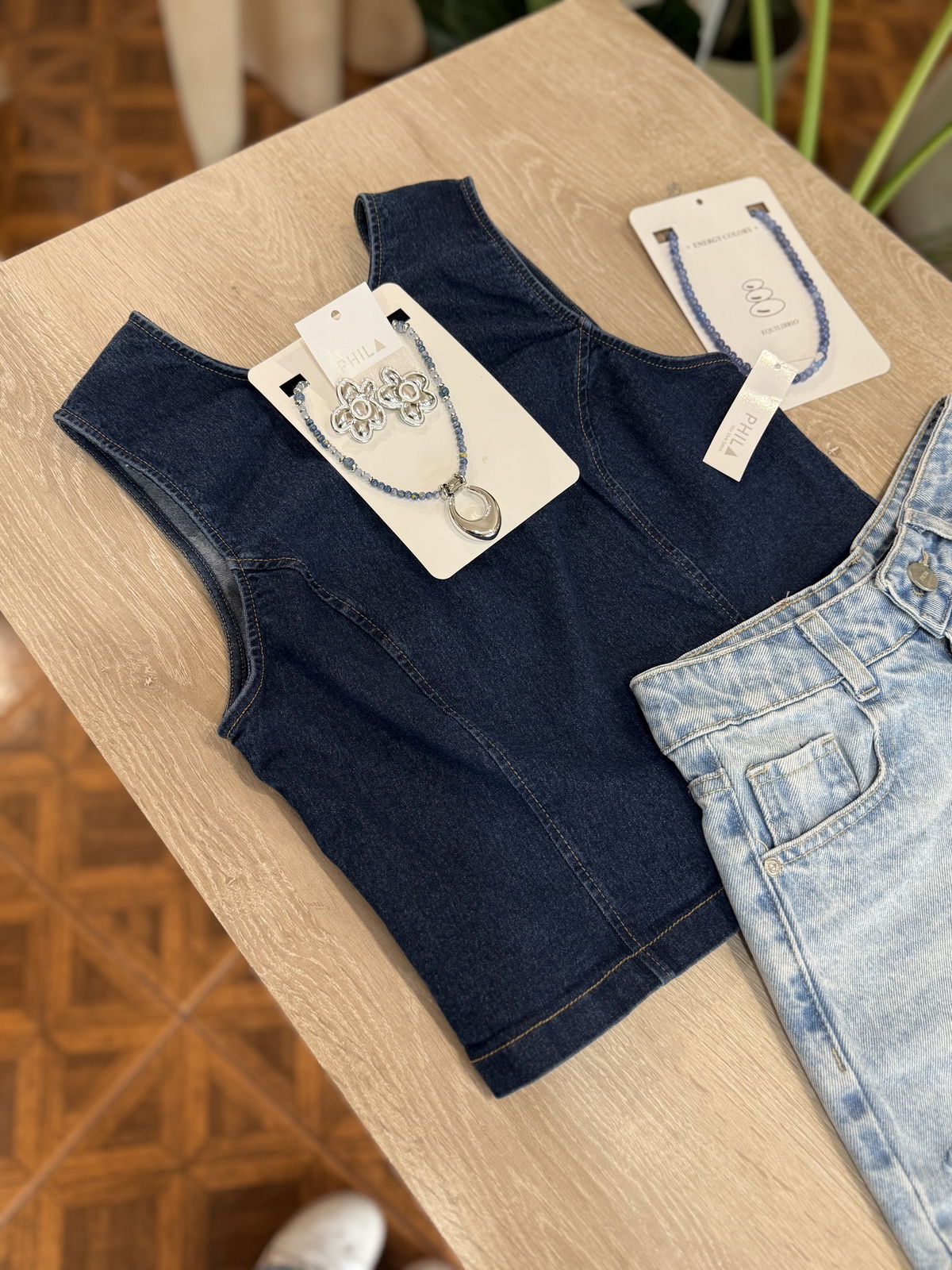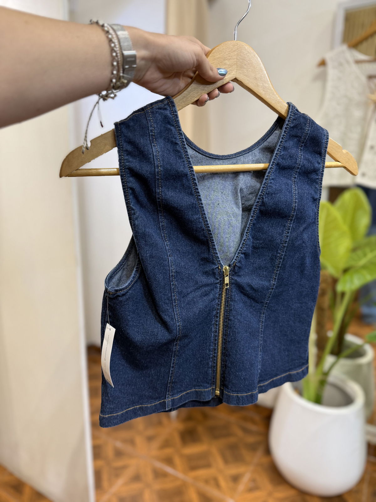 Hermosa musculosa de jean oscuro, elastizado. Posee corte de musculosa y cierre en la espalda.