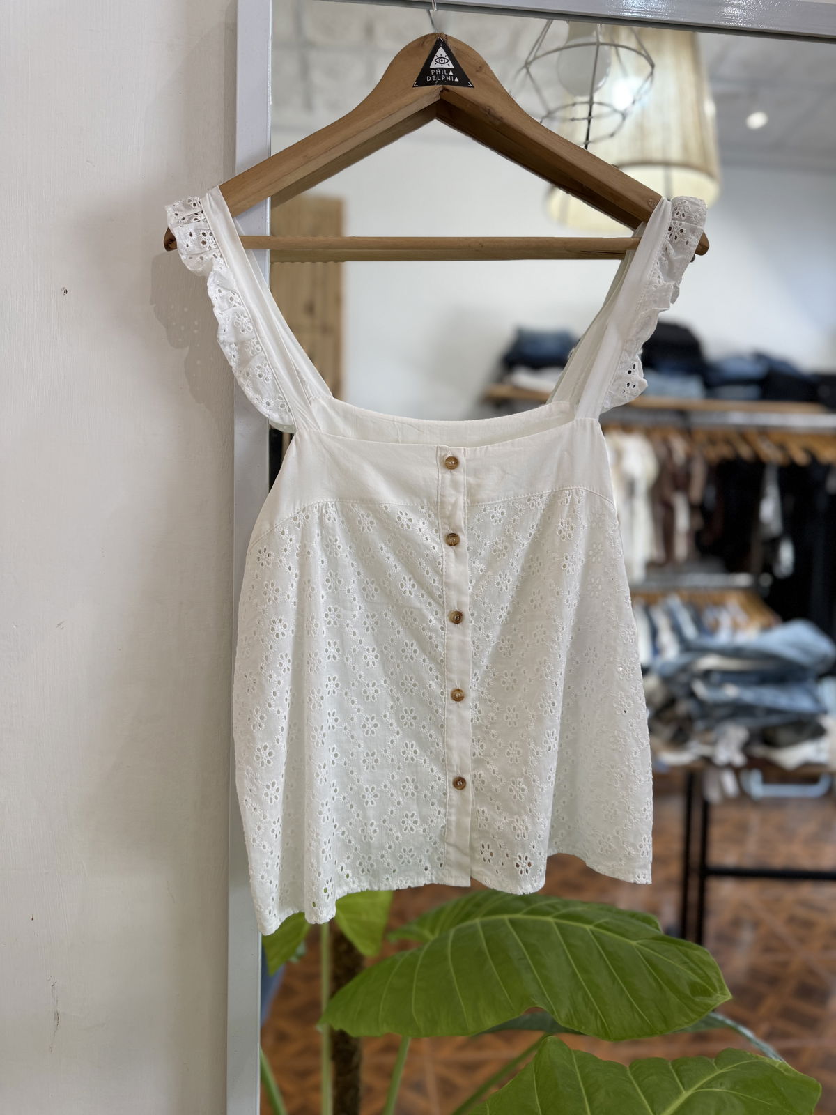 Blusa romántica, combinada con broderie, con pequeños volados en manguitas, y botones al frente