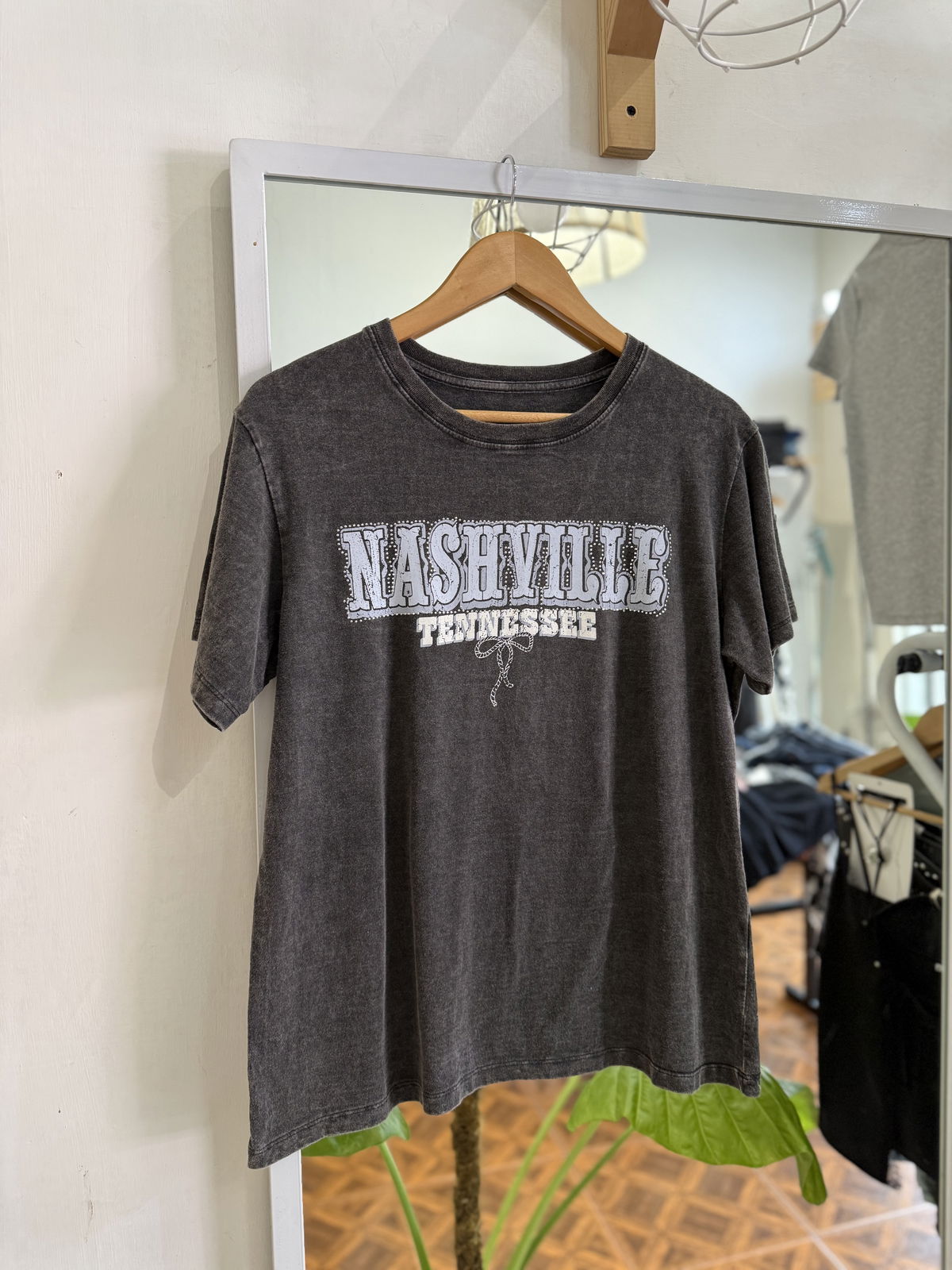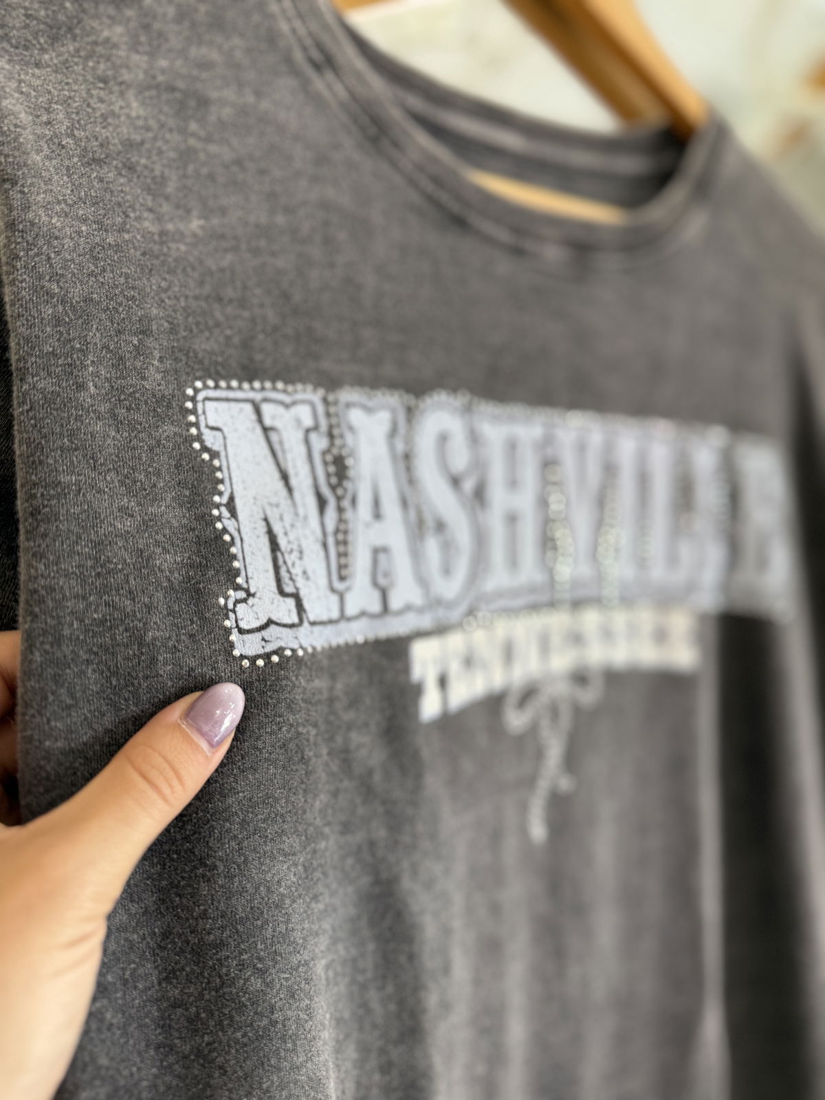 Remera Lavada con estampa al frente y detalles de brillos, mega preciosa.