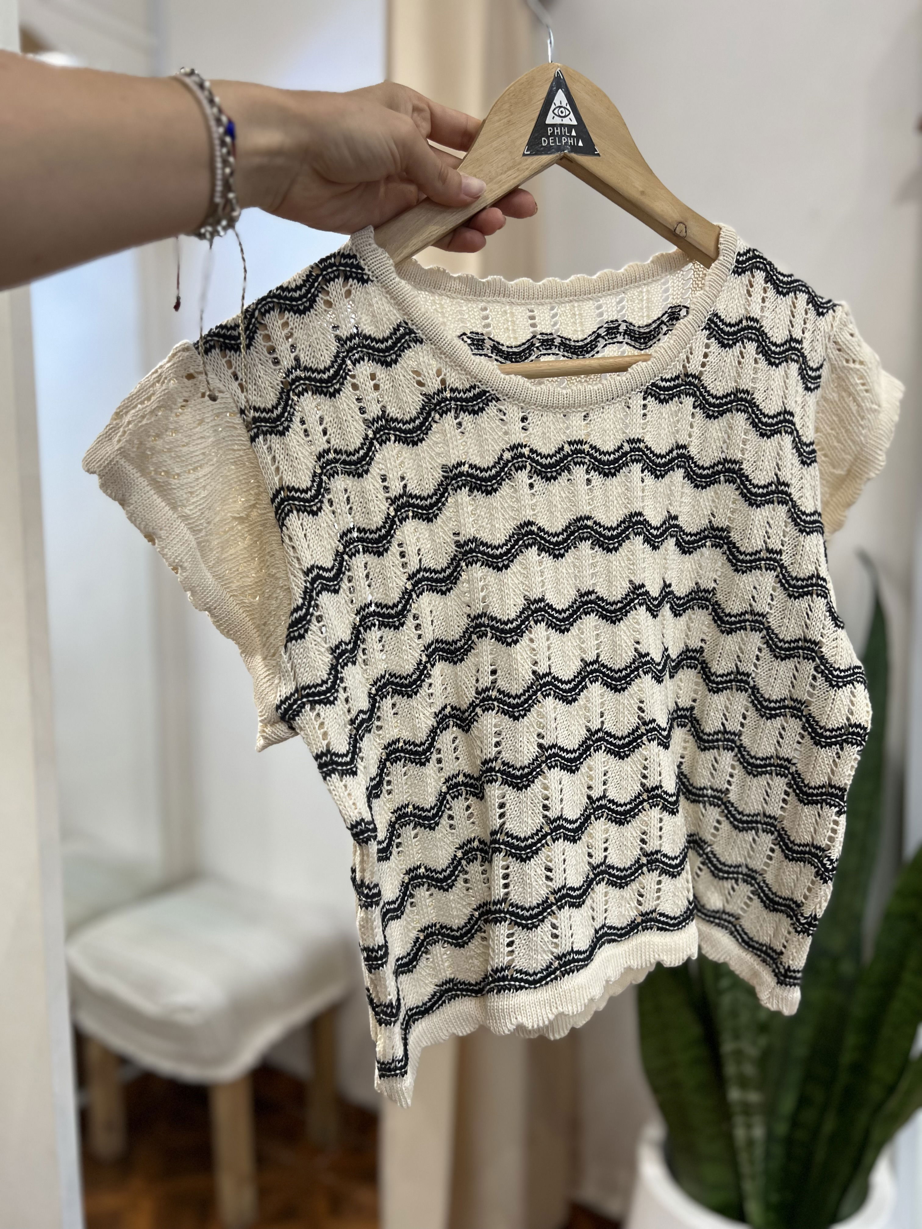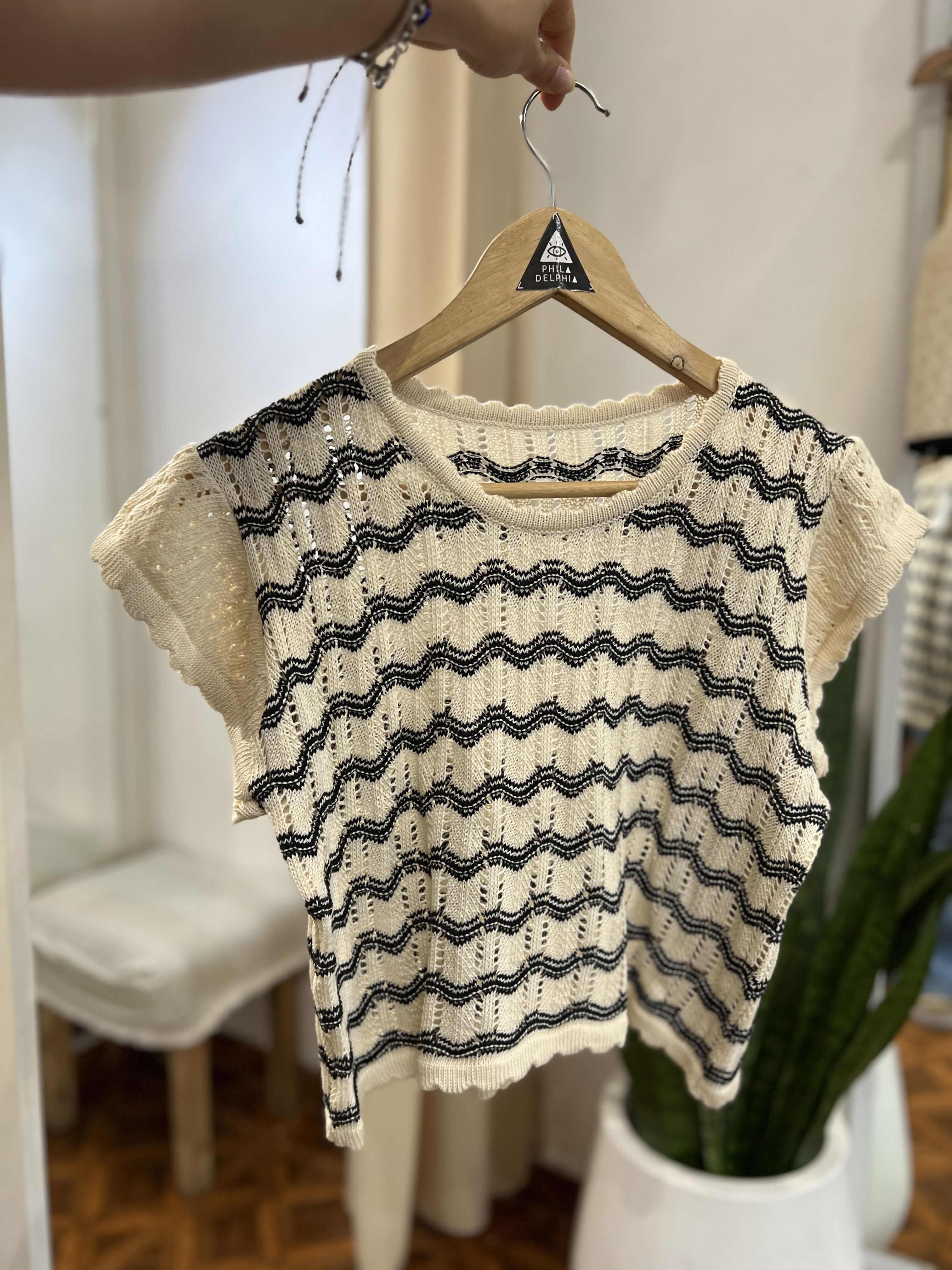 Hermoso modelo en manga corta rayada de hilo, con mangas con volado, combinacion en color natural y negro.